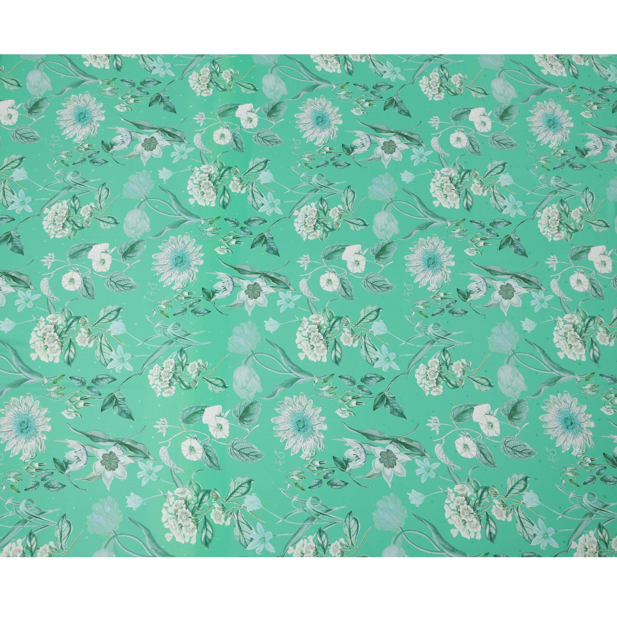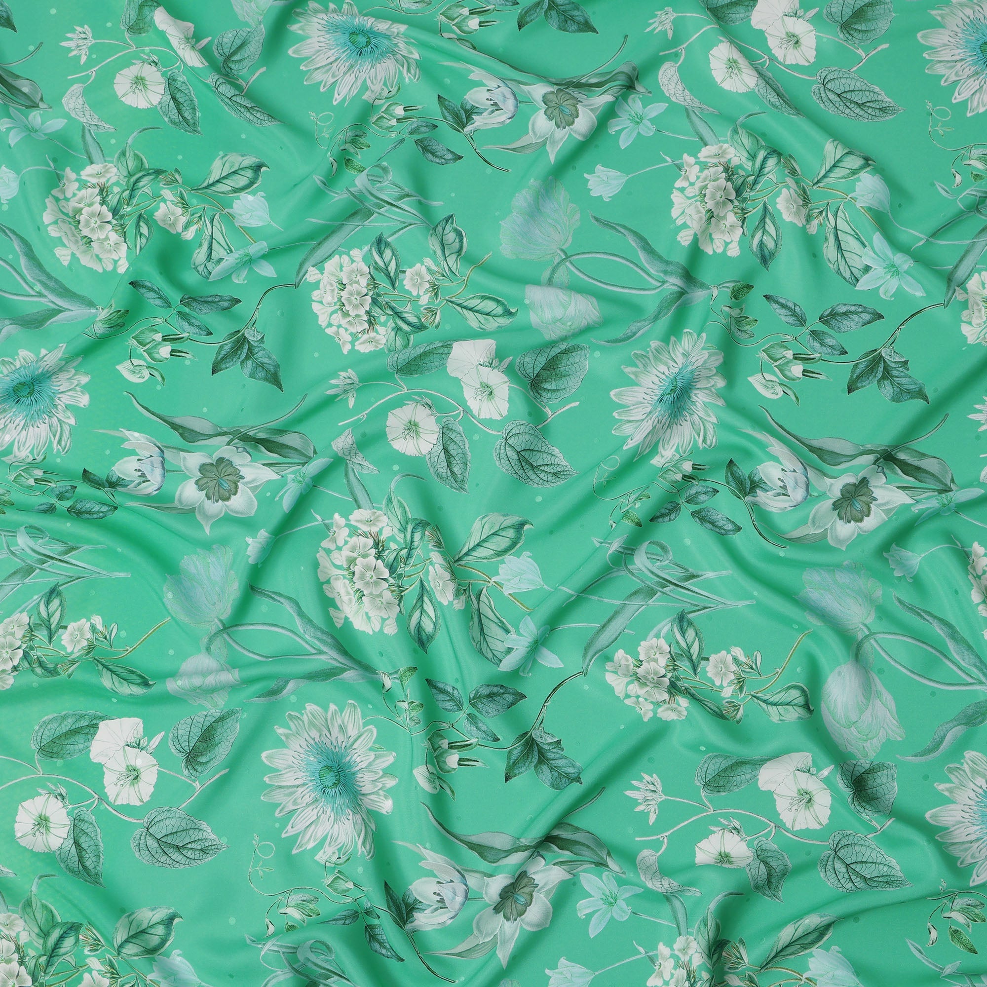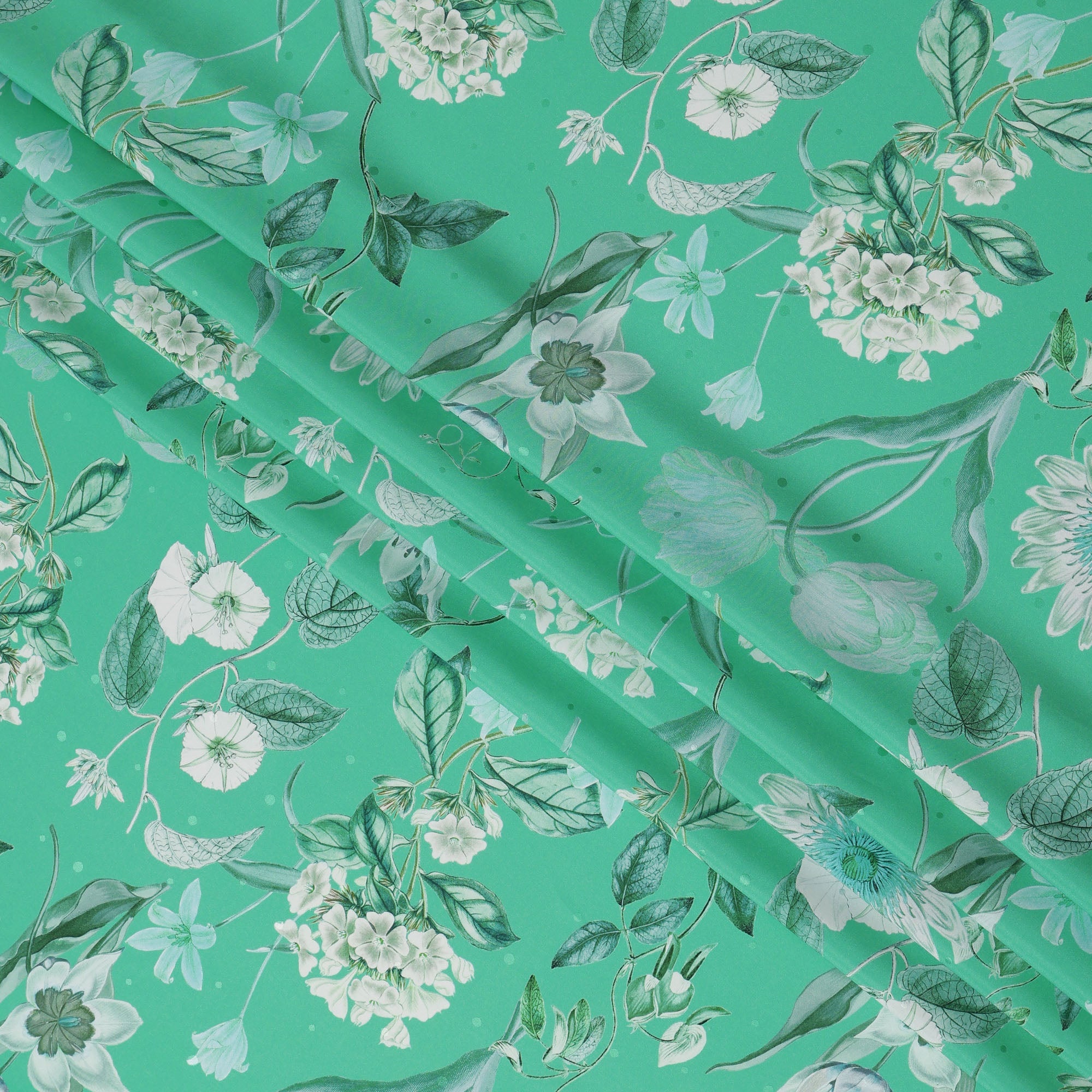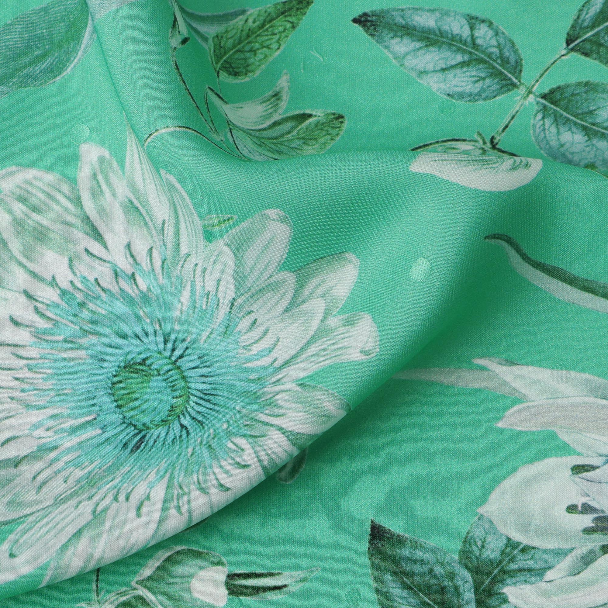 قماش حرير ساتان إيطالي فاخر بقاعدة خضراء نعناعية مع طبعة زهور نباتية باللونين الأبيض والأزرق المخضر، عرض 140 سم، صنع في إيطاليا - D22994