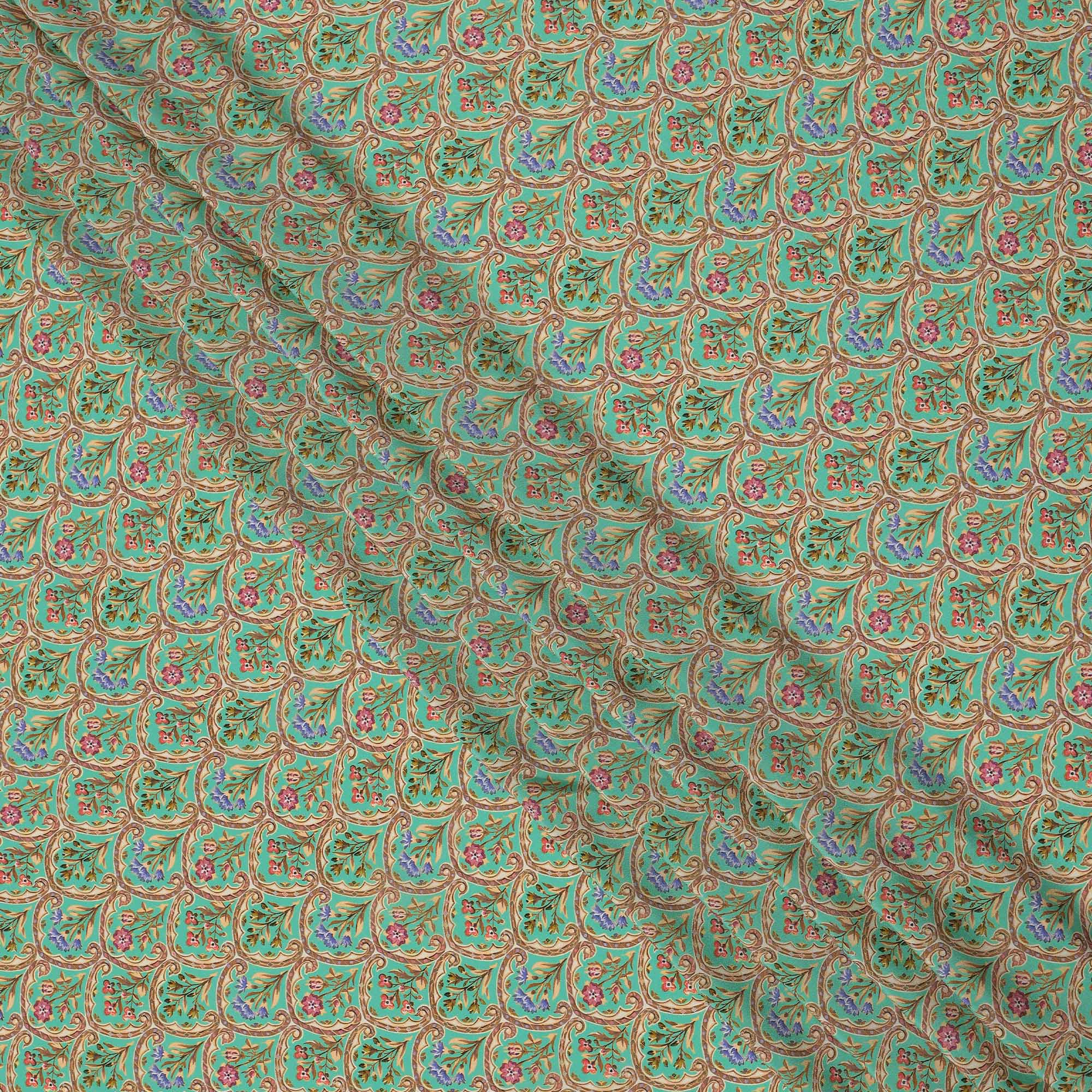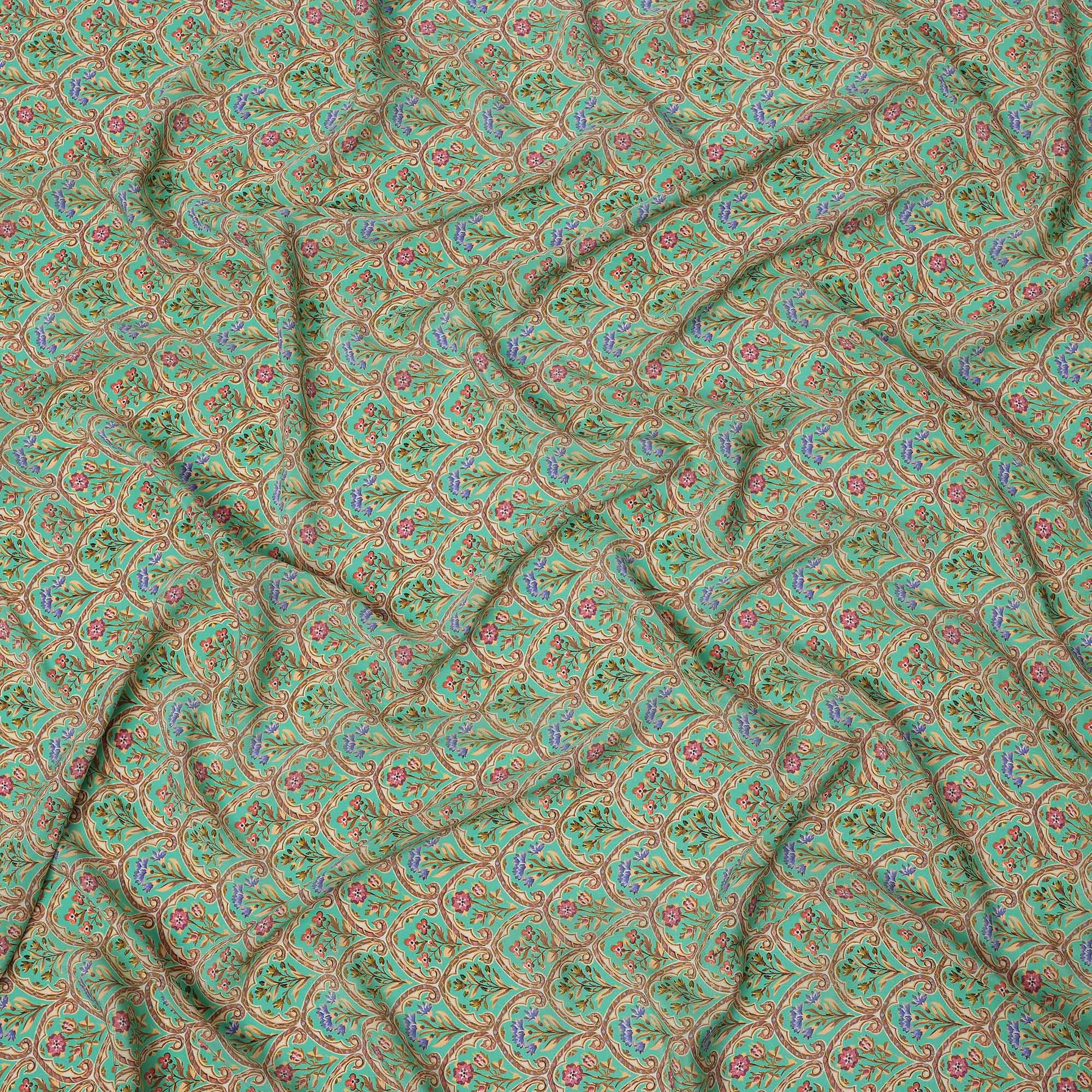 Mint Green Ethnic Motif Printed Premium Pure Silk Crepe Fabric with Intricate Paisley and Floral Design, 110 cms Width, Made in India-D26325
