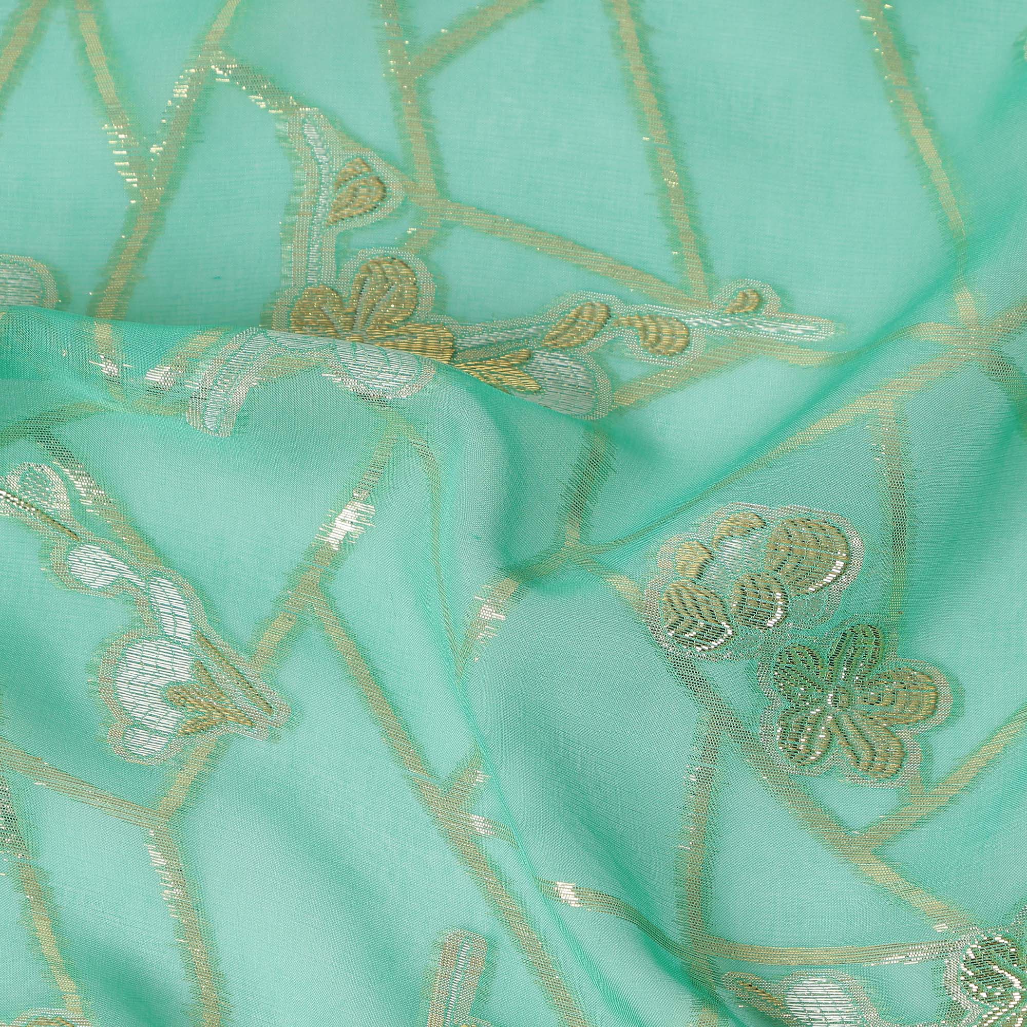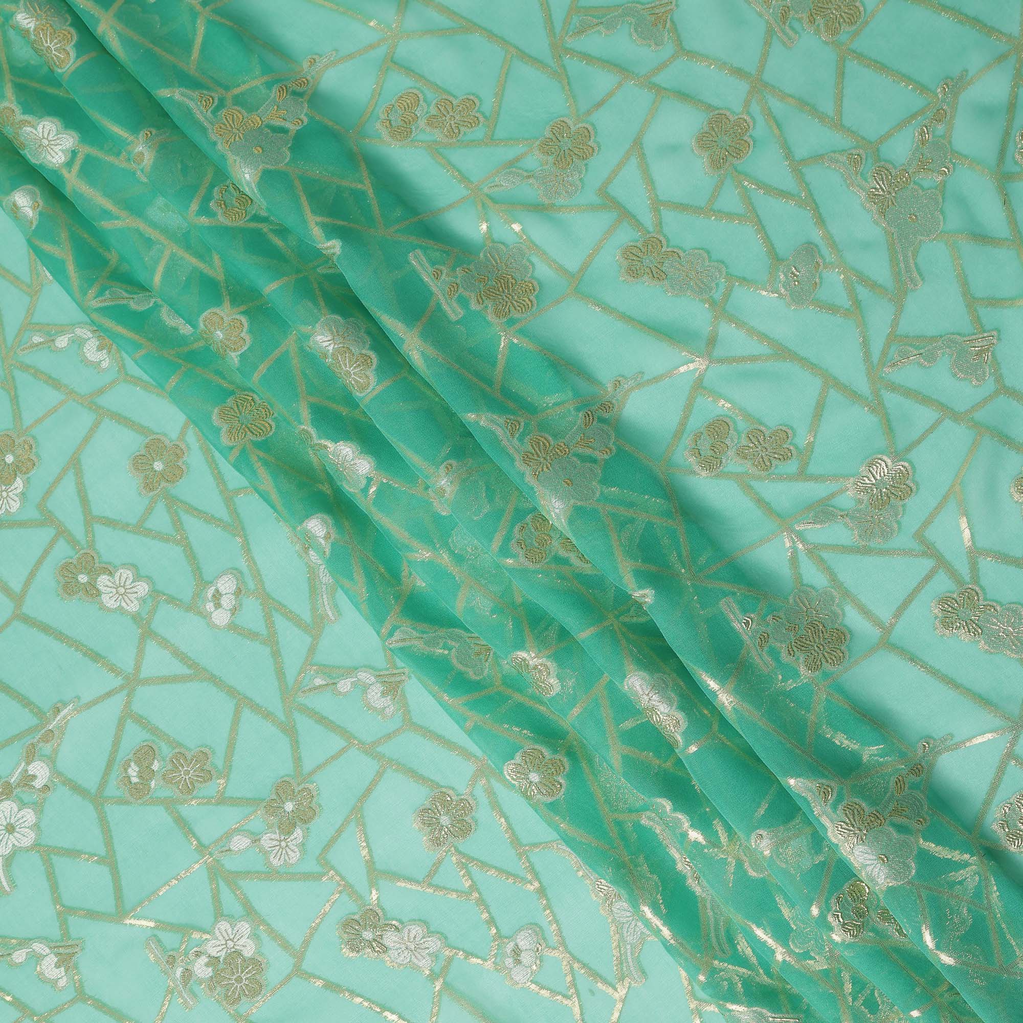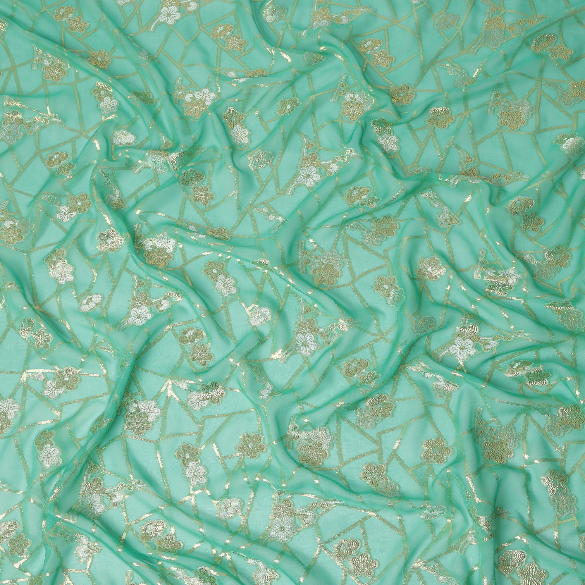 • Mint Green Gold Floral Geometric Metallic Lurex Silk Chiffon Fabric 110 Cms Wide, Made in South Korea-D27542