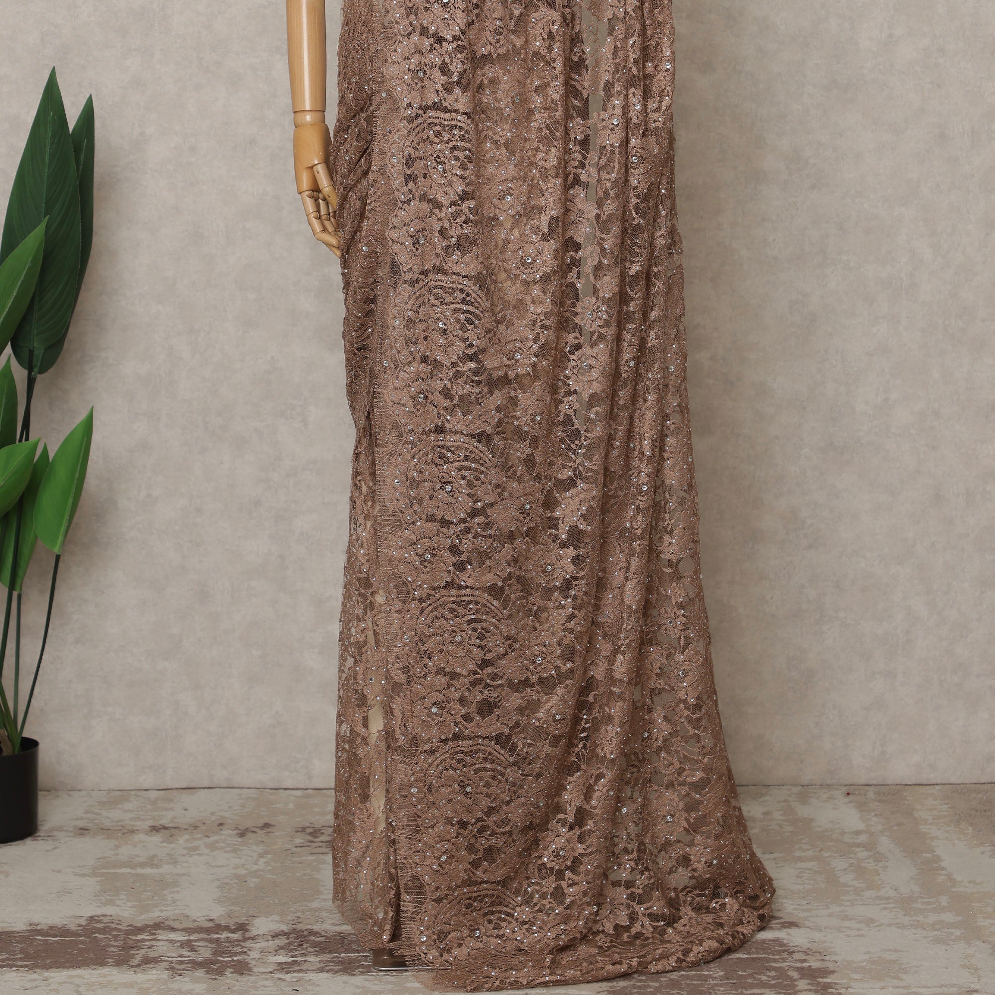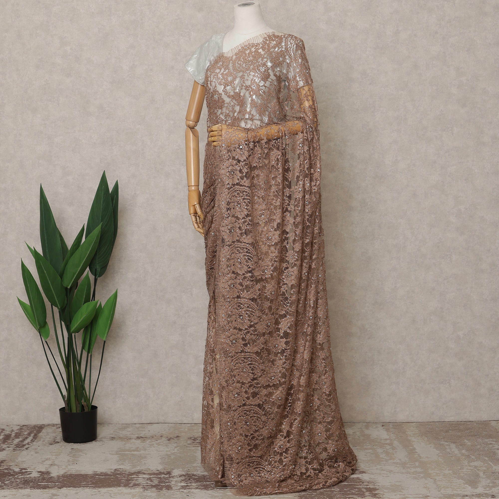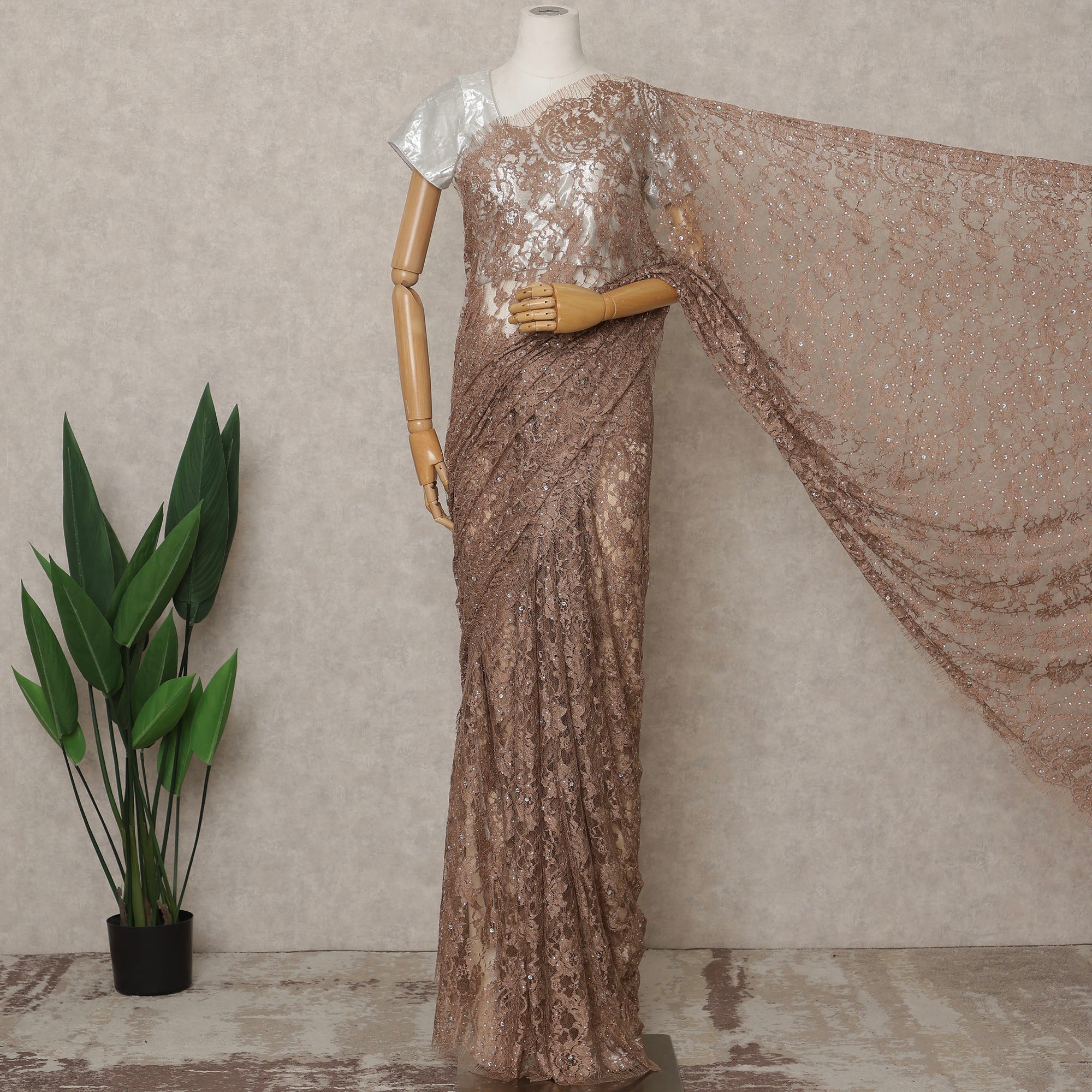 أضف لمسة من الأناقة الراقية إلى خزانة ملابسك مع هذا الساري الفرنسي الفاخر ثنائي اللون من دانتيل شانتيلي باللون البني... اقرأ أكثر اقرأ أكثر