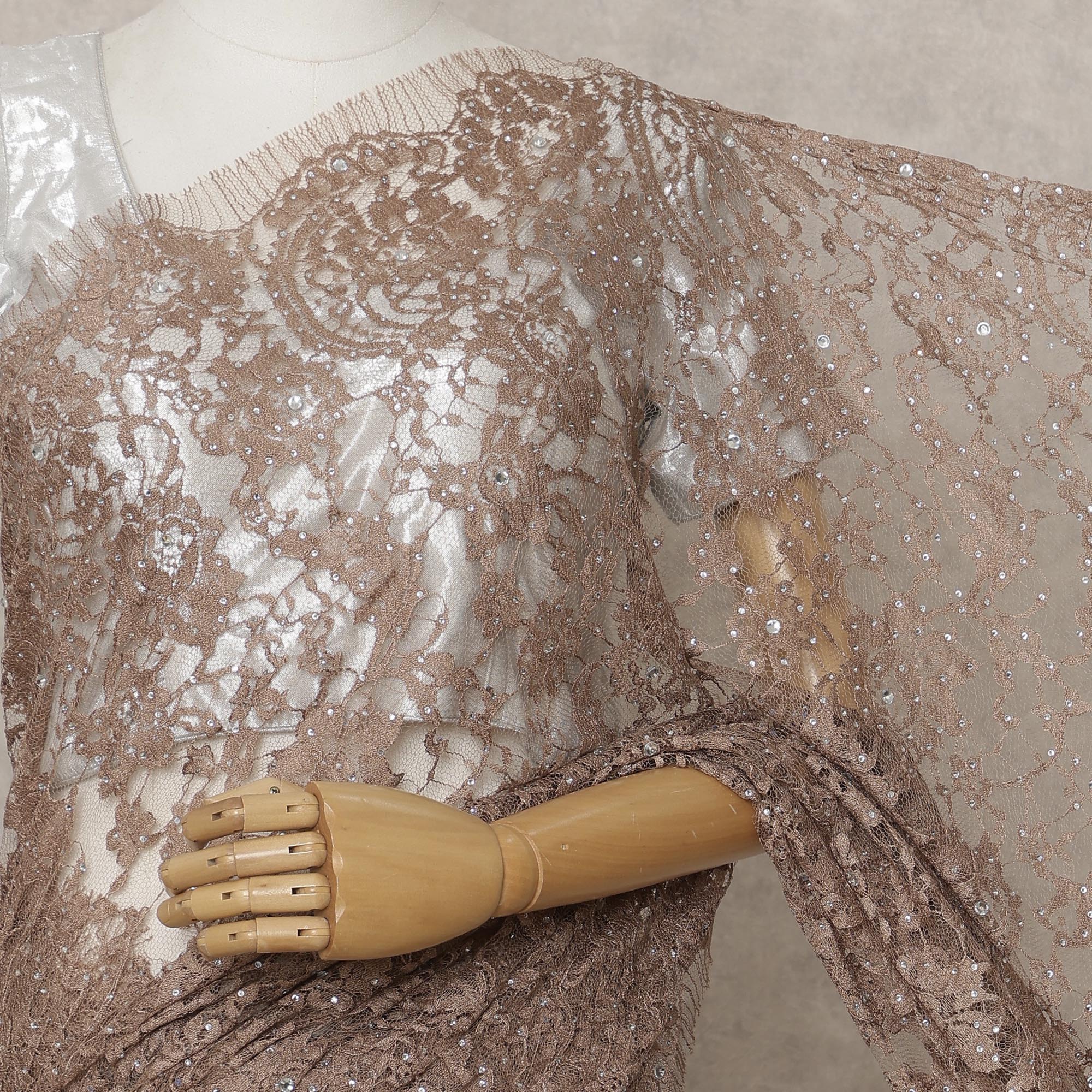 ساري فرنسي فاخر بلون بني موكا من الدانتيل الشانتيلي ثنائي اللون مع تطريز حجري، عرض 110 سم، 5.5 متر، فرنسا - D25586