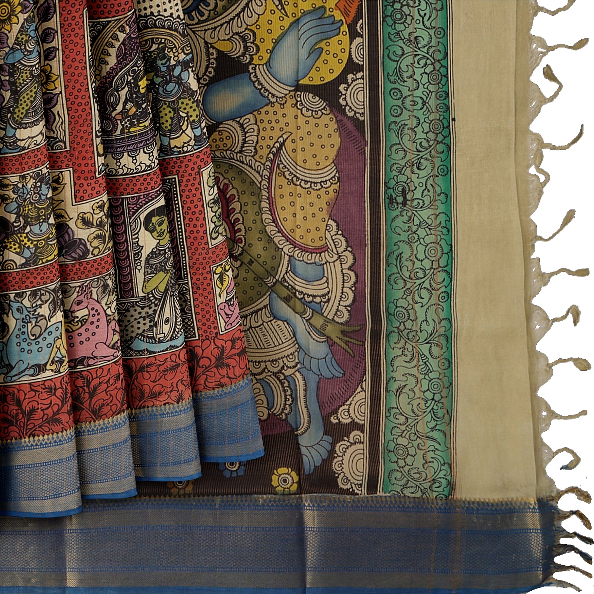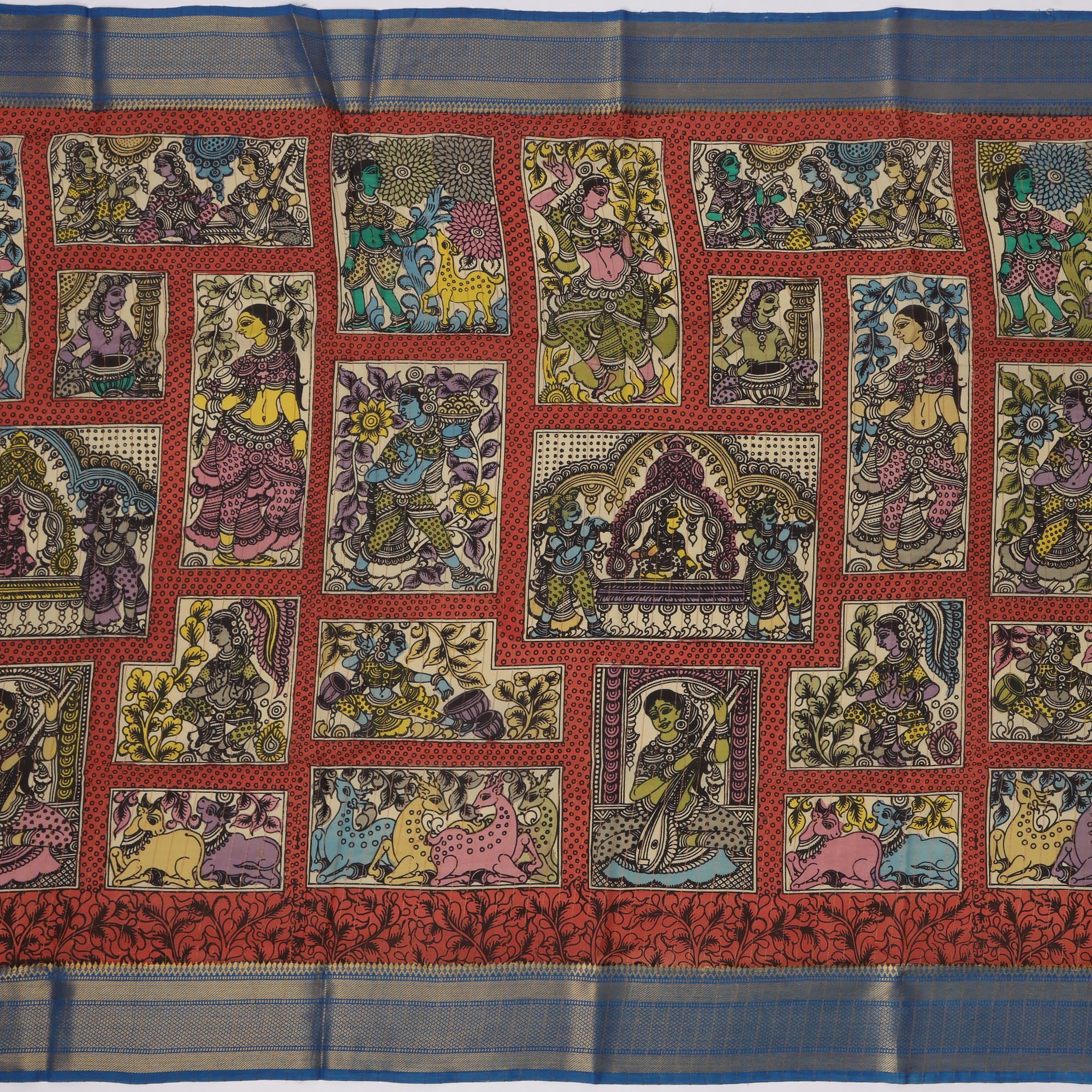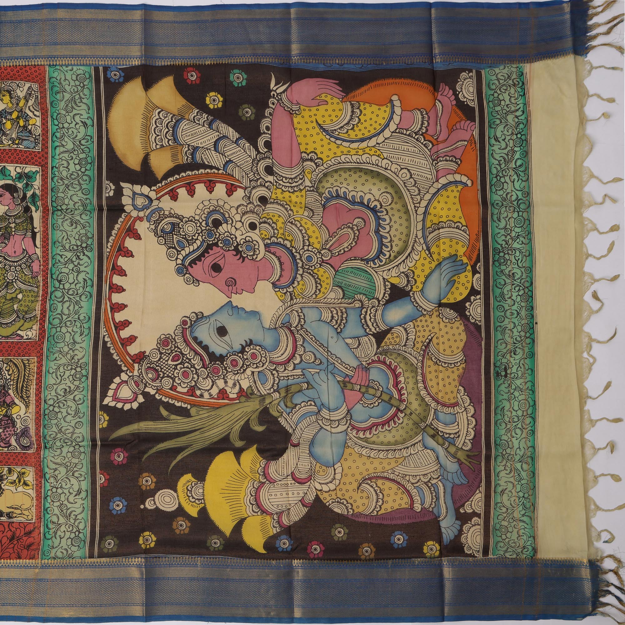 ساري كالامكاري متعدد الألوان من حرير بنغالور مع رسومات أسطورية مرسومة يدويًا، عرض 110 سم، أصله: سري كالاهاستي، الهند، طوله 5.5 متر مع بلوزة - D22843