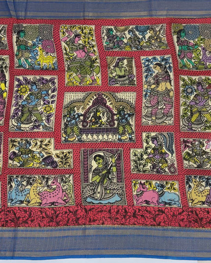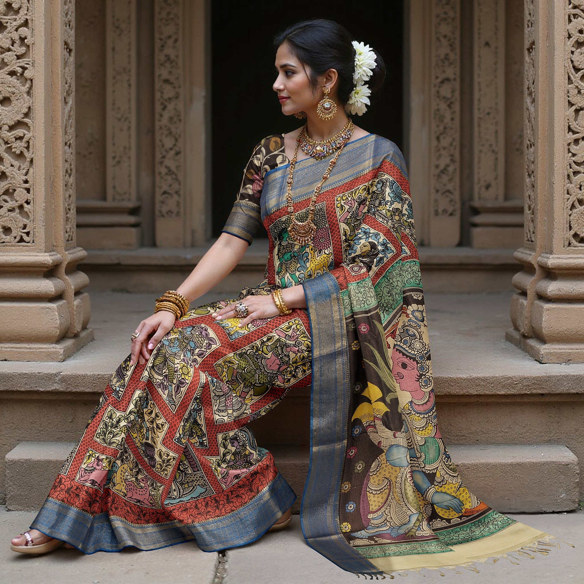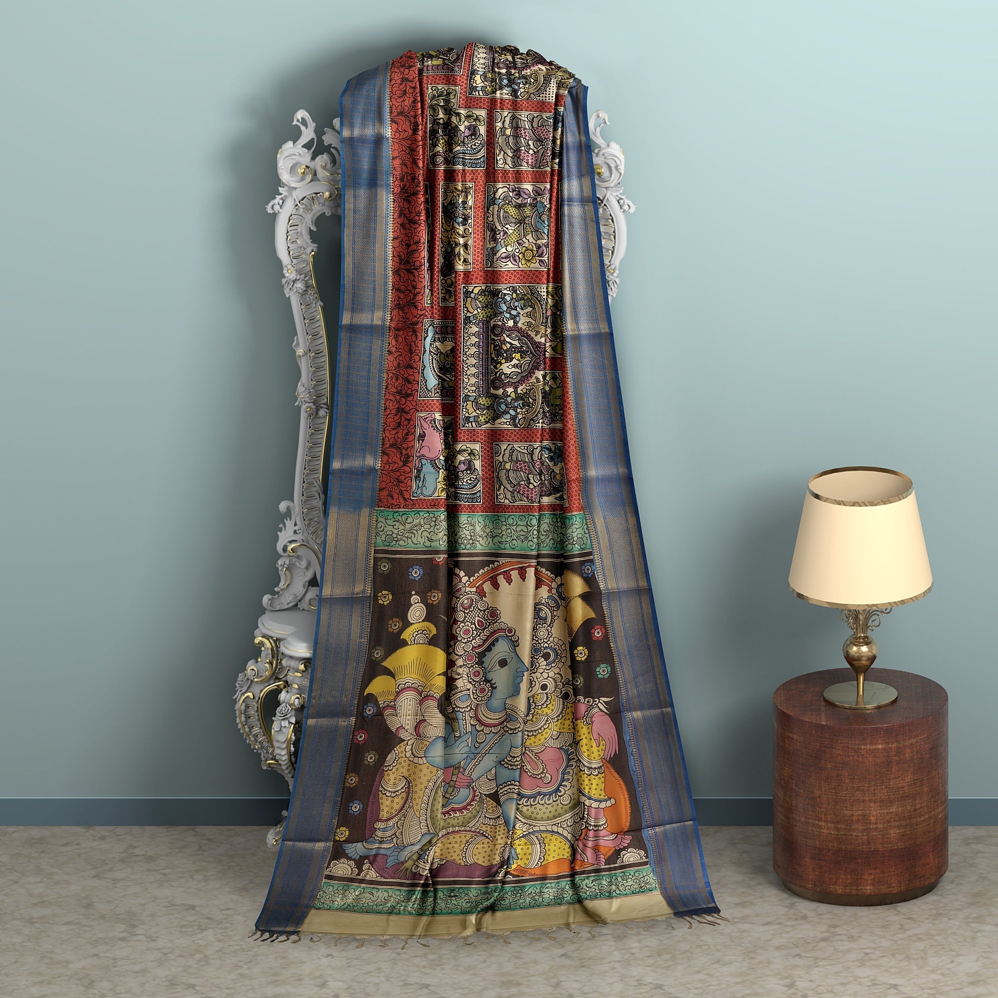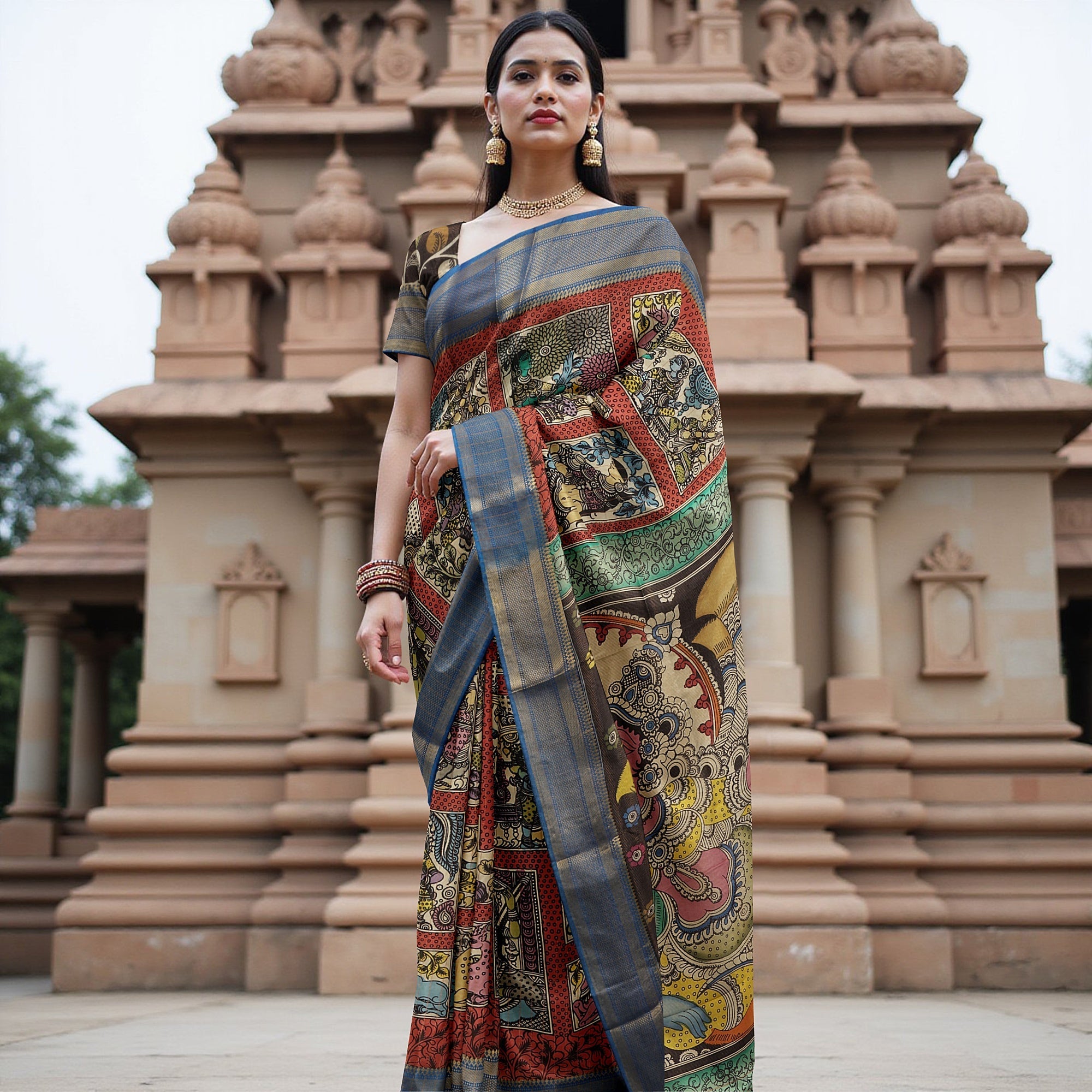 ساري كالامكاري متعدد الألوان من حرير بنغالور مع رسومات أسطورية مرسومة يدويًا، عرض 110 سم، أصله: سري كالاهاستي، الهند، طوله 5.5 متر مع بلوزة - D22843