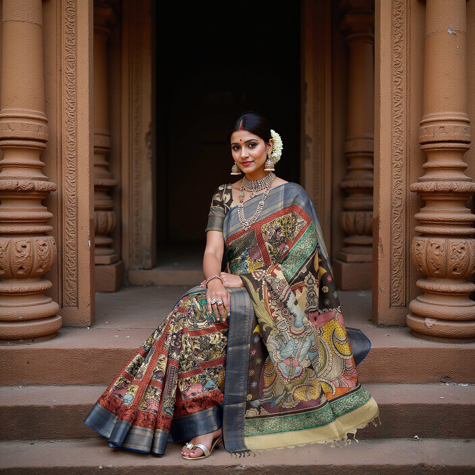 ساري بن كالامكاري الحريري من بنغالور، المُزين بألوان متعددة فخمة، يُجسد حكاية بصرية منسوجة يدويًا بتفانٍ ومُزينة بأساطير. كل زخارفه - كائنات سماوية، حكماء إلهيون، ومشاهد معابد - مُحيية باستخدام أصباغ طبيعية وأقلام خيزران على يد حرفيين مهرة من سري كالاهاستي. العملية بطيئة وعميقة، وتتطلب 48 ساعة من الحرفية المُركزة لإكمال ساري واحد. يُعزز ثراء الحرير الأرجواني التفاصيل الدقيقة المُصممة بدرجات الخردل والأسود والصدأ، مما يُحوّل هذه الستارة التي يبلغ طولها 5.5 متر إلى قطعة فنية خالدة. مع قطعة بلوزة مُطابقة، إنه خيار مثالي للمناسبات الاحتفالية أو الفعاليات التقليدية. تسوق عبر الإنترنت لامتلاك قطعة فنية يدوية الصنع تُجسد التراث الثقافي العريق.