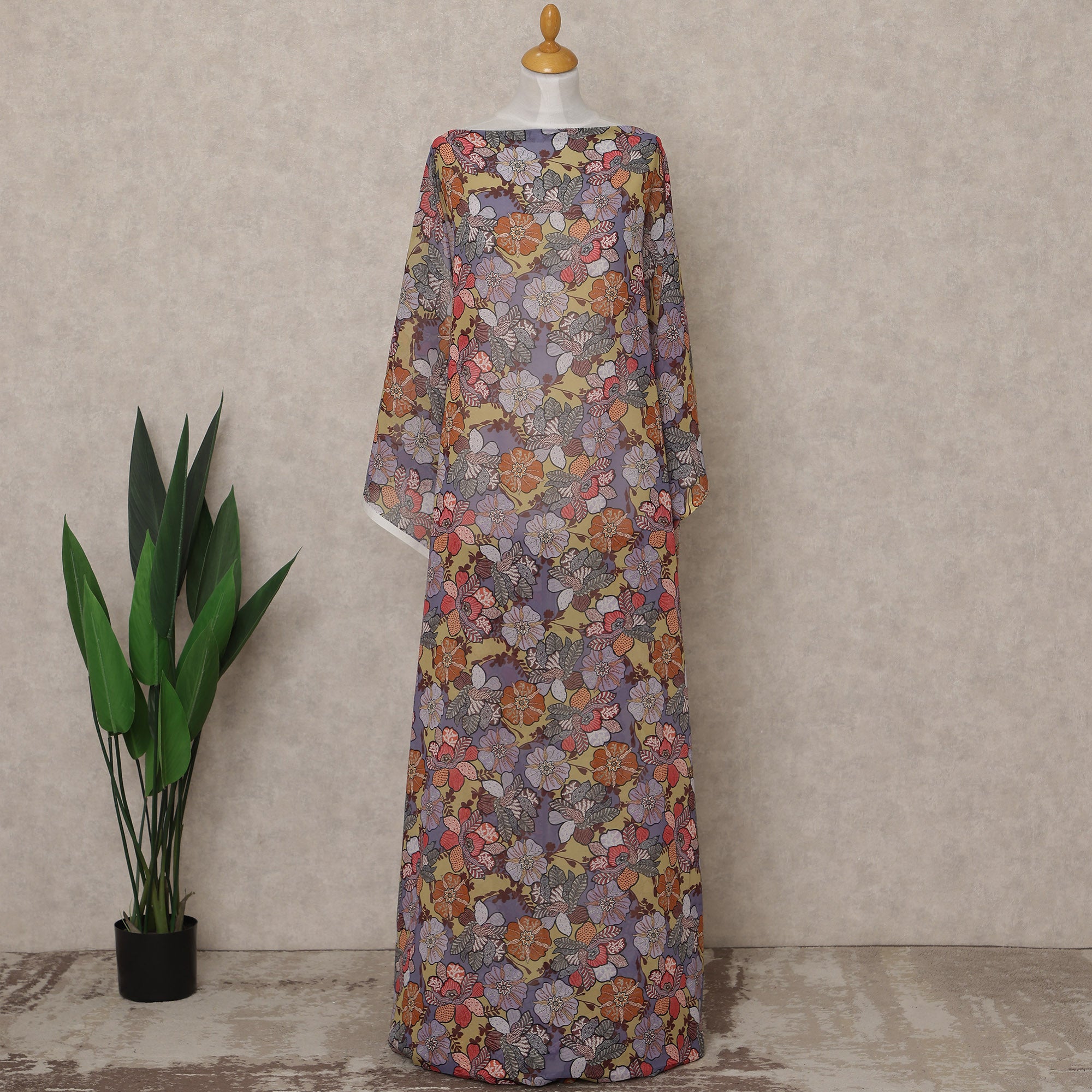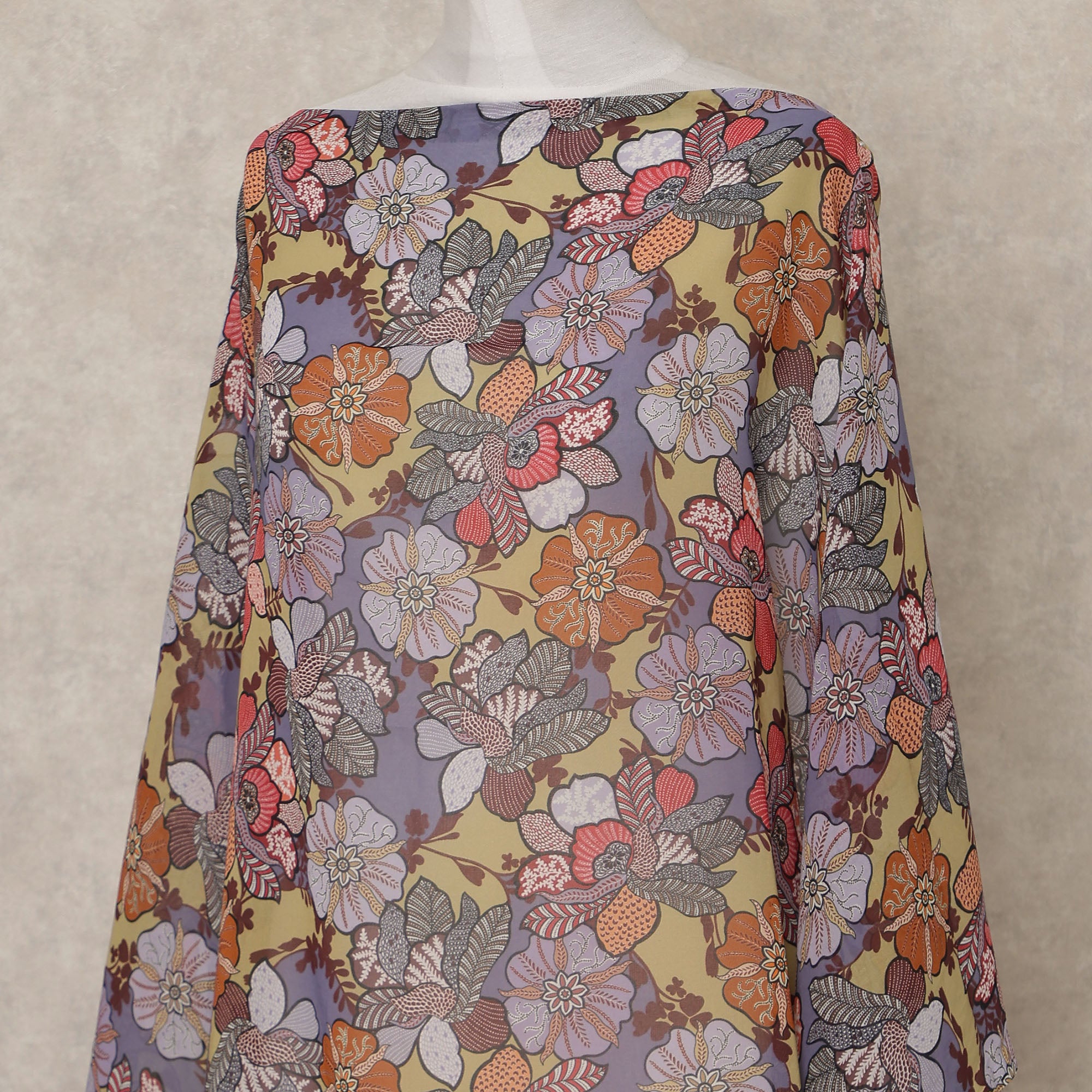 This multicolor Somali cotton voile dirac fabric features a vibrant floral print blending shades of lavender, coral, mustard, grey, and... اقرأ أكثر اقرأ أكثر