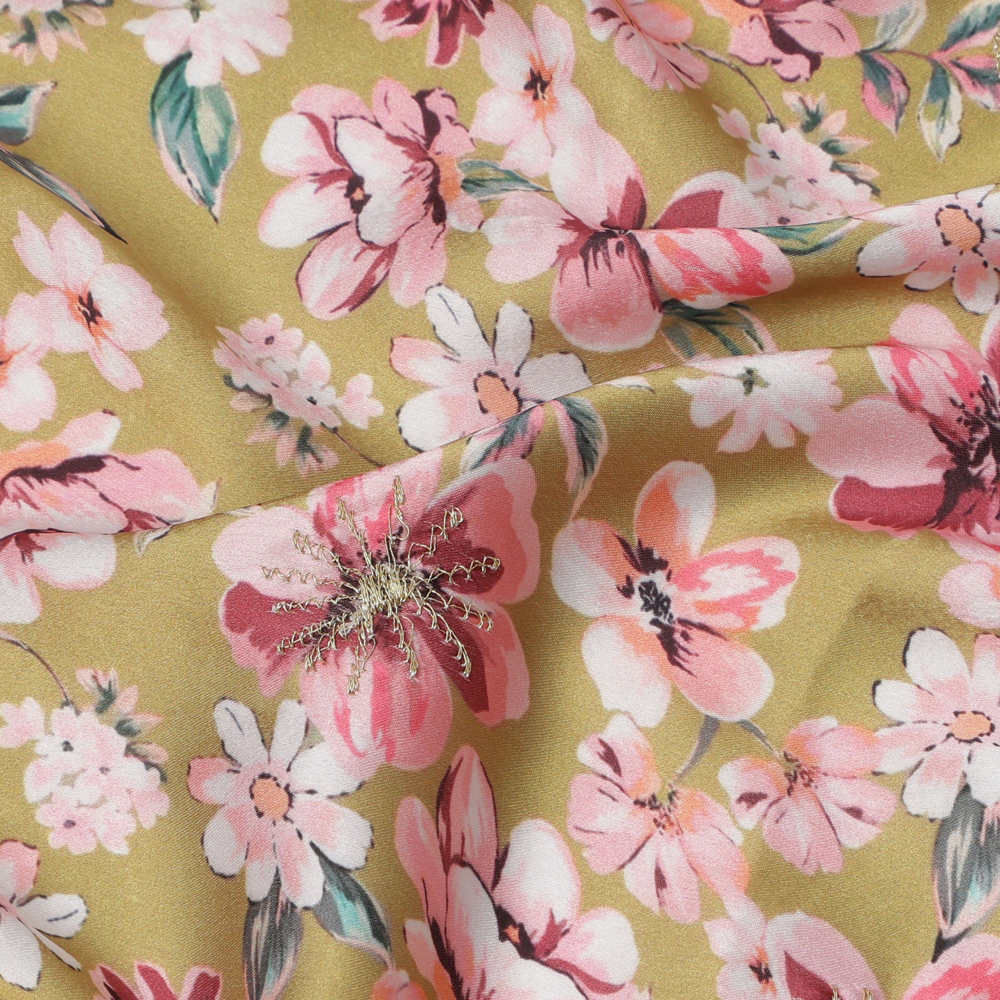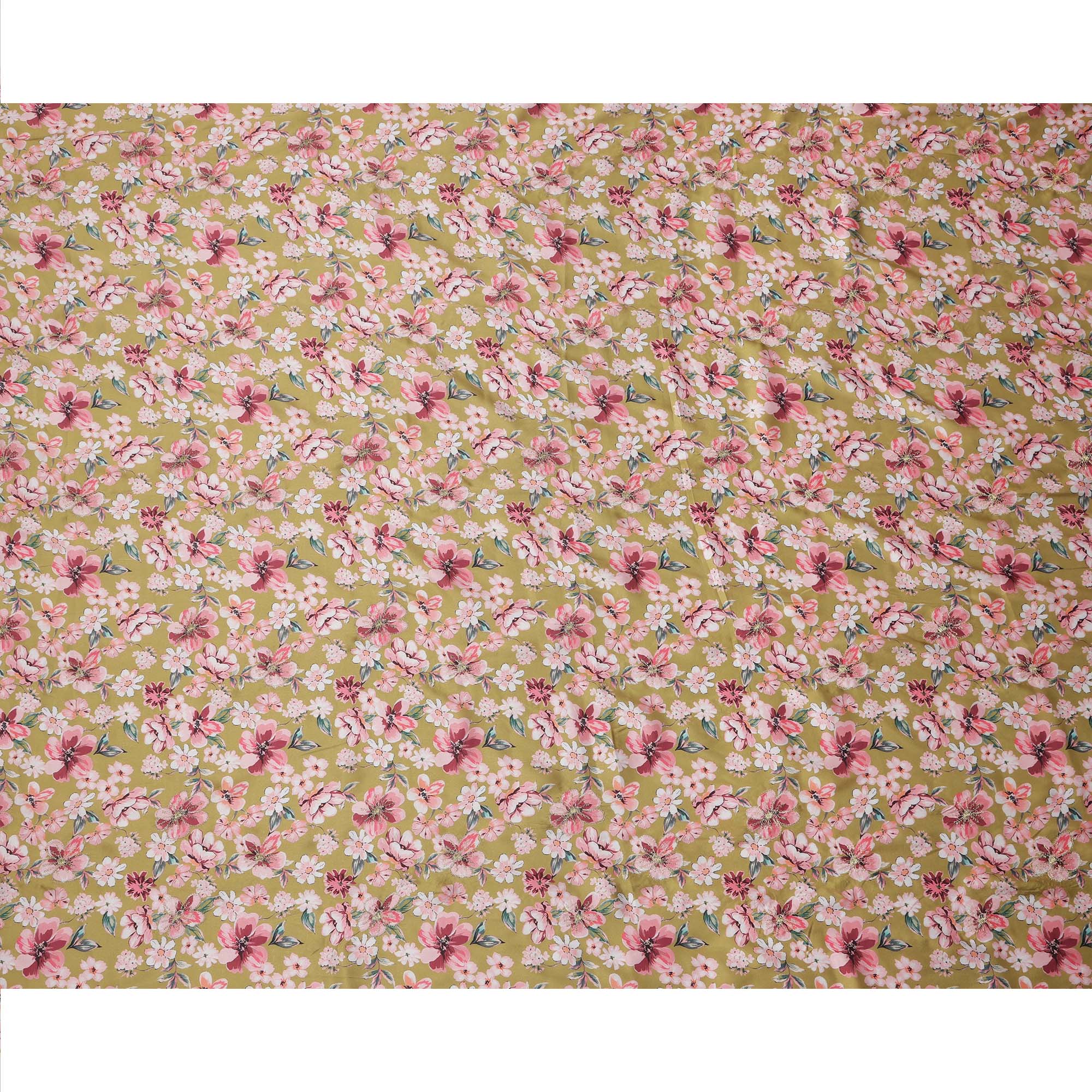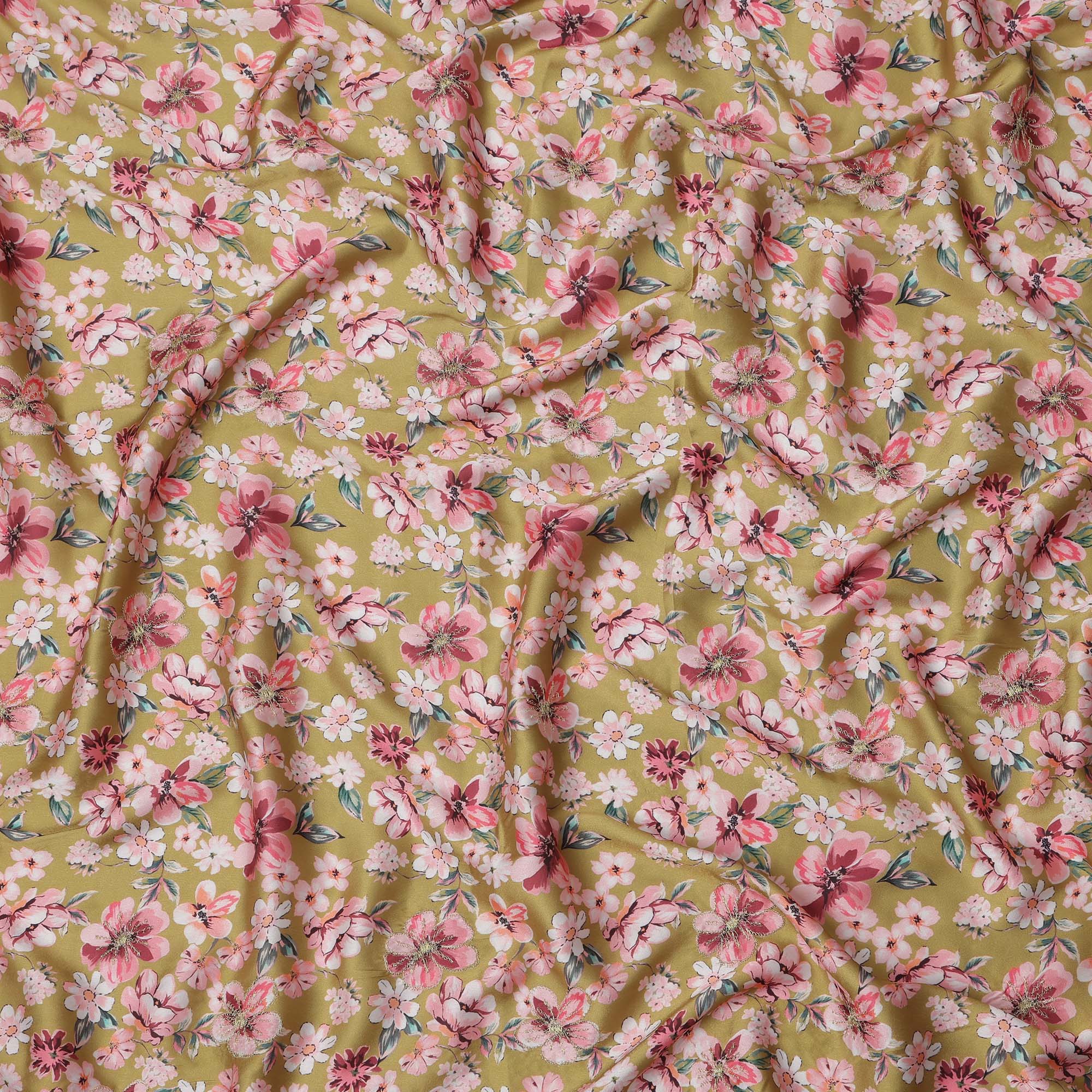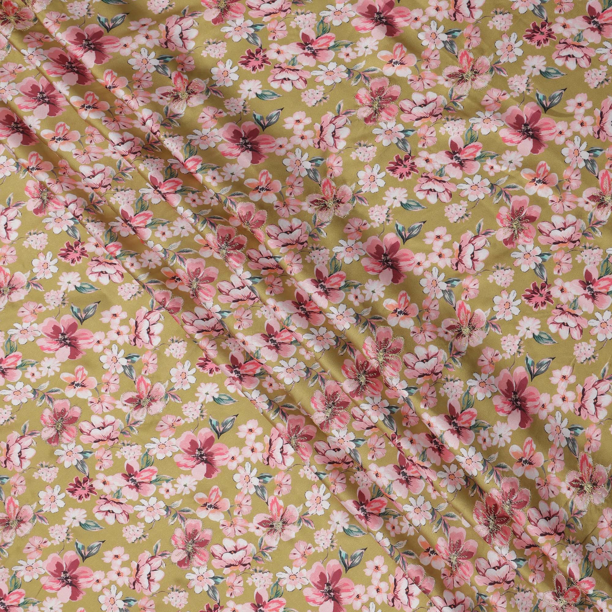 قماش فيسكوز مطبوع عليه زهور بلون الخردل مع أزهار وردية وبيضاء، 110 سم، الهند - D23848