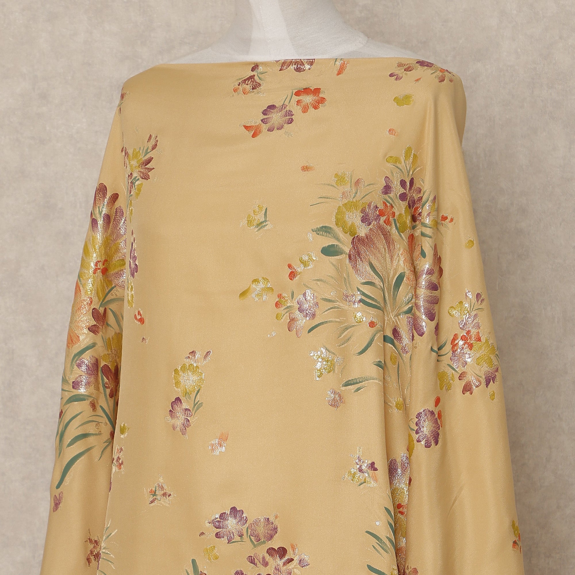Mustard yellow base with multicolor floral print and metallic accents adds elegant dimension.