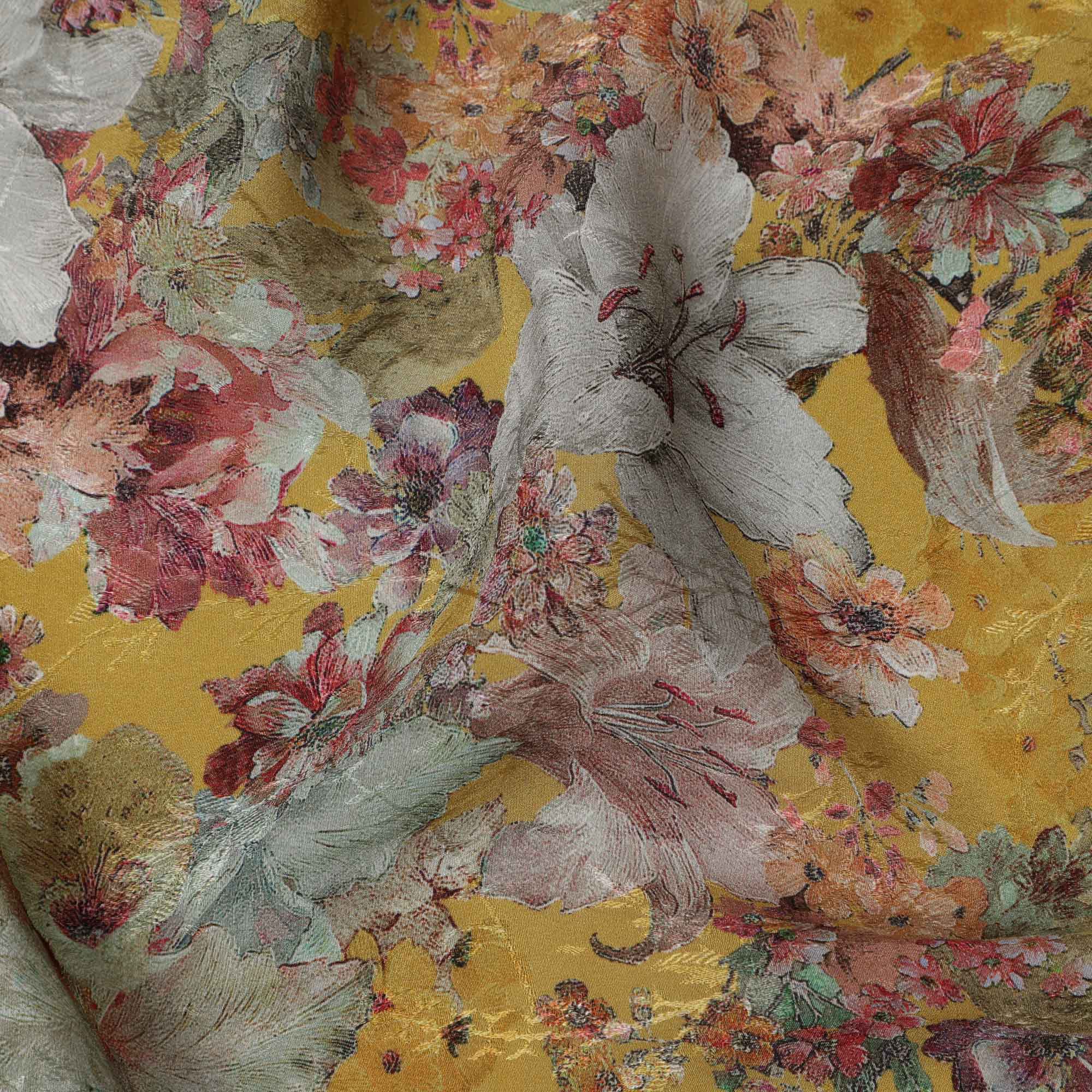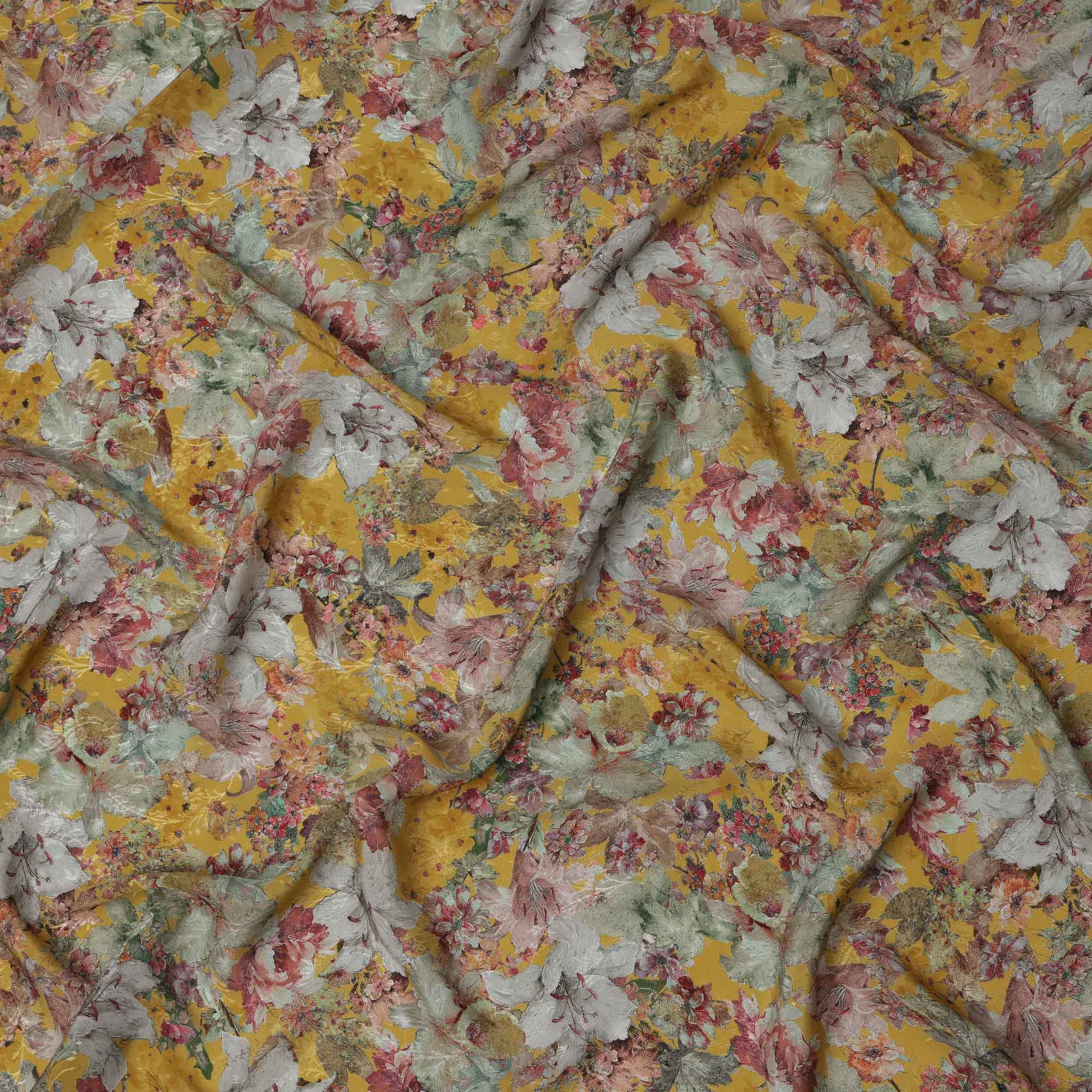 أضفِ البهجة إلى إبداعاتك مع هذا القماش الكريب الفيسكوزي المطبوع عليه زهور باللون الأصفر الخردلي، والذي يتميز بتصميم حديقة عتيقة... اقرأ أكثر اقرأ أكثر