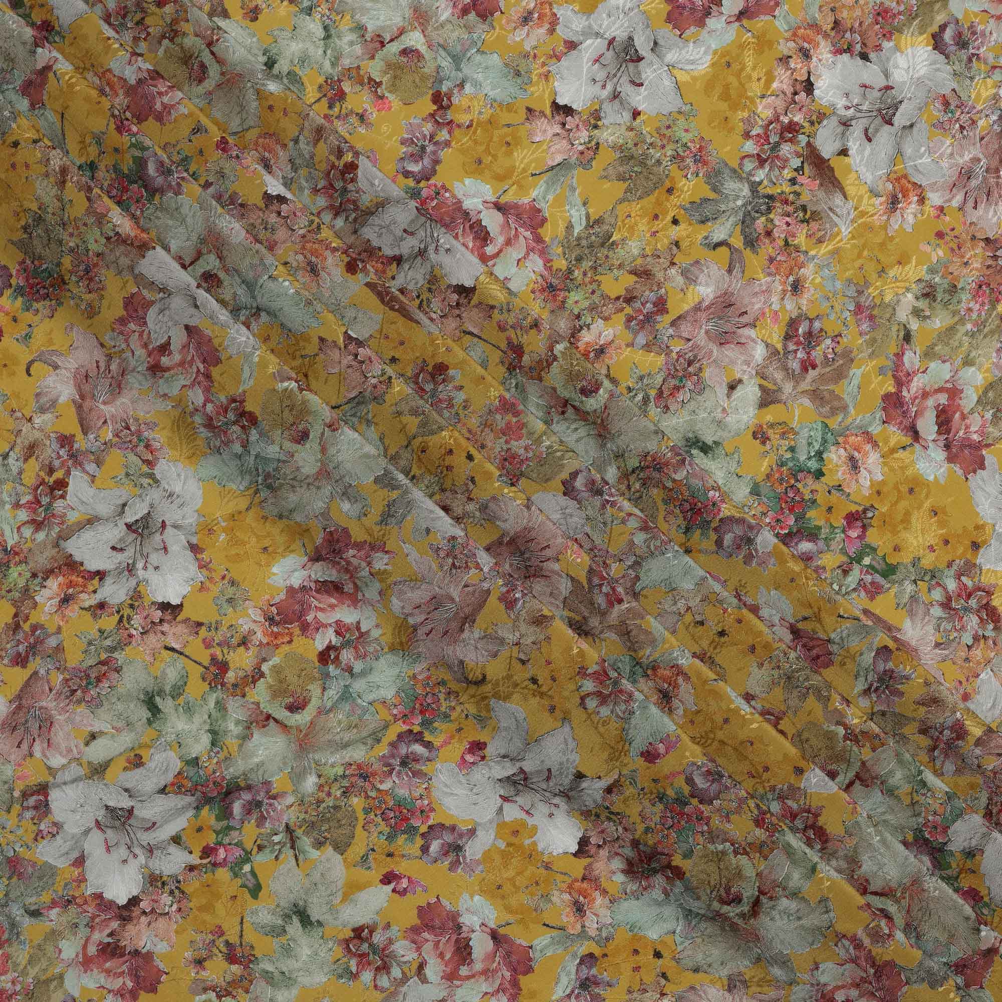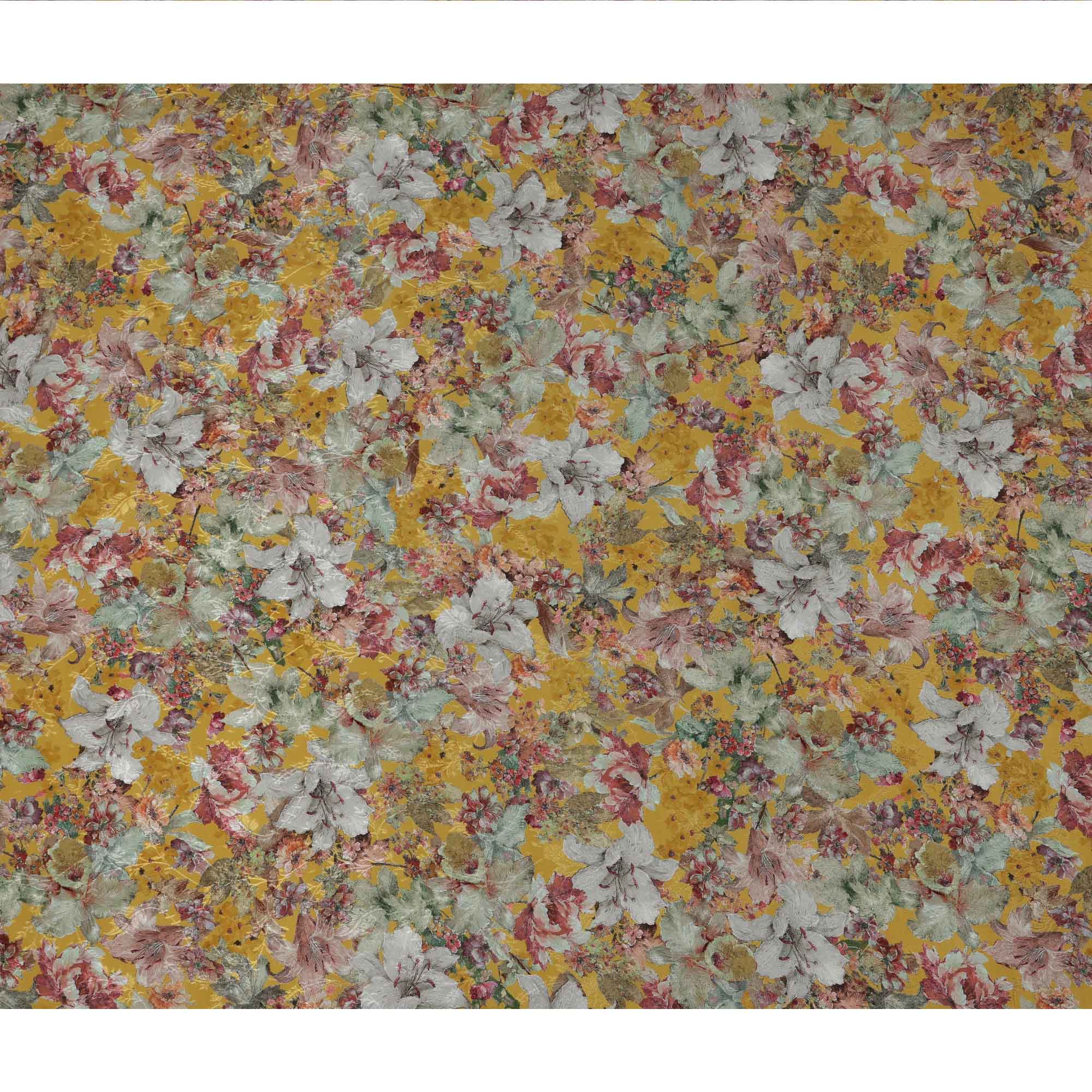 قاعدة باللون الأصفر الخردلي مع طباعة زهور مفصلة باللون البنفسجي والأخضر والعاجي