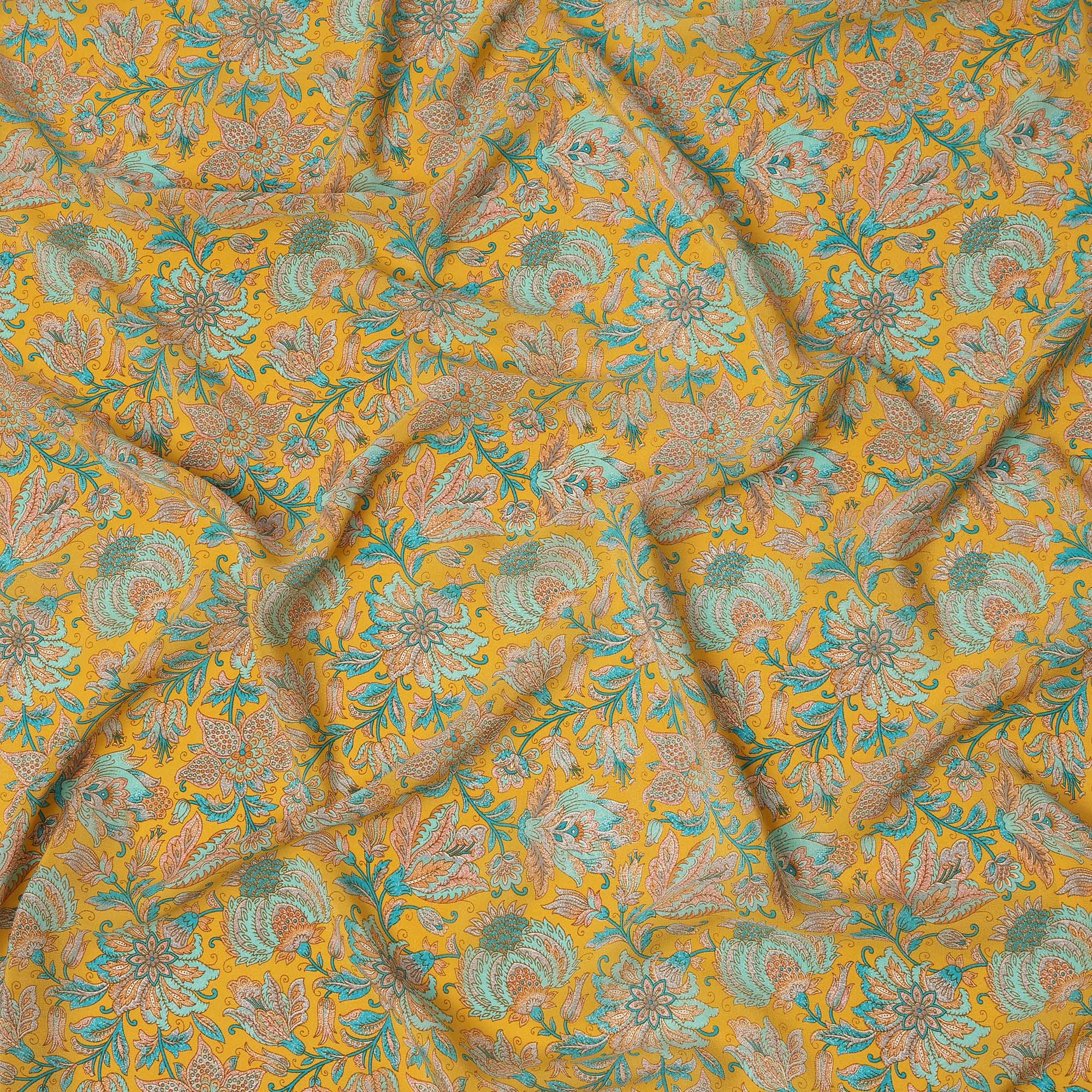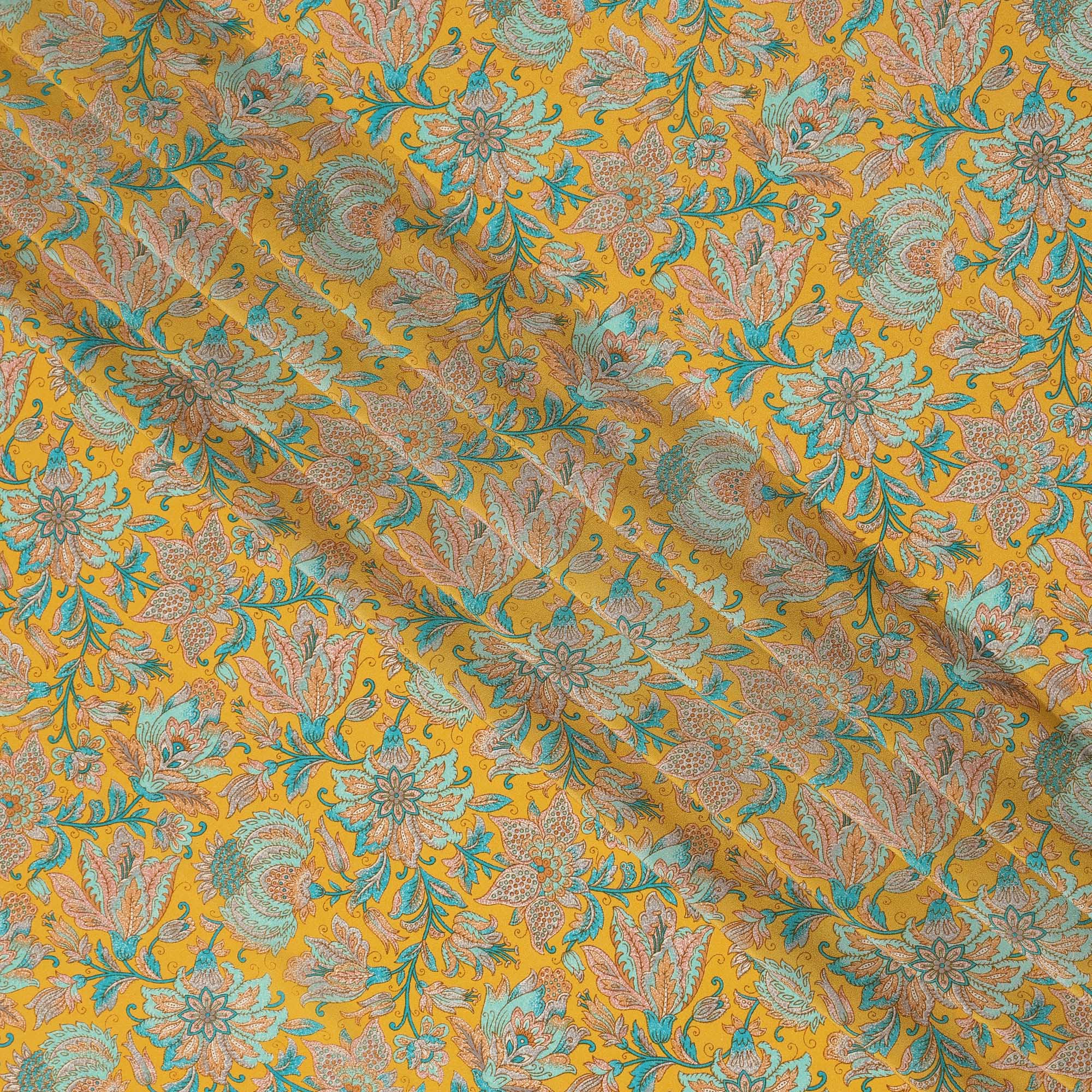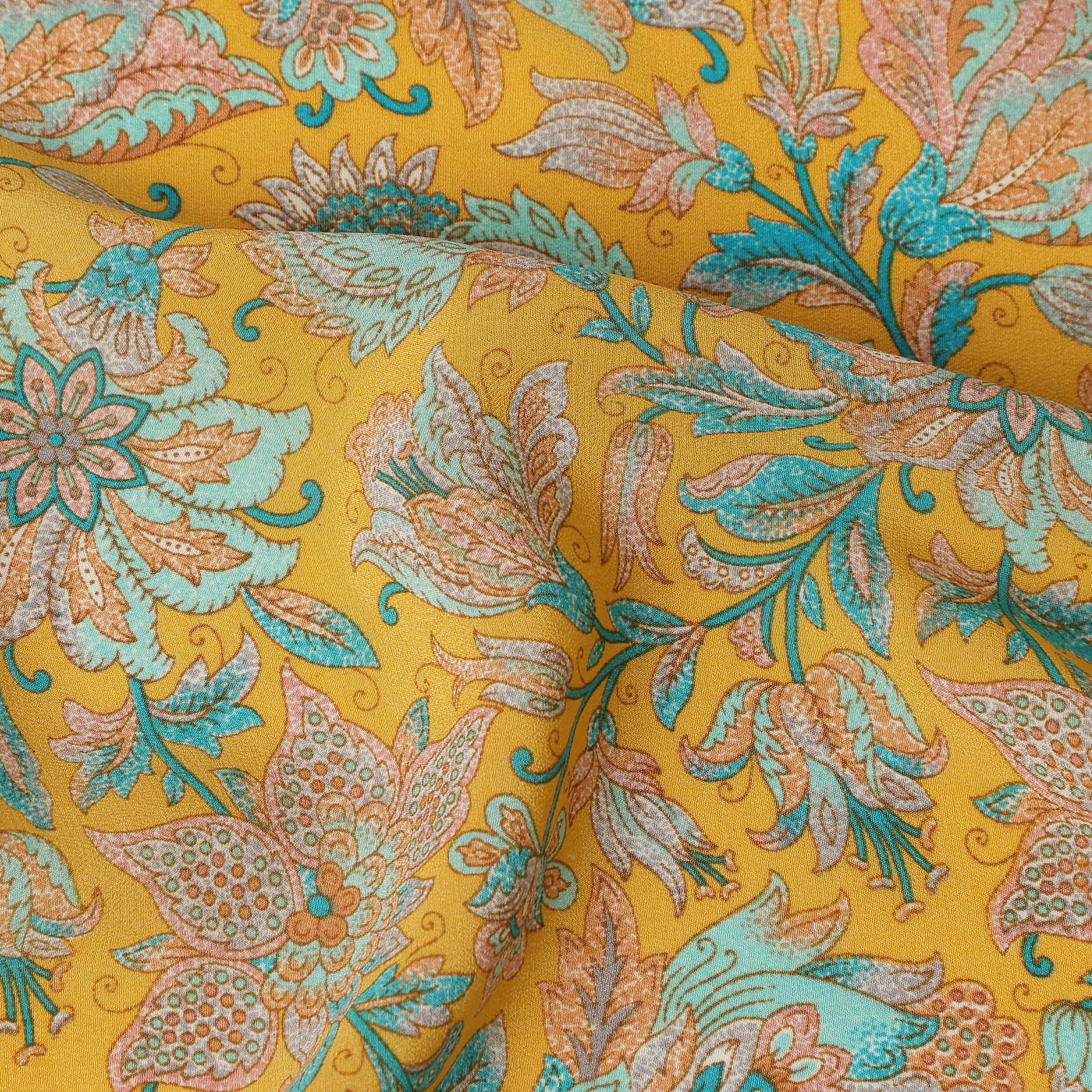 Mustard Yellow Intricate Floral Paisley Print Premium Silk Crepe Fabric, 110 Cms, India-D26877
