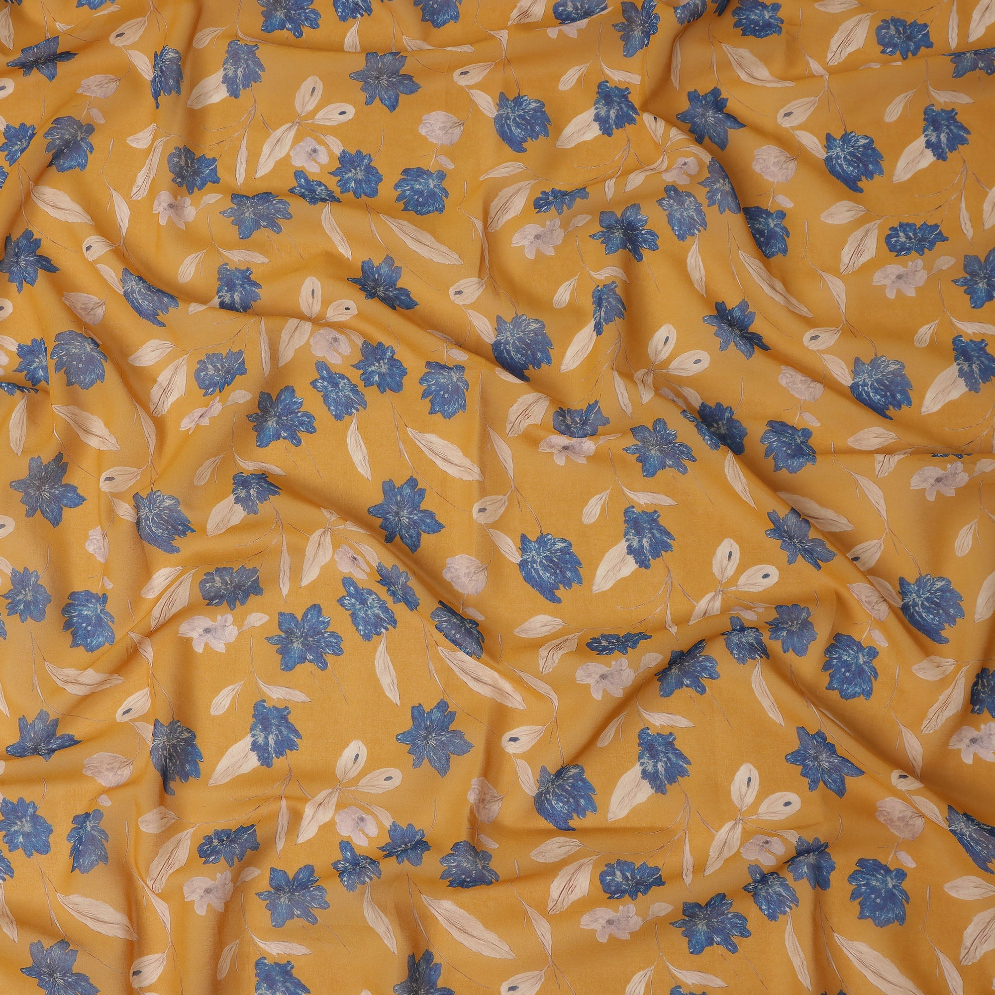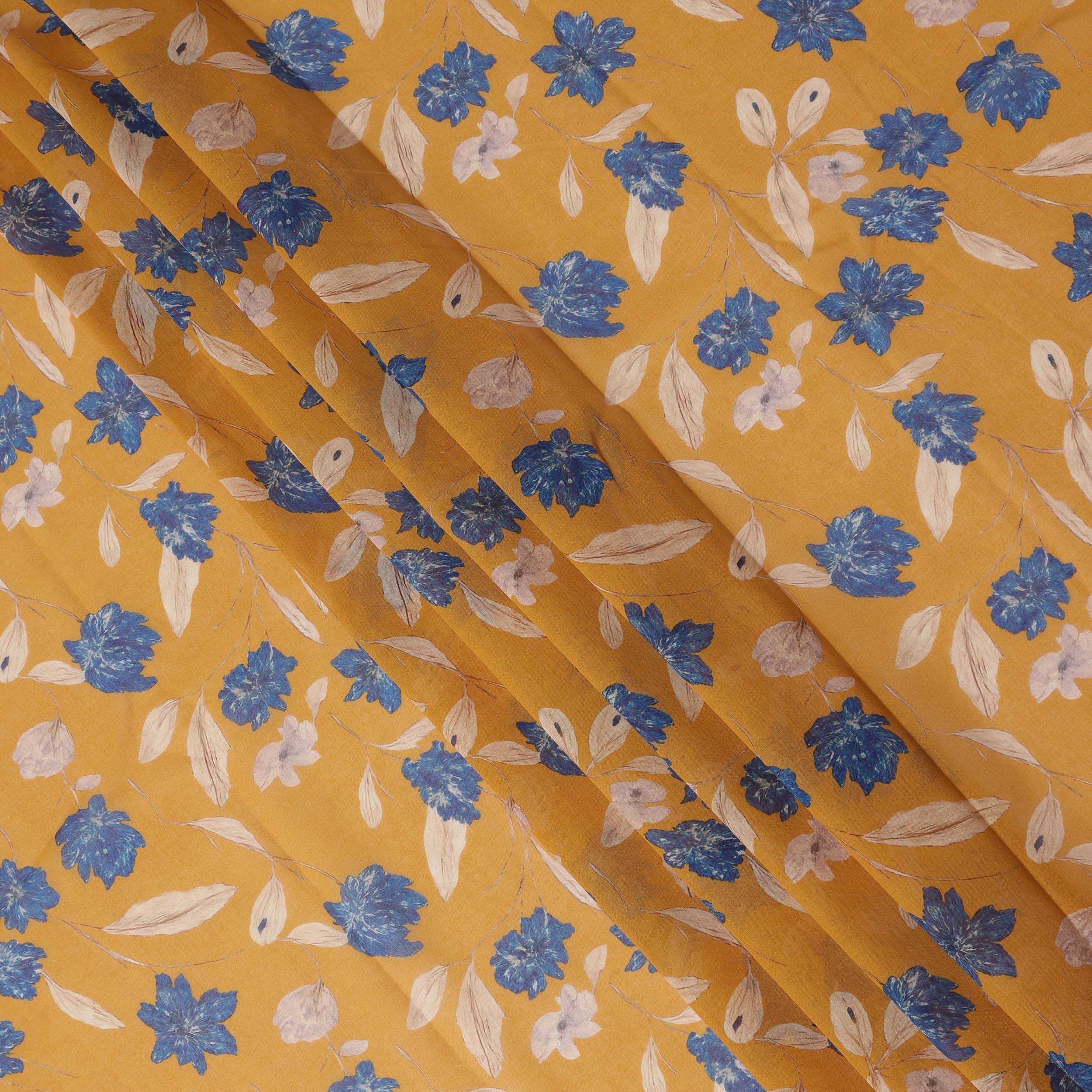 Warm mustard yellow base with elegant blue floral print for a vibrant traditional look.