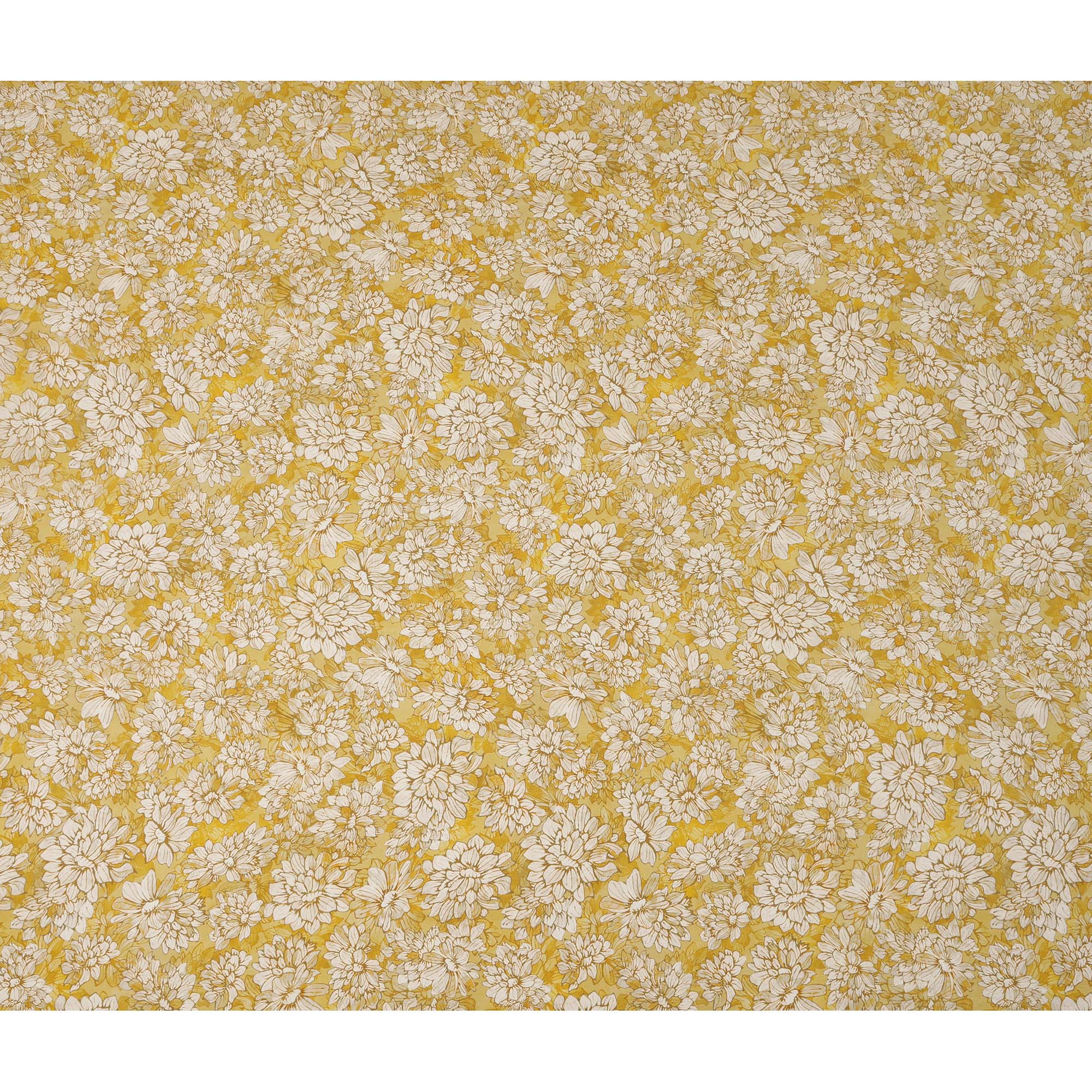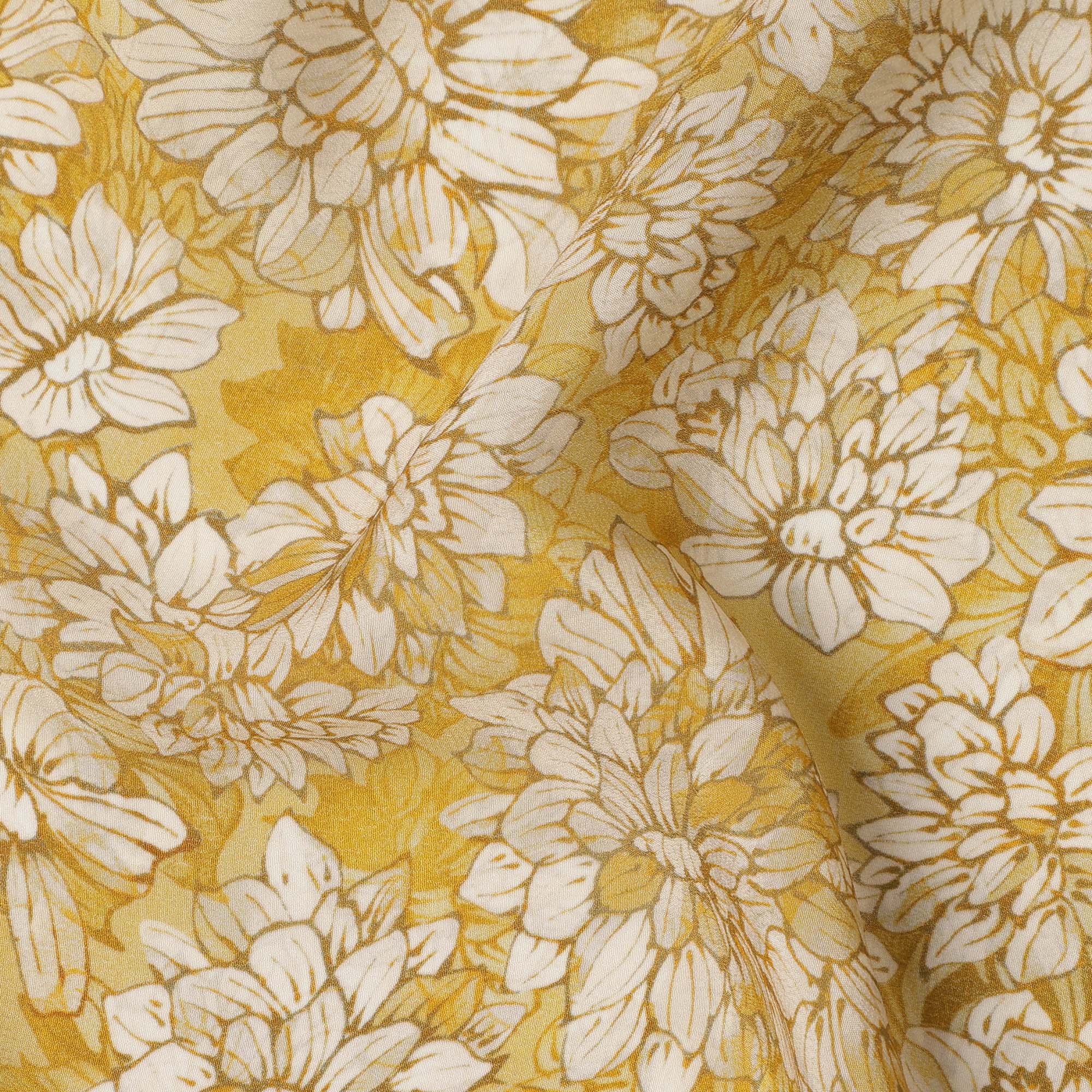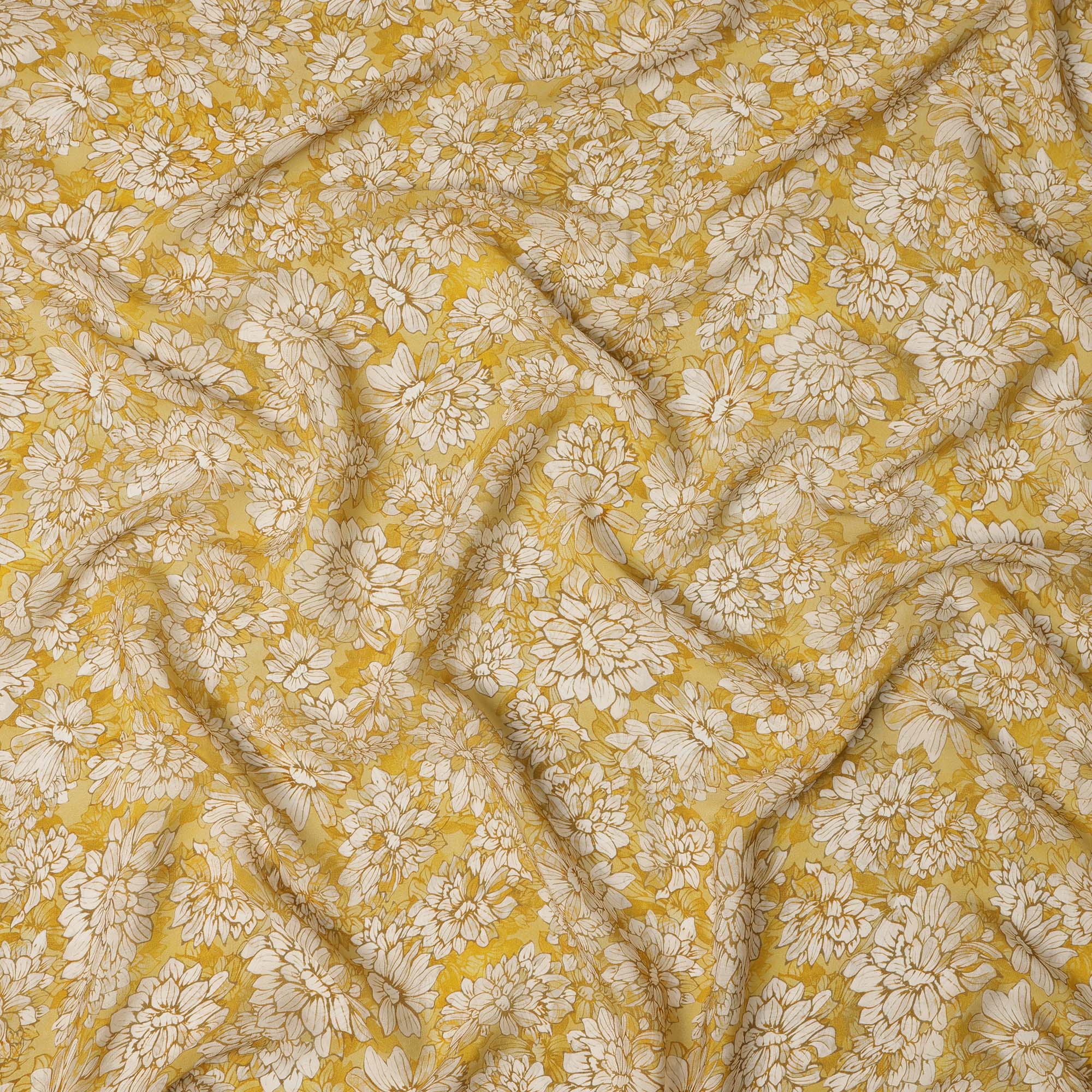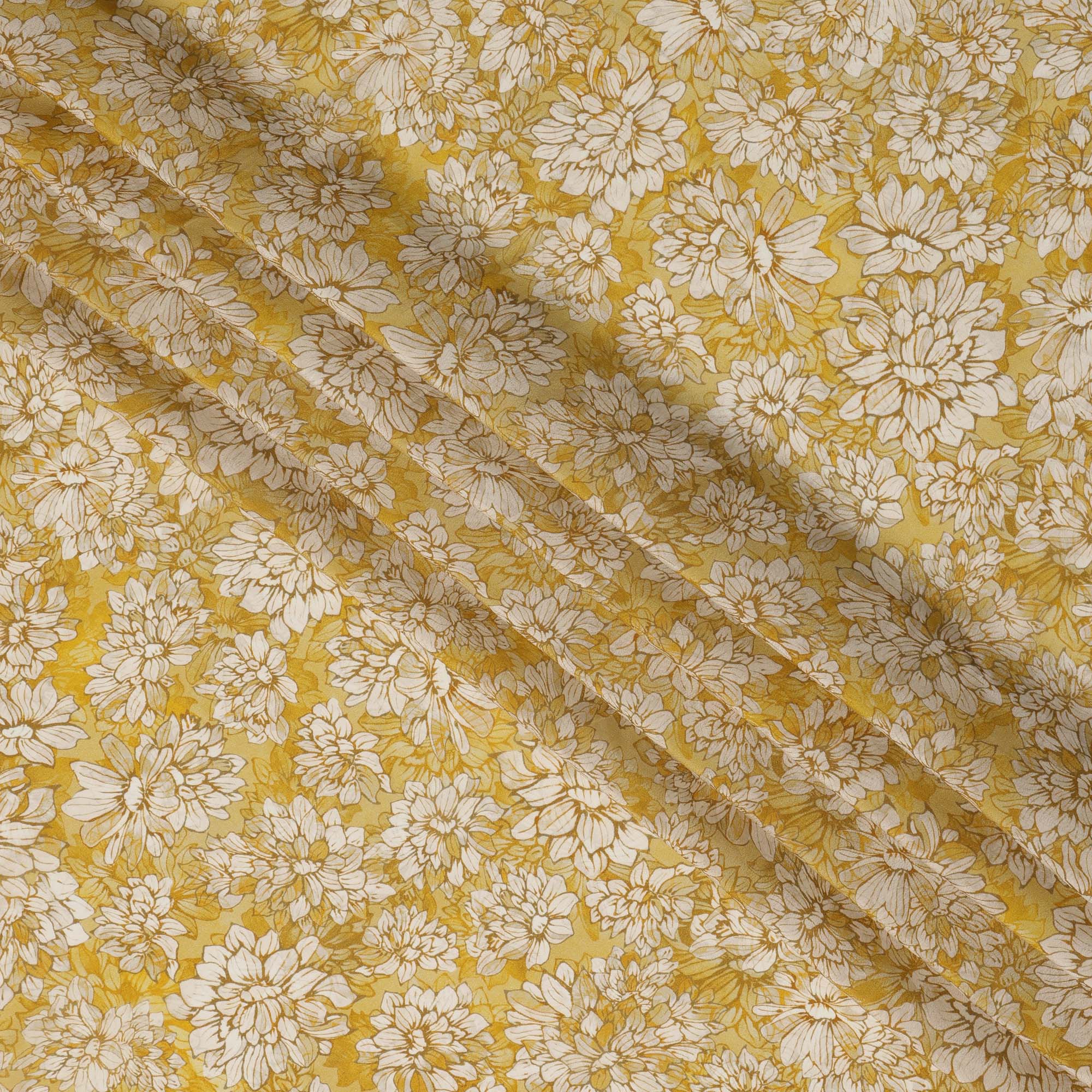 قماش كريب فيسكوز مطبوع عليه زهور باللون الأصفر الخردلي والأبيض مع زخارف نباتية مرسومة يدويًا، عرض 110 سم، صنع في الهند - D23417