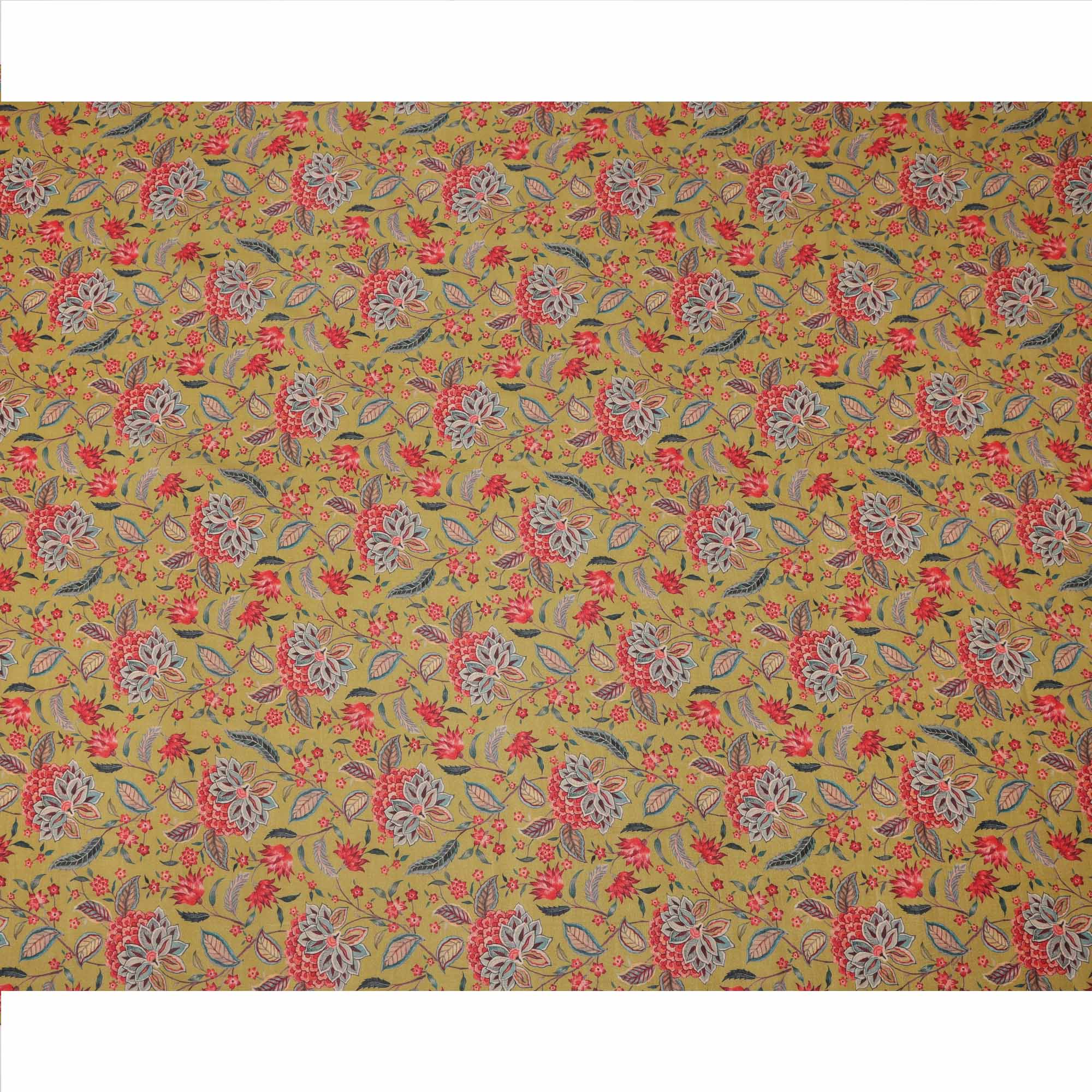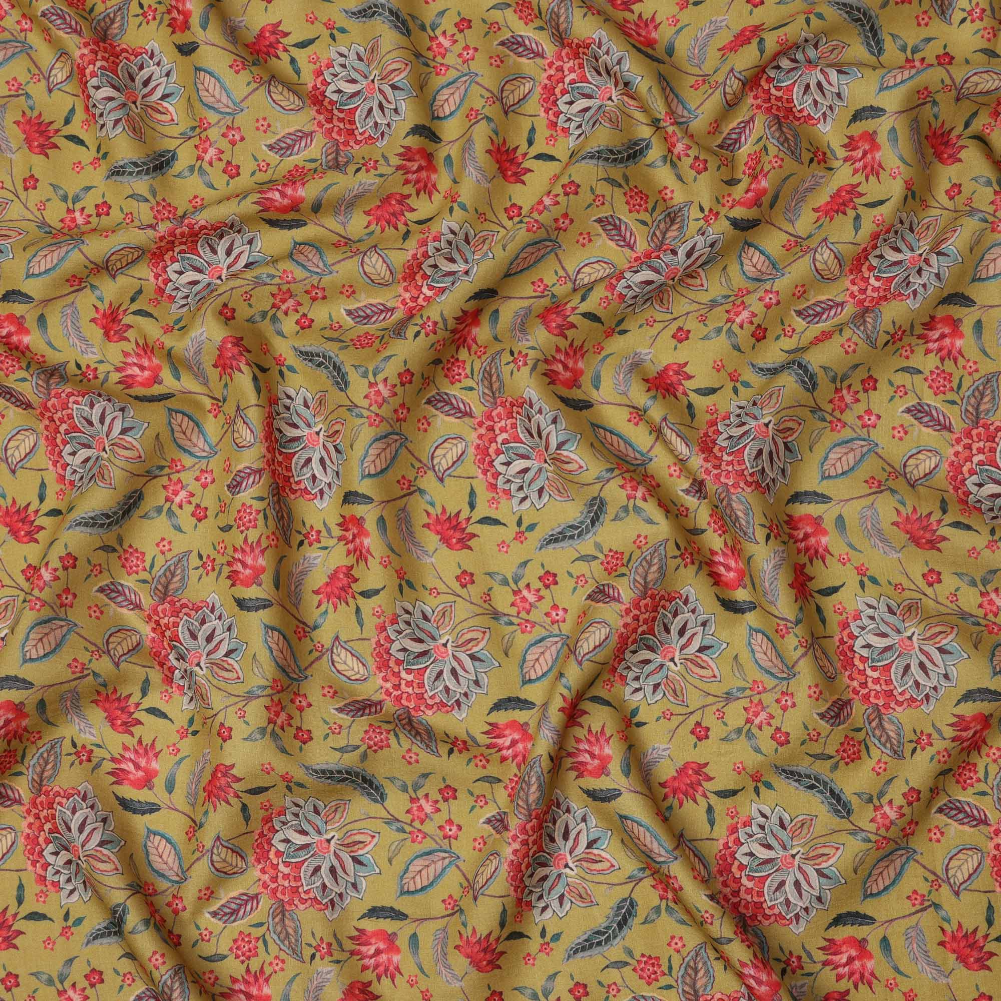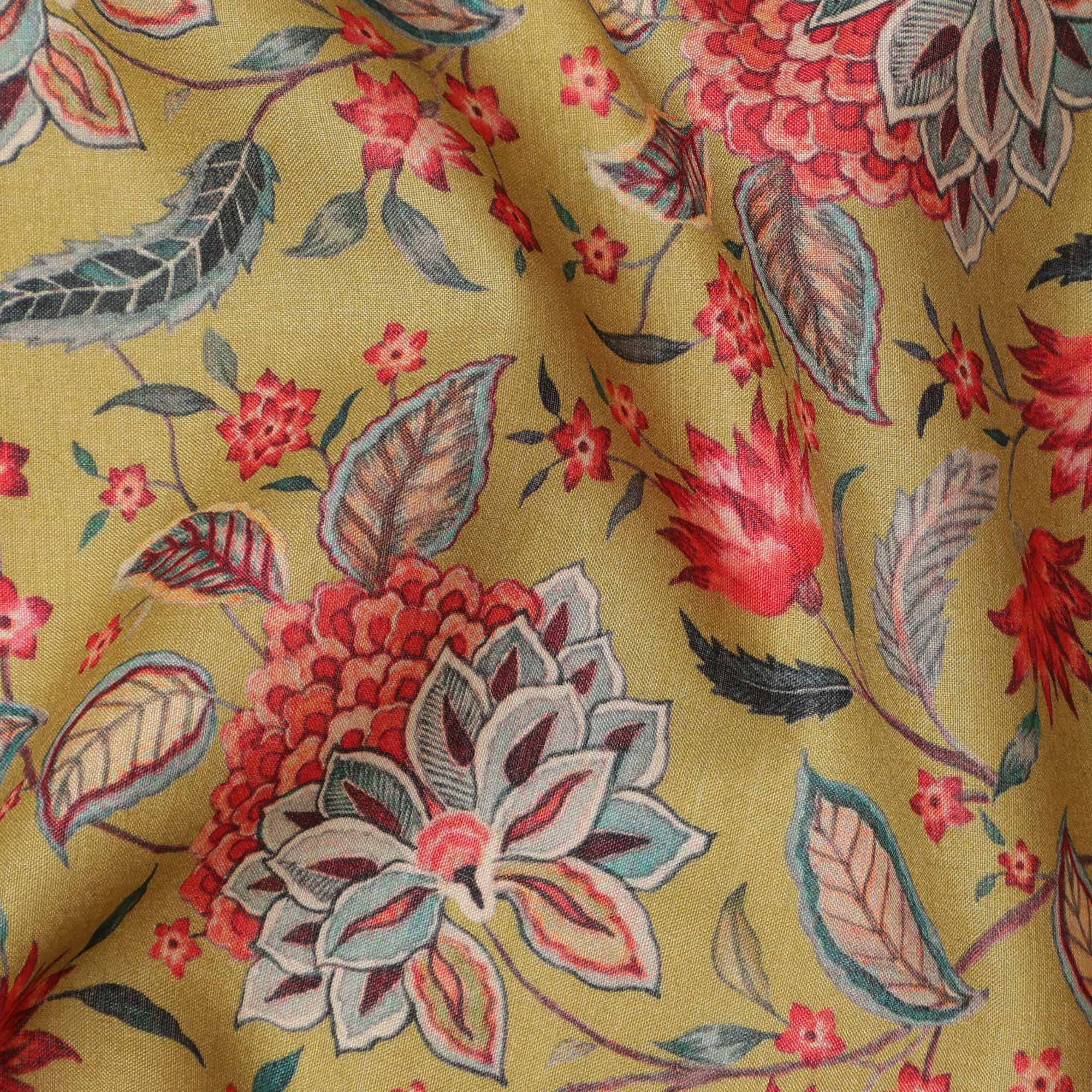 قماش كريب فيسكوز أصفر خردلي بطبعة نباتية زهرية متعددة الألوان، عرض 110 سم، صنع في الهند - D23584