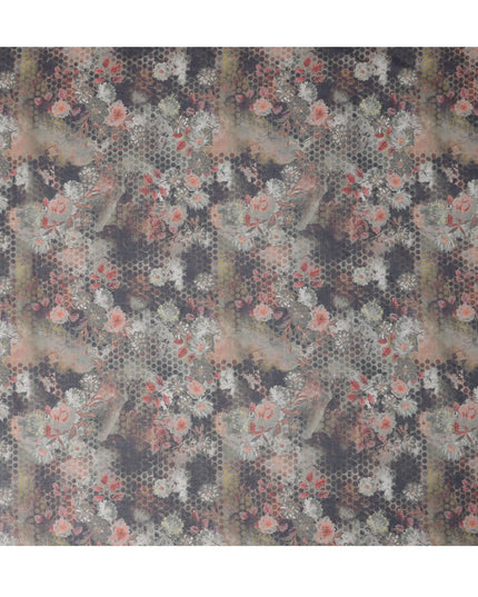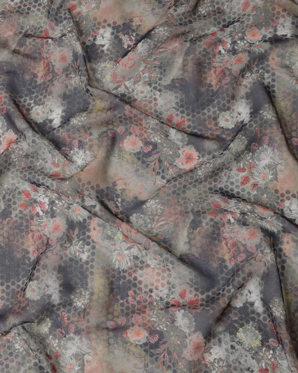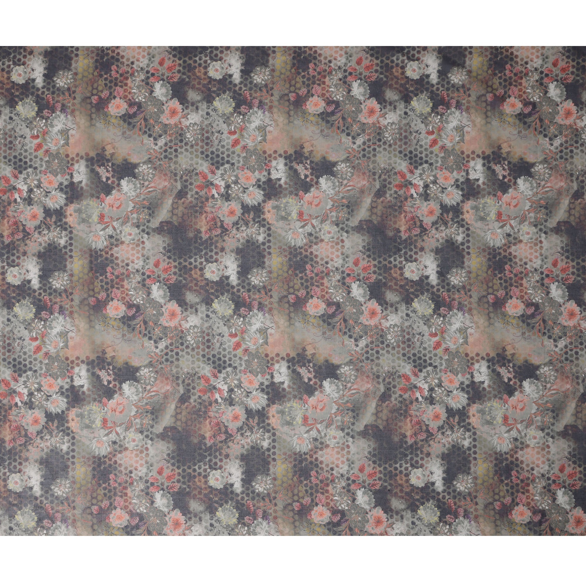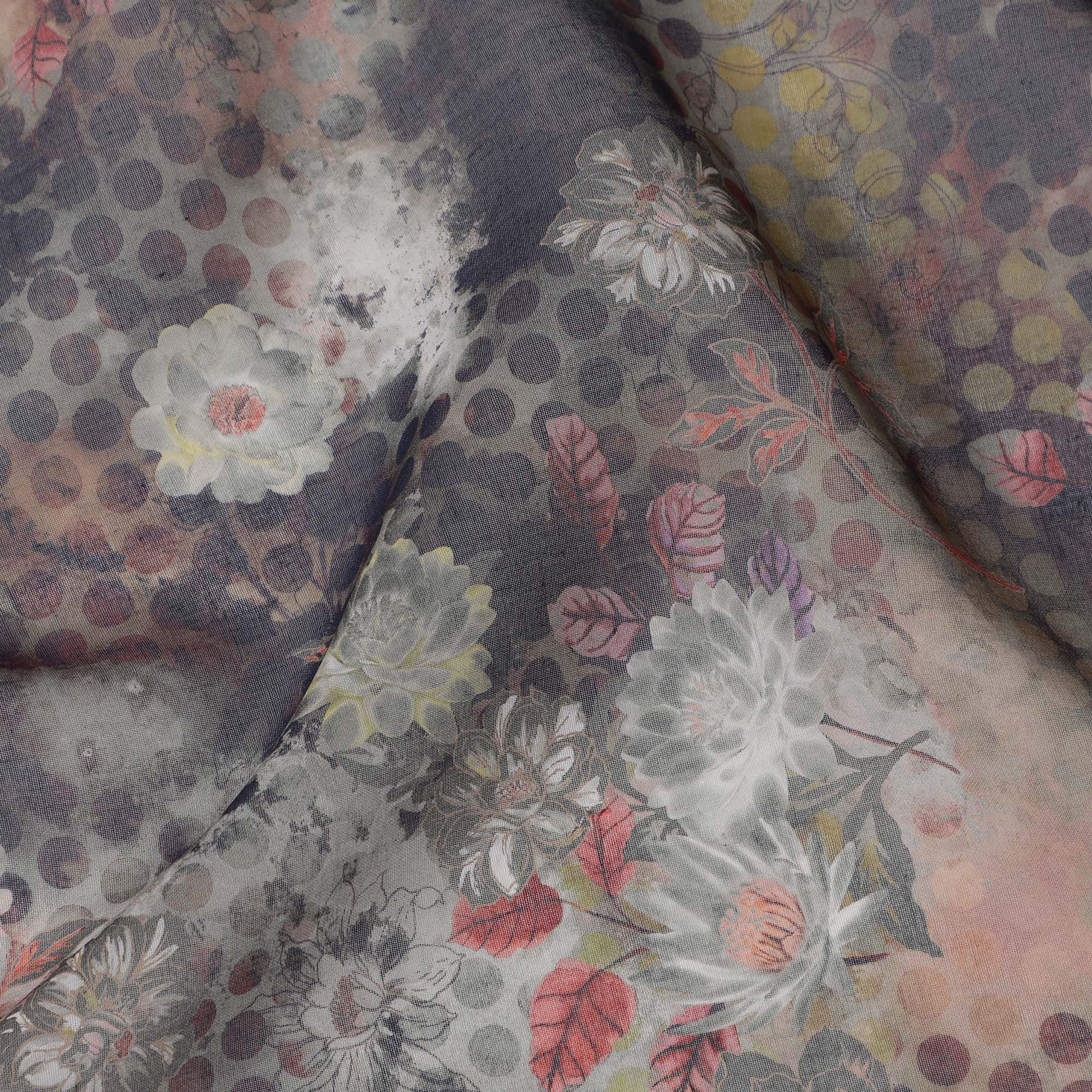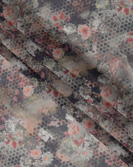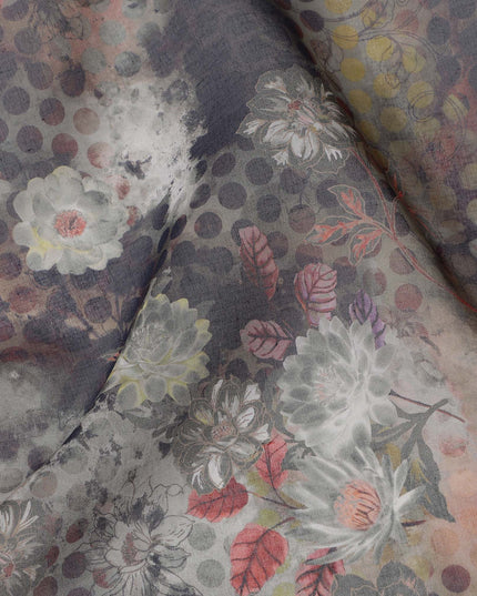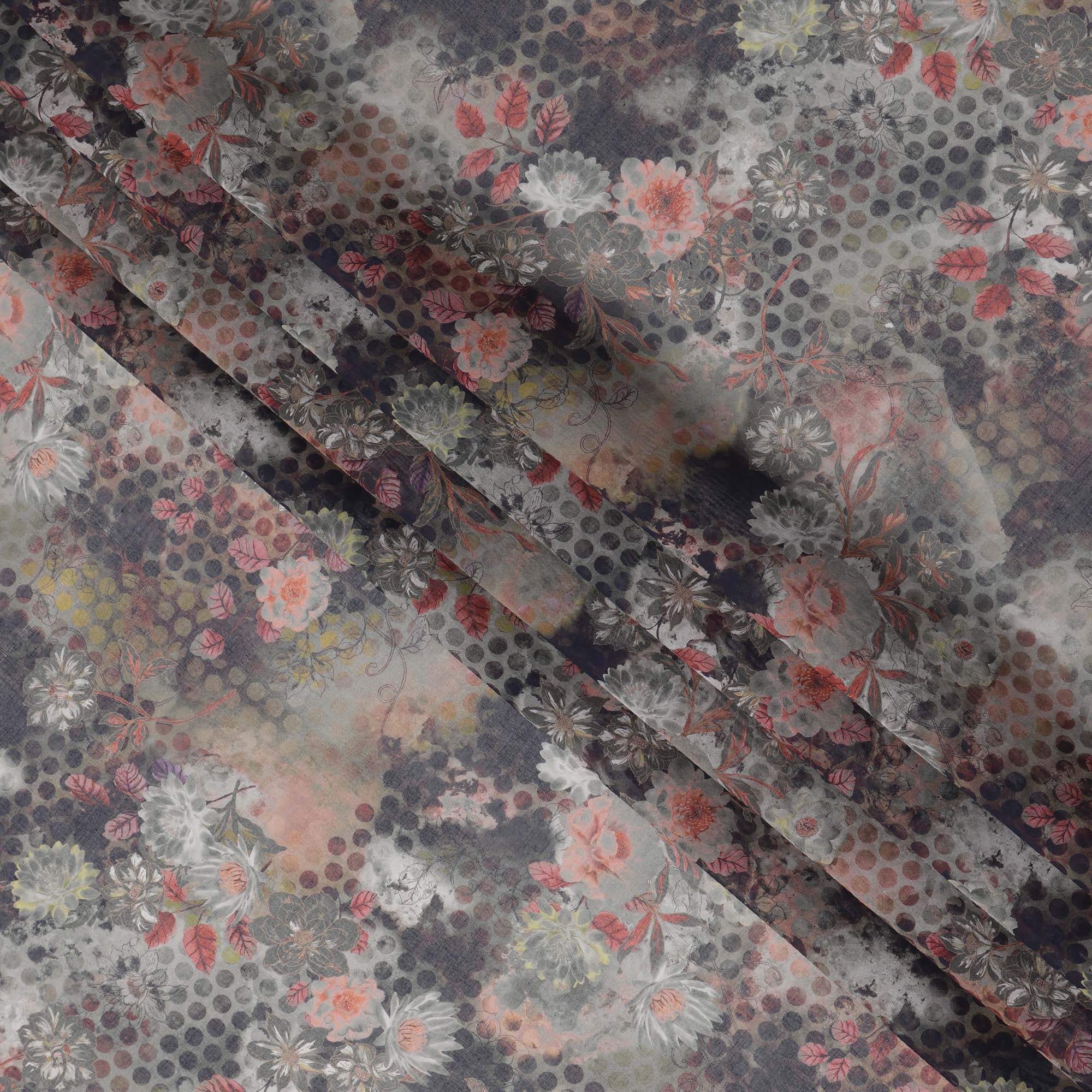 قماش قطني فوال بطبعة زهور تجريدية ونقاط بولكا بلون الفحم الباهت، عرض 140 سم، صنع في الهند - D23047