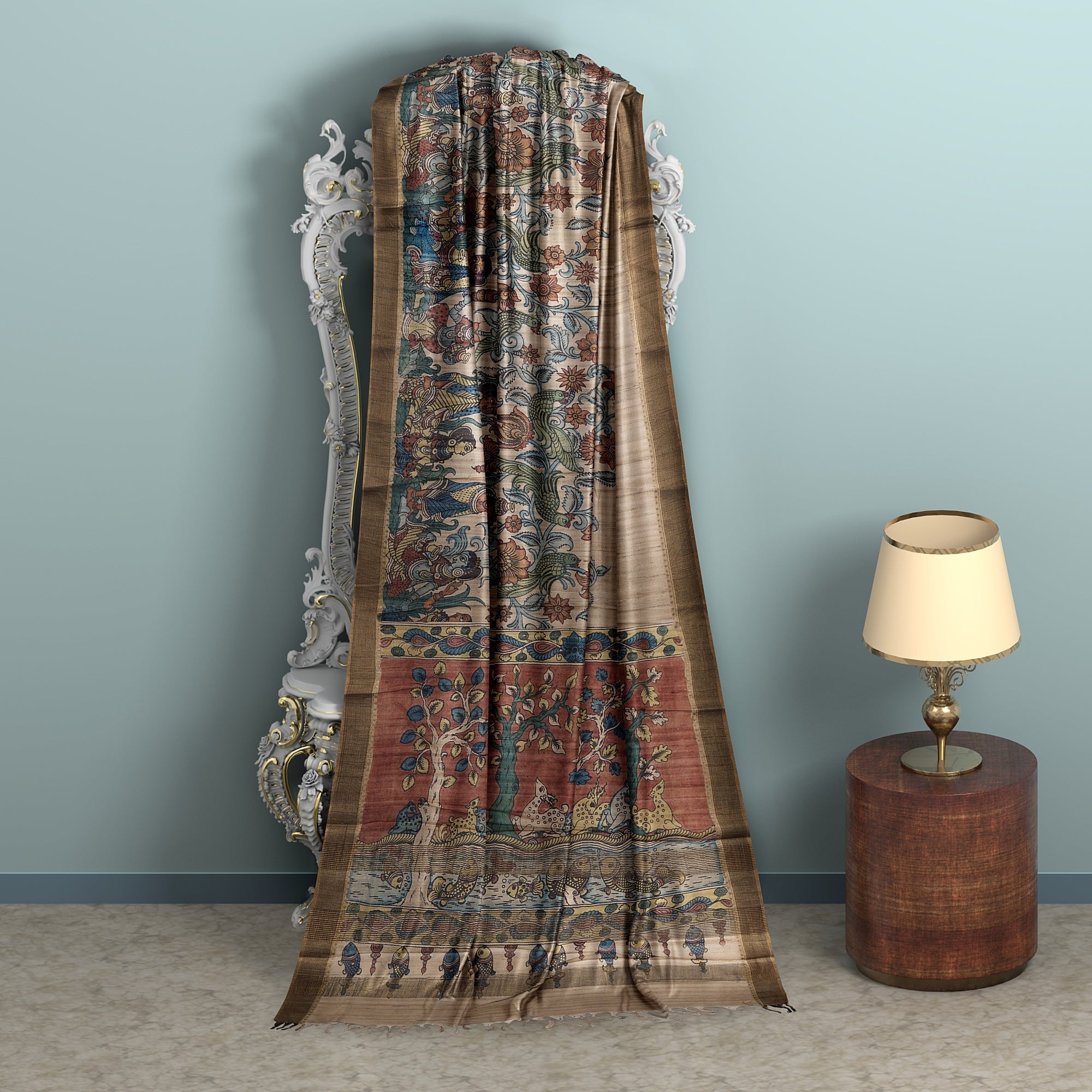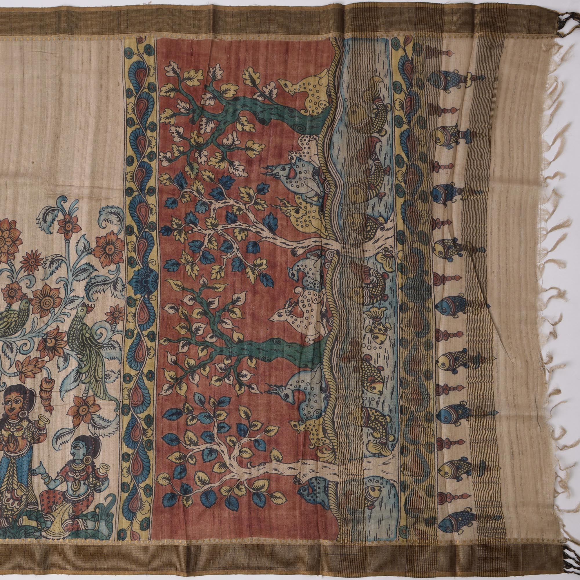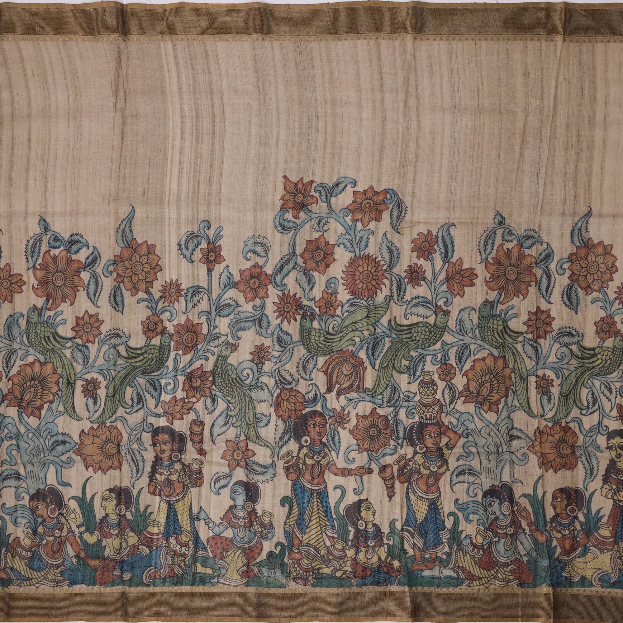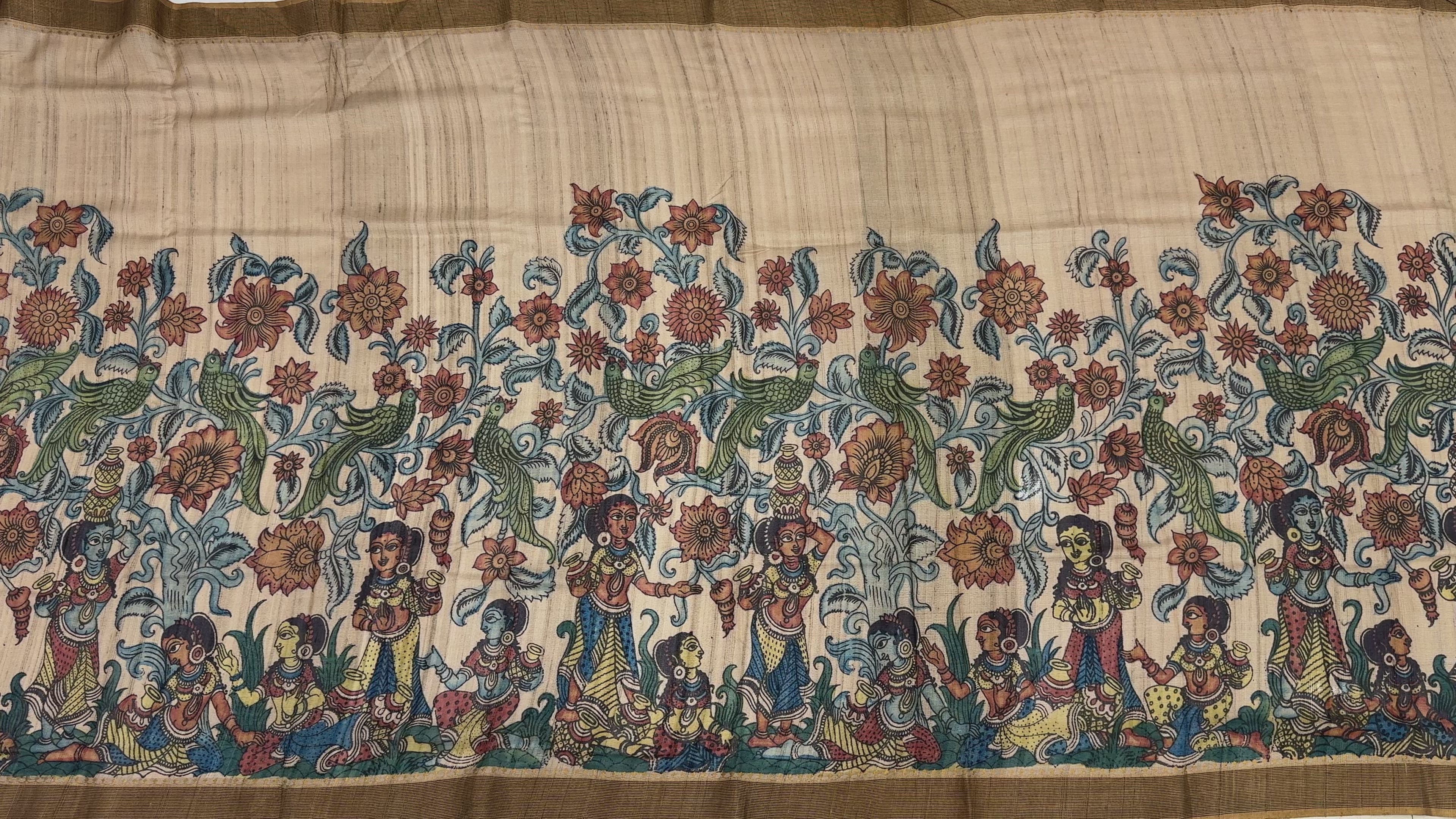 ساري كالامكاري من حرير توسار الطبيعي باللون البيج مع رسومات يدوية لمشاهد أسطورية، عرض 110 سم، أصله: سري كالاهاستي، الهند، طوله 5.5 متر مع بلوزة - D22851