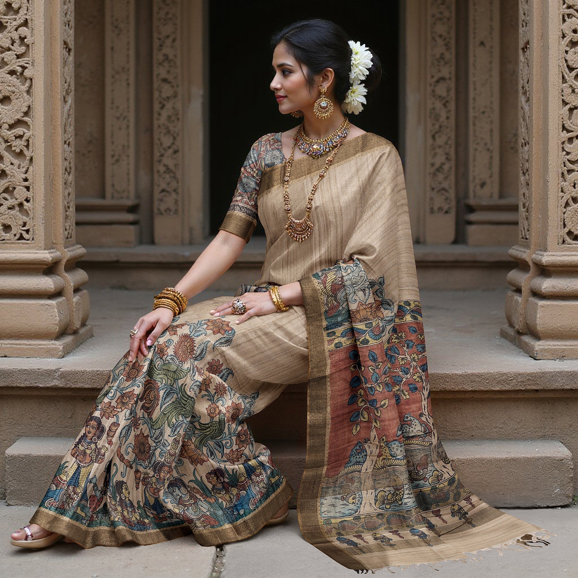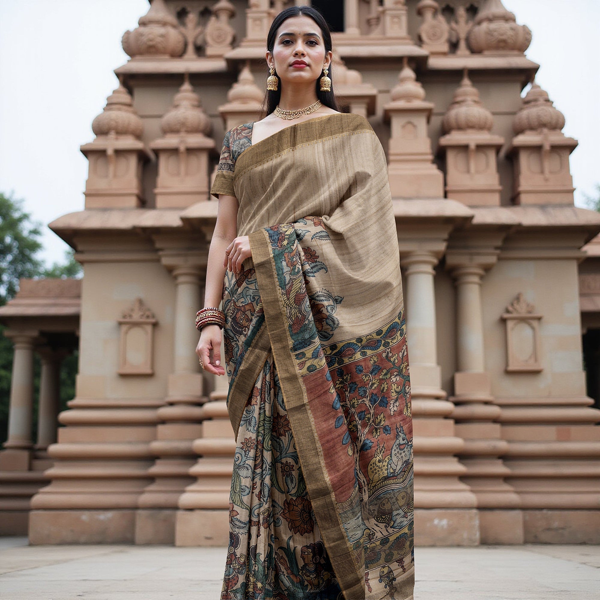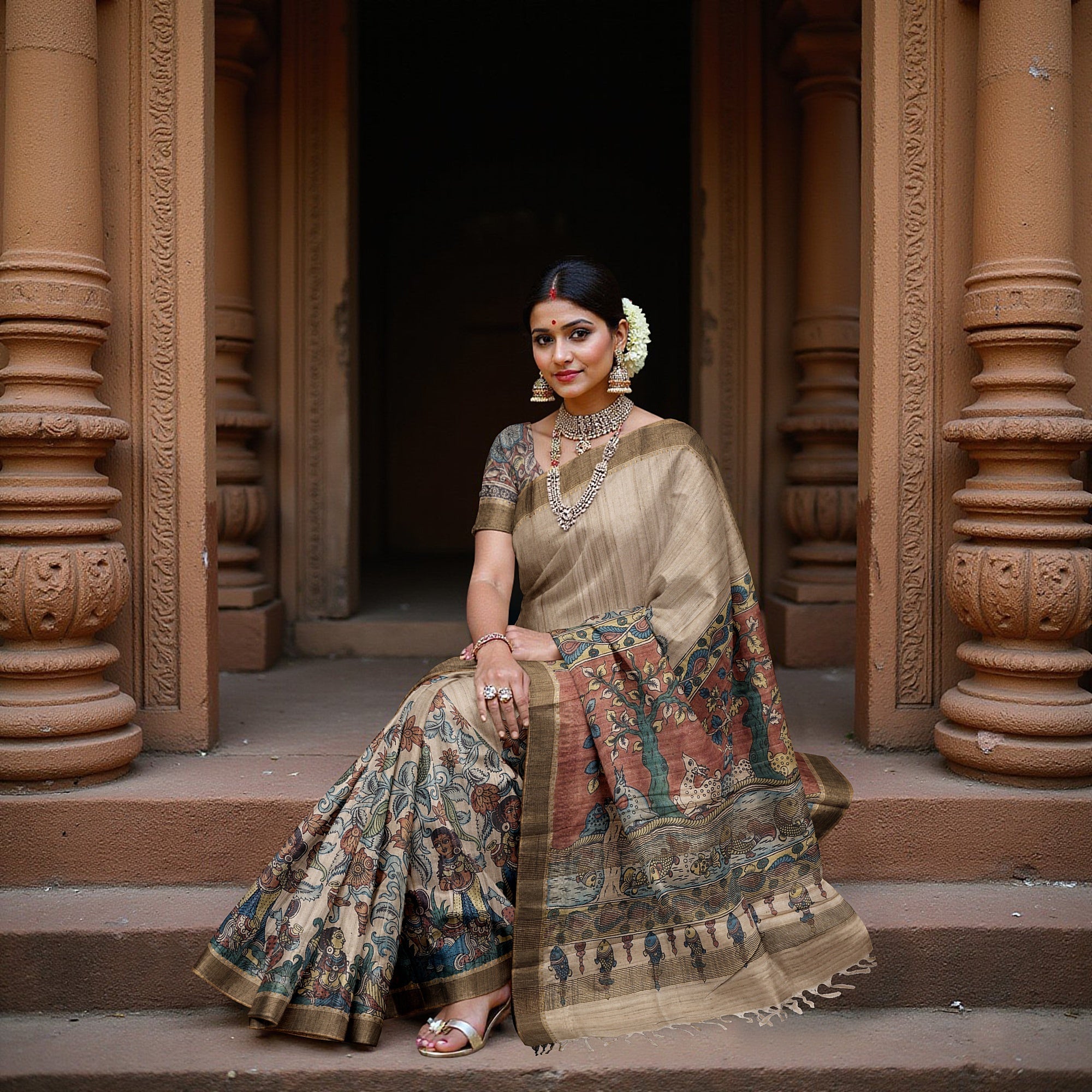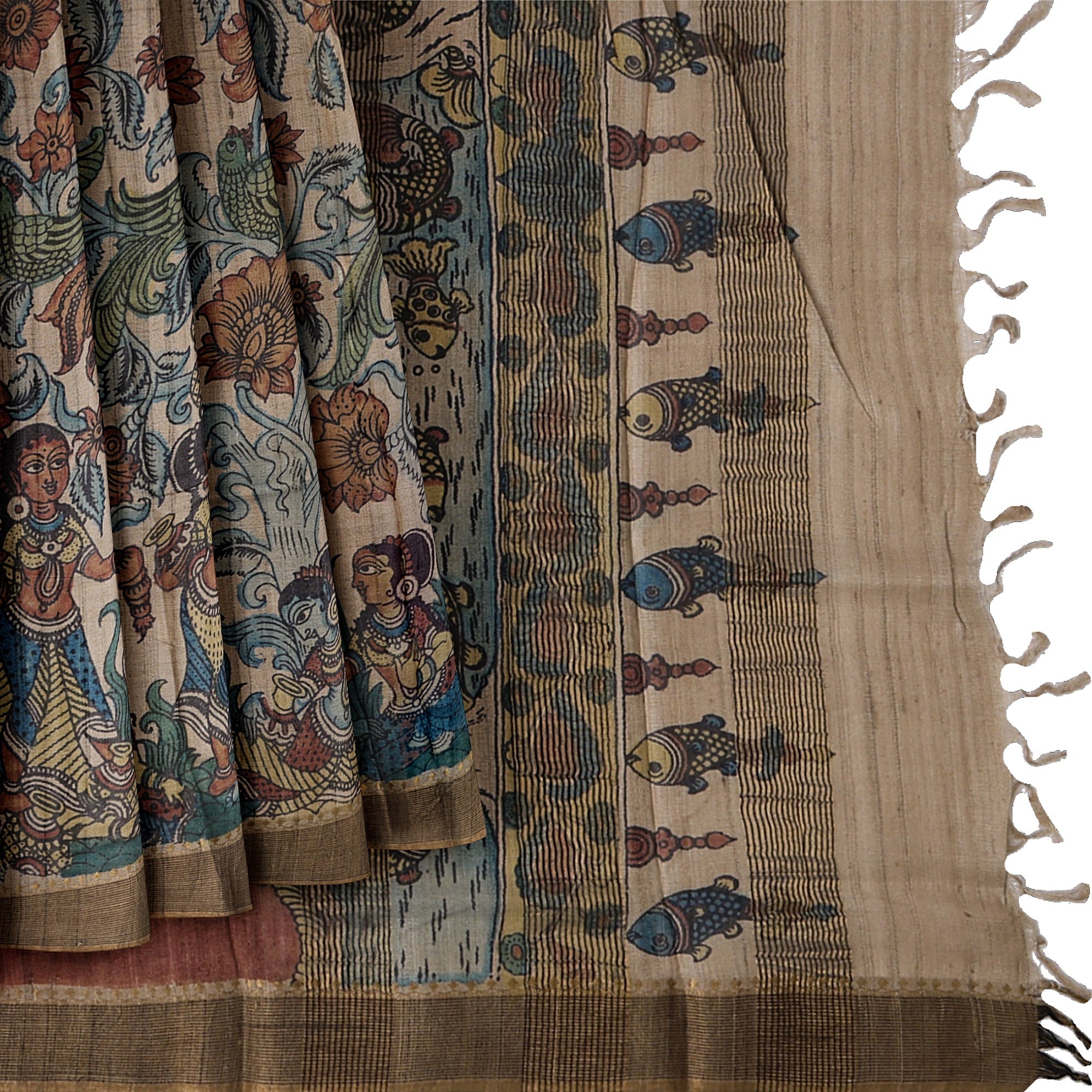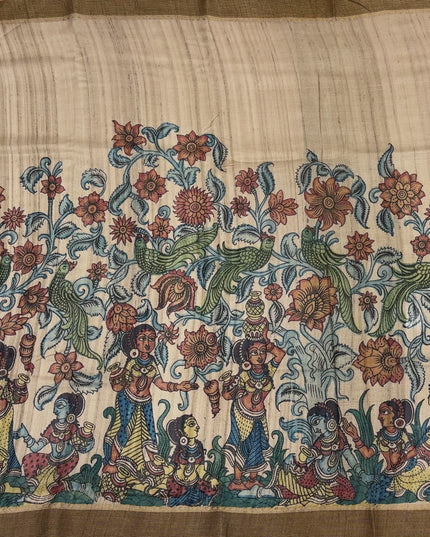 ساري كالامكاري من حرير توسار الطبيعي باللون البيج مع رسومات يدوية لمشاهد أسطورية، عرض 110 سم، أصله: سري كالاهاستي، الهند، طوله 5.5 متر مع بلوزة - D22851