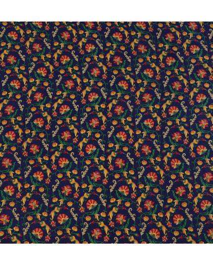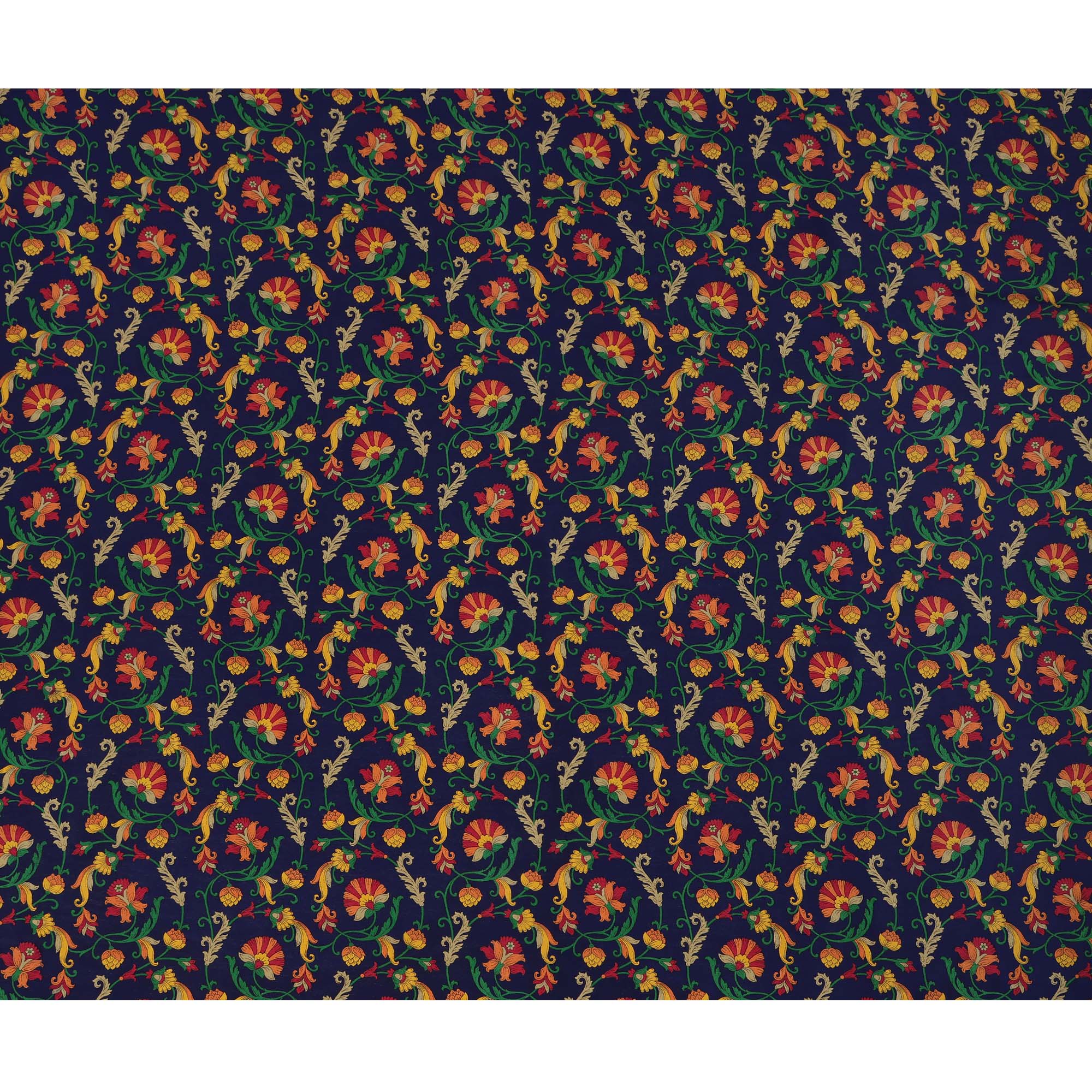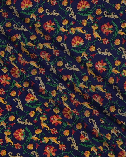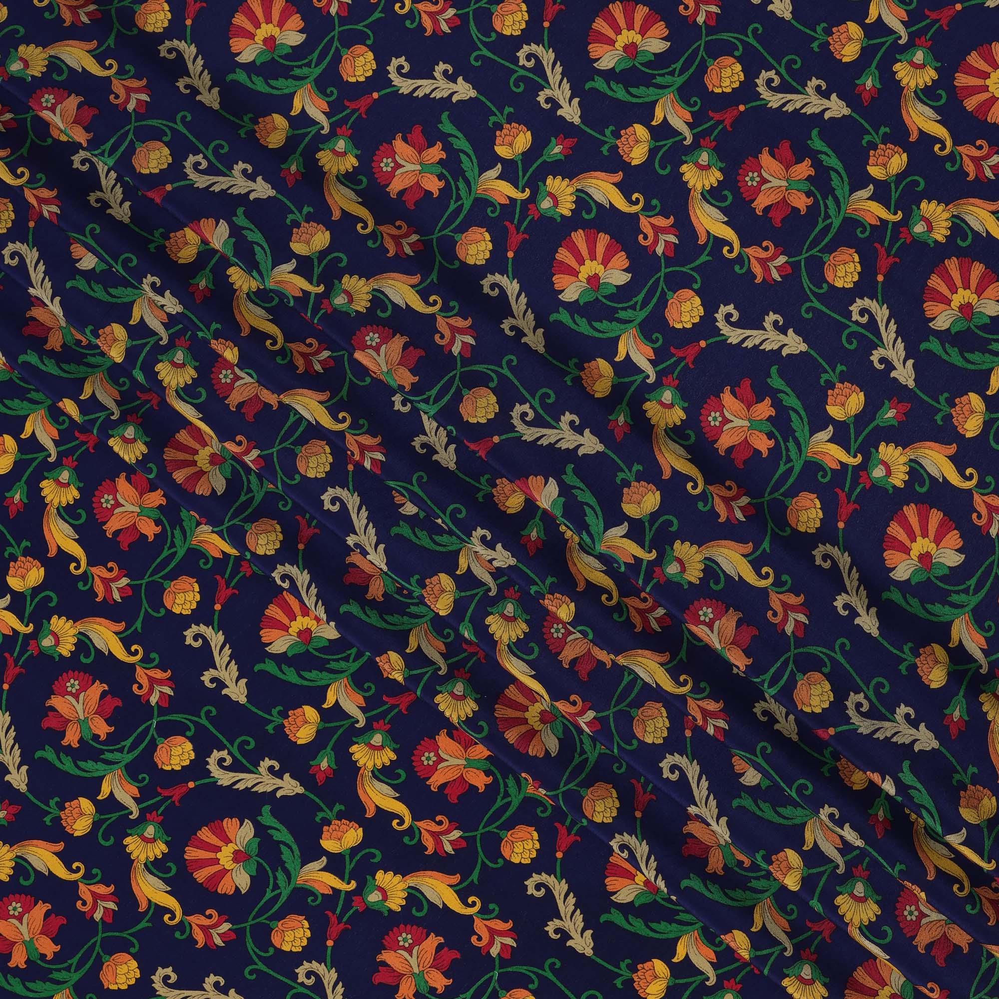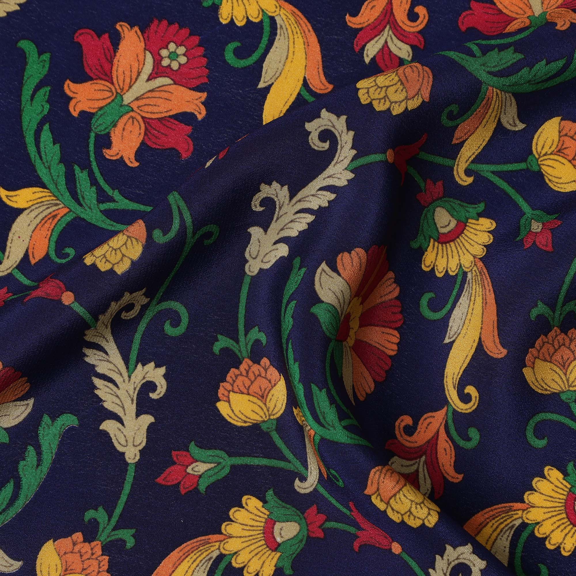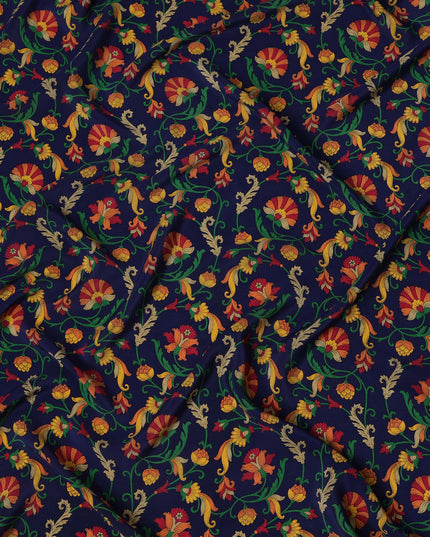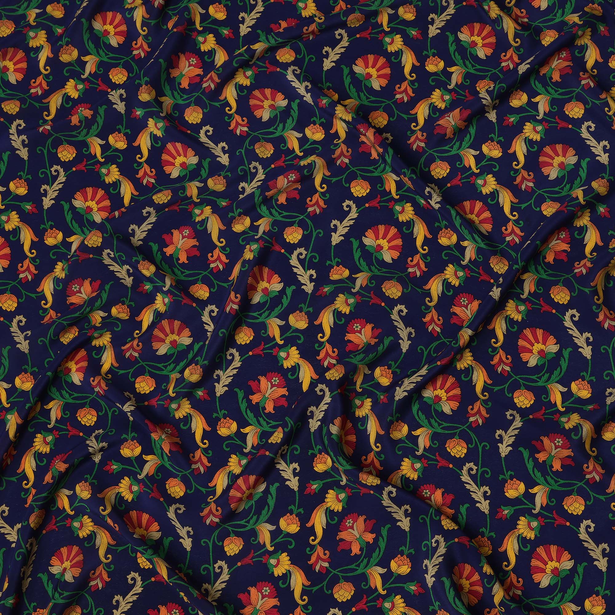 قماش كريب حريري خالص بقاعدة زرقاء داكنة مع طباعة زخارف نباتية تقليدية متعددة الألوان، عرض 110 سم، صنع في الهند - D23184