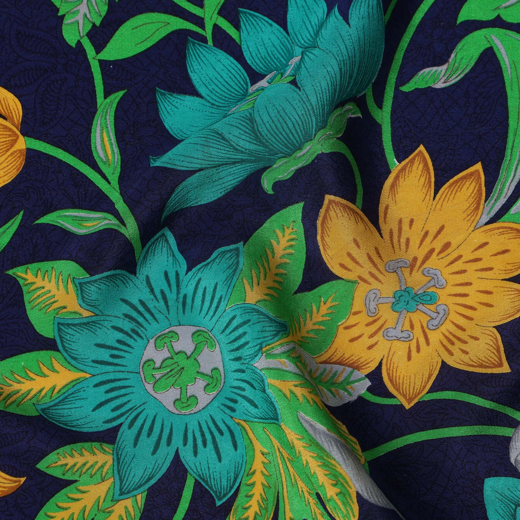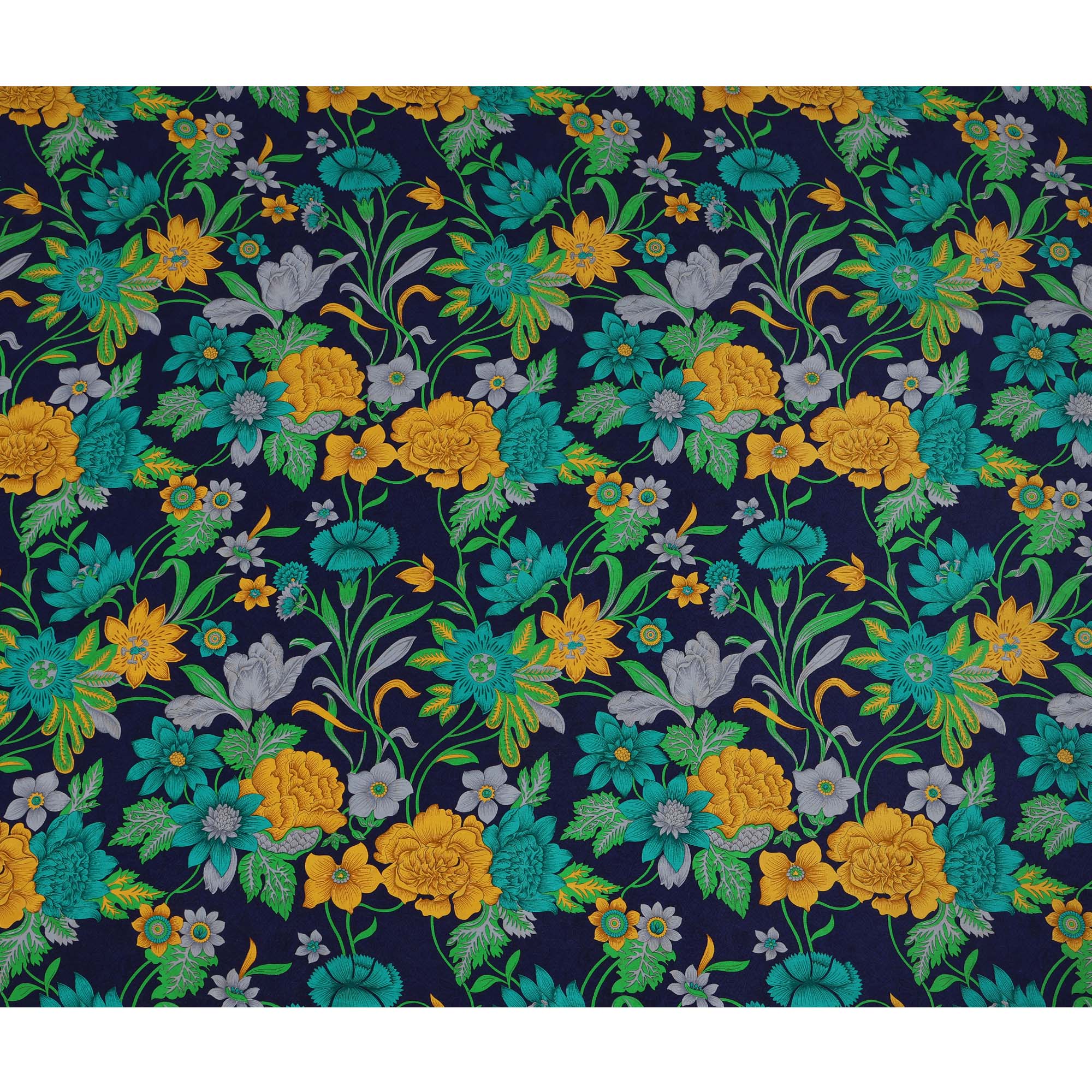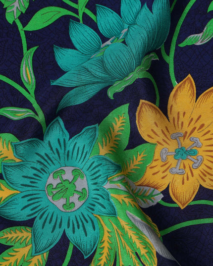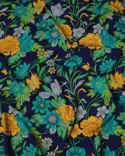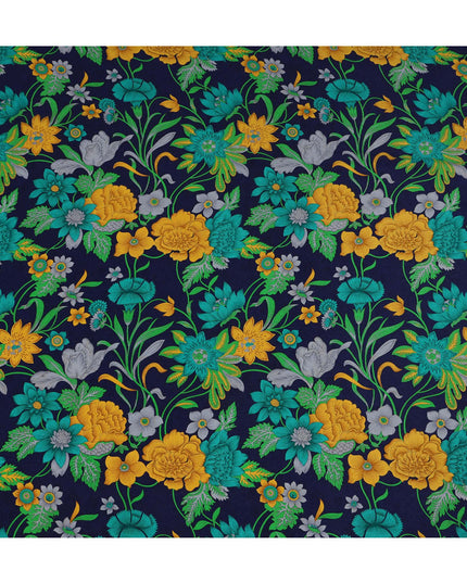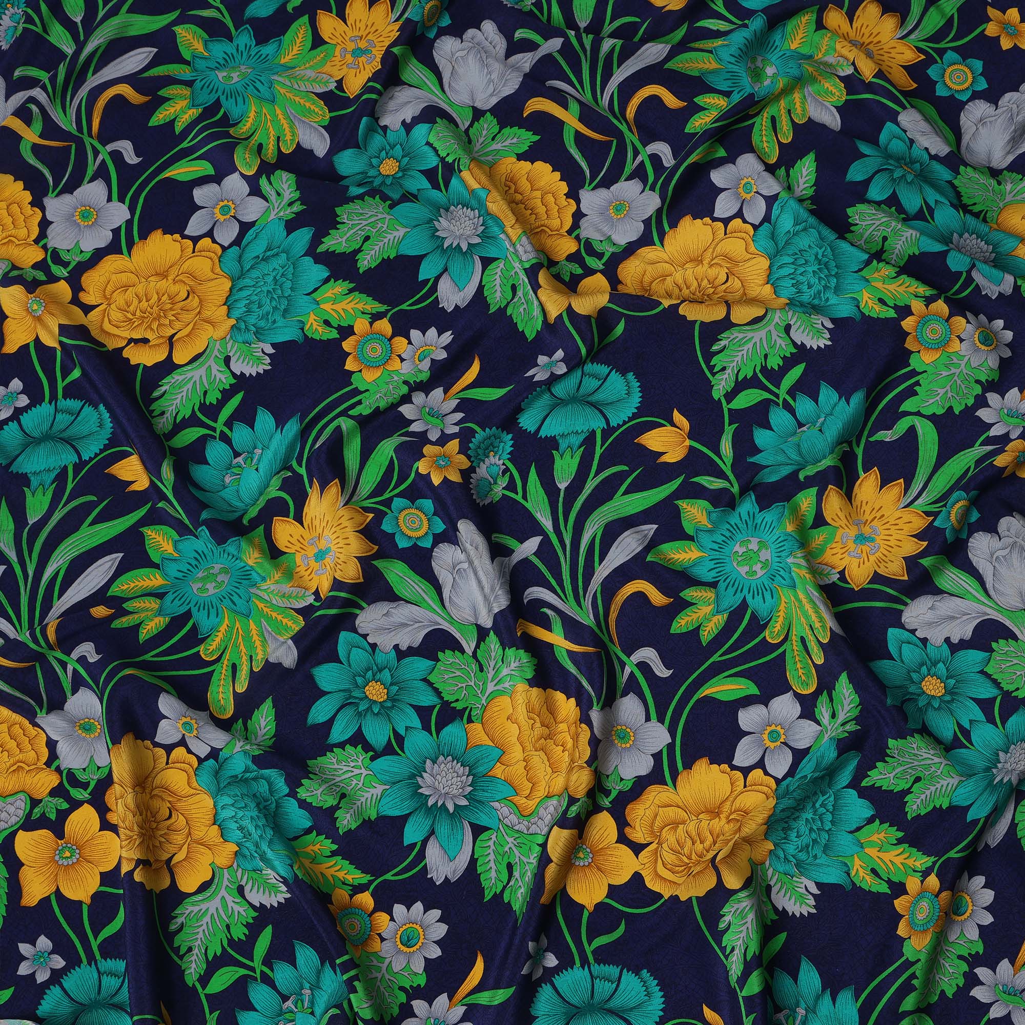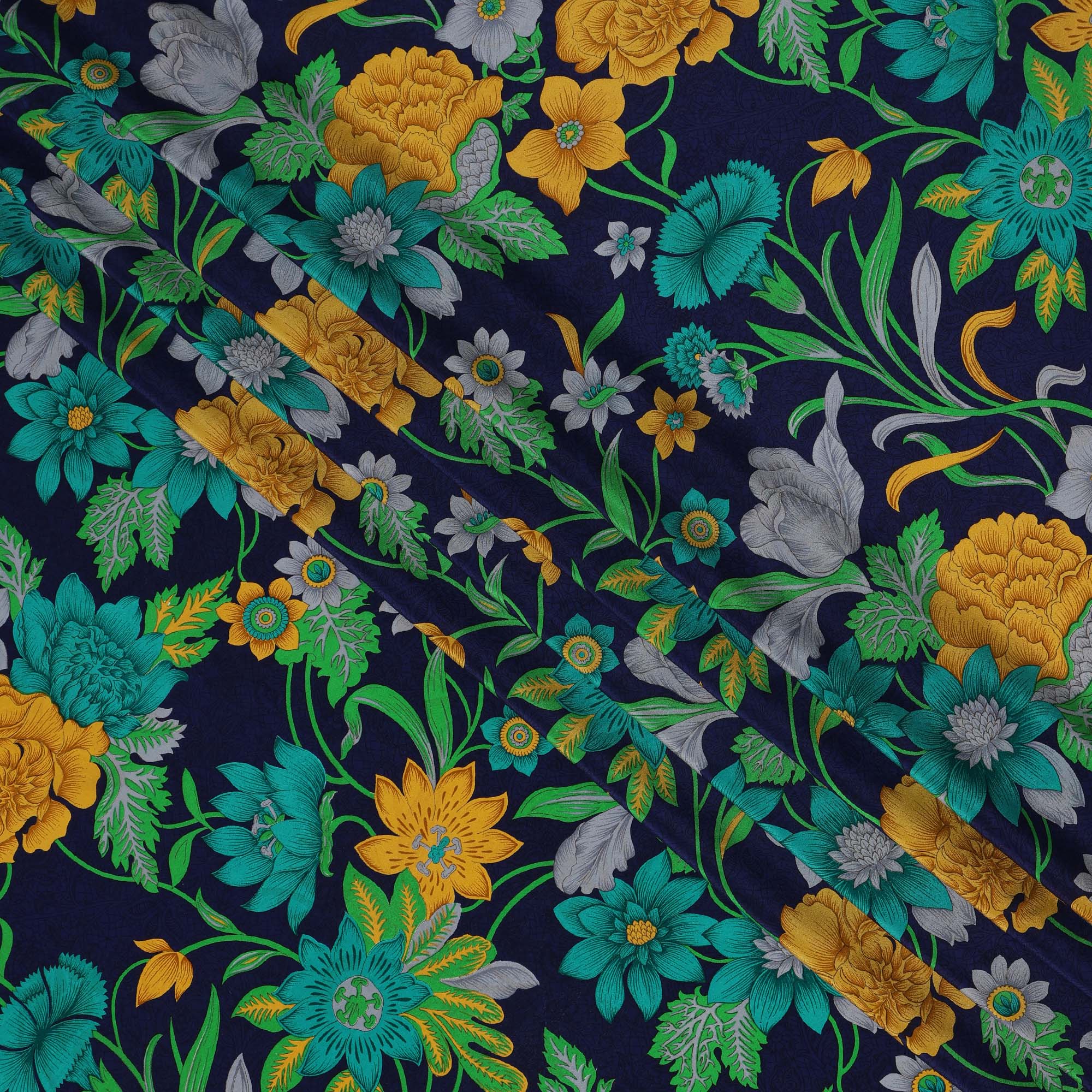 قماش كريب حريري خالص بقاعدة زرقاء داكنة مع طباعة زهرية جريئة باللون الأصفر والأزرق المخضر والرمادي، عرض 110 سم، صنع في الهند - D23185