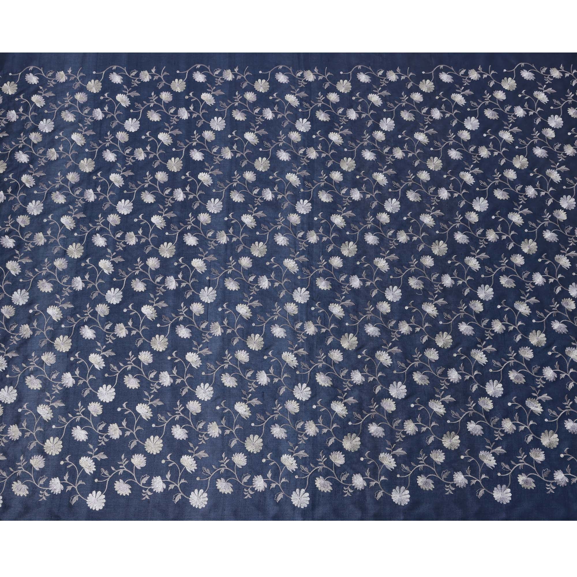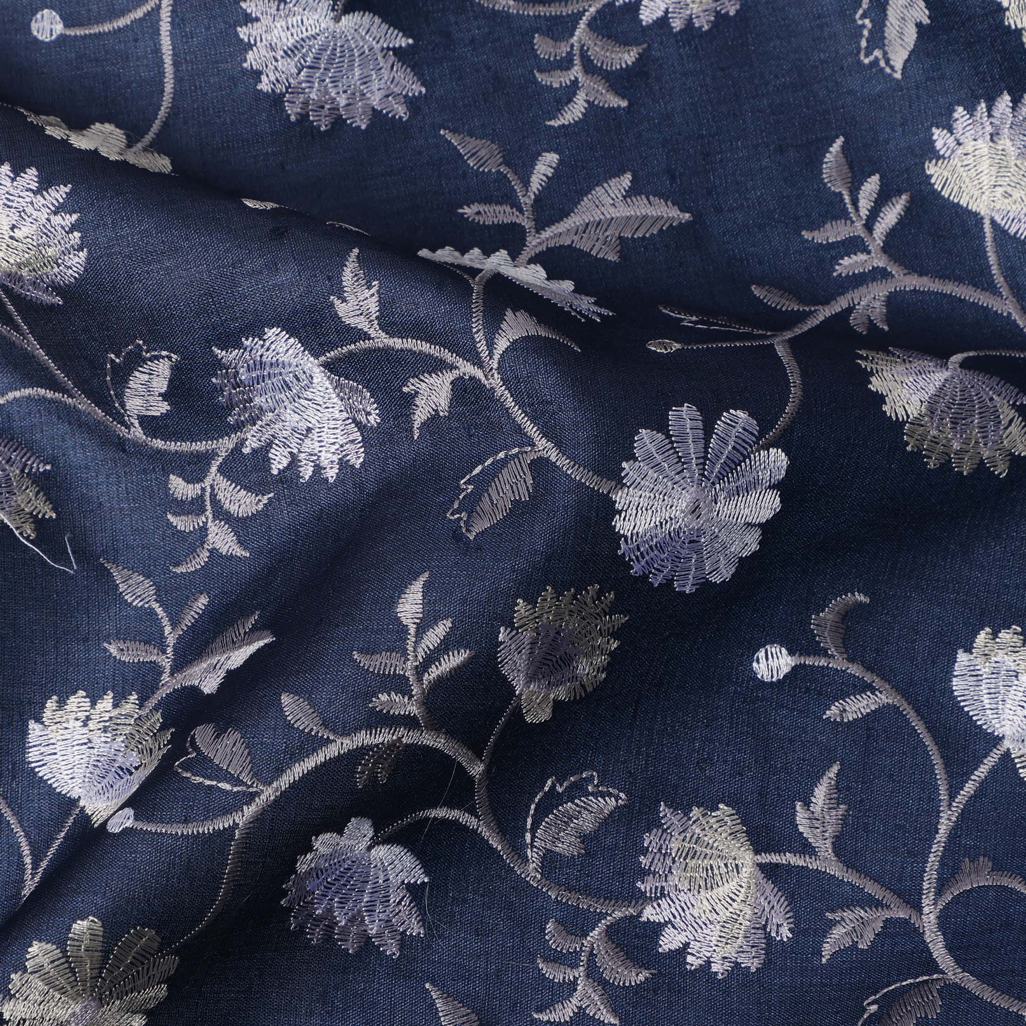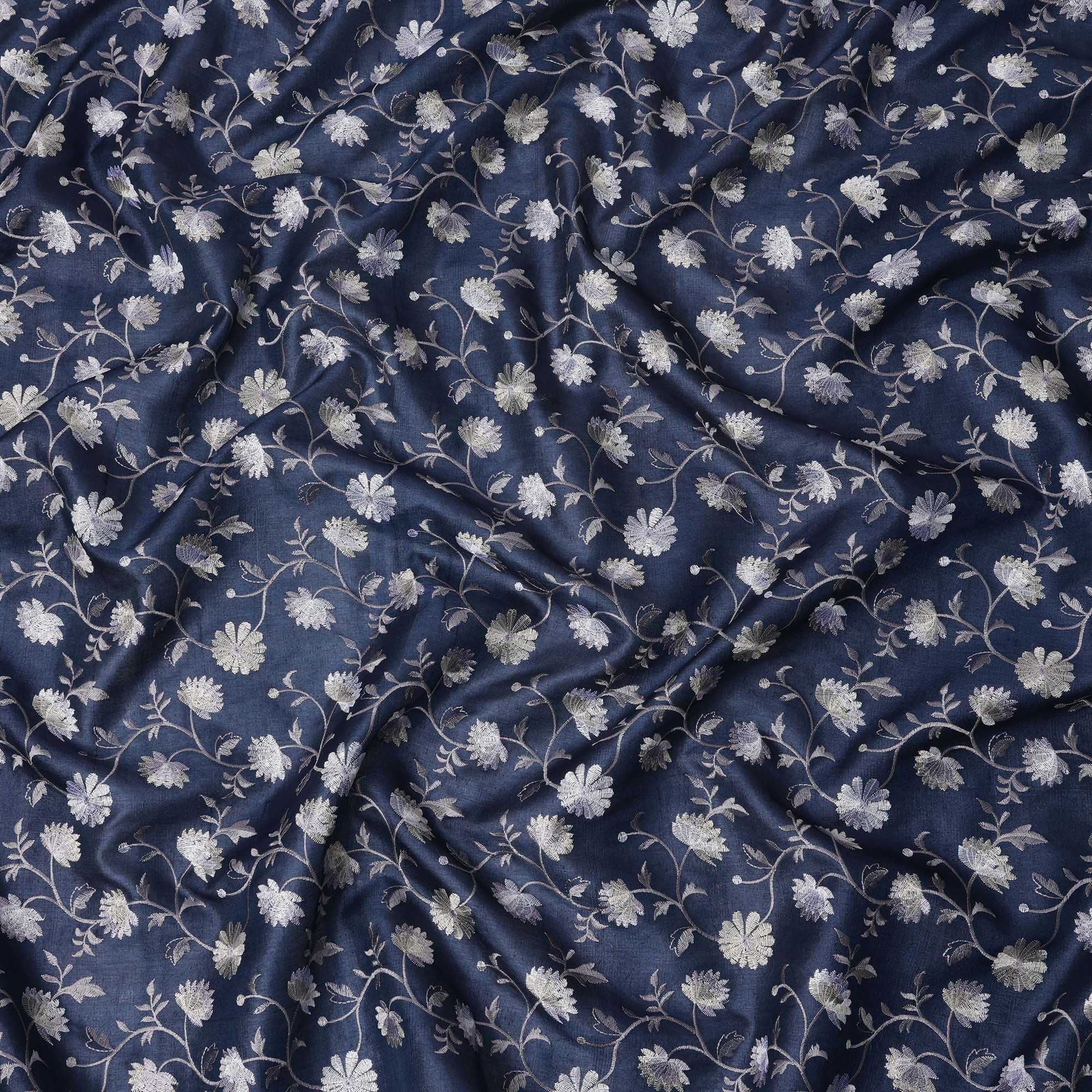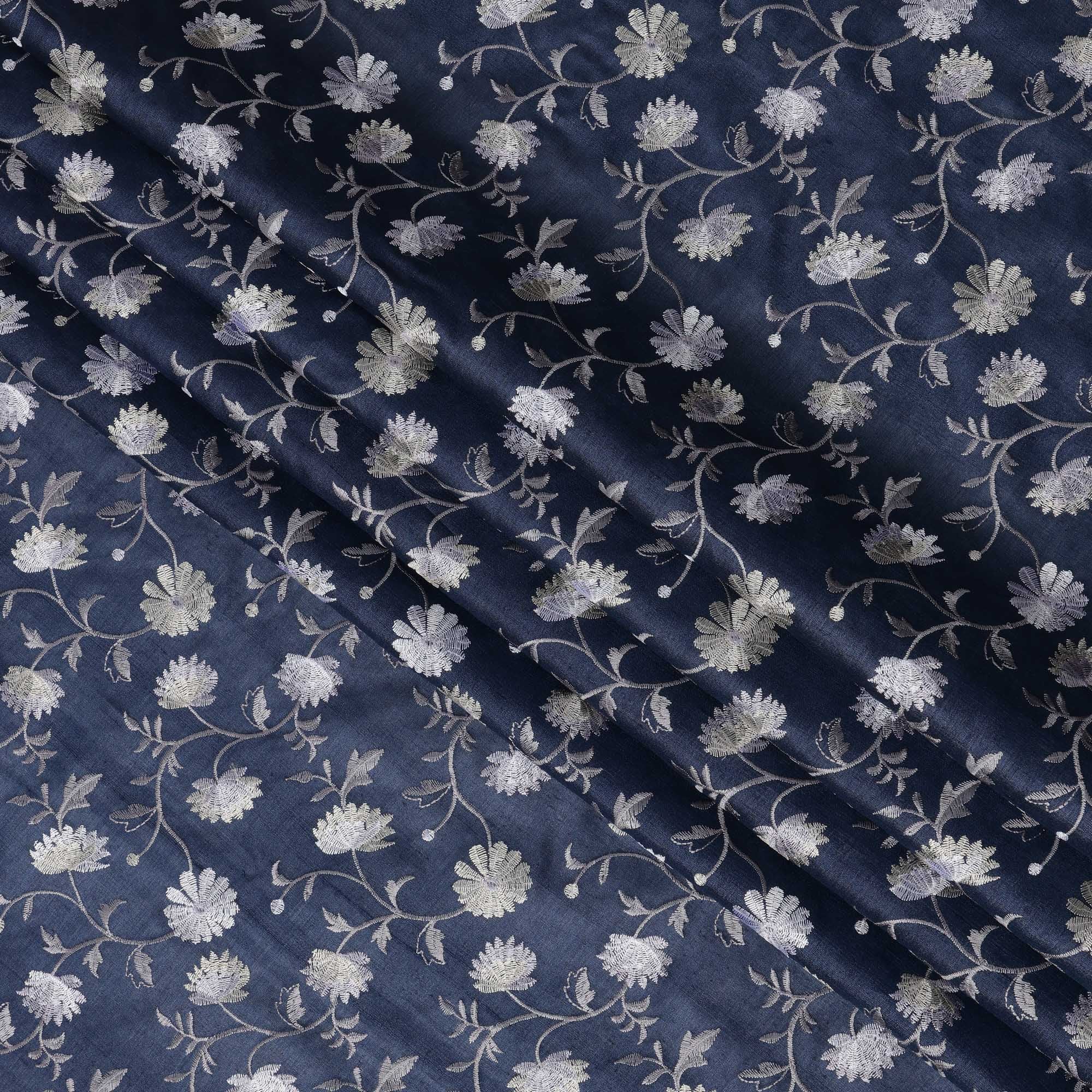 قماش حرير توسار مطرز بنقشة زهور باللون الأزرق الداكن، عرض 110 سم، منشأ الهند - D23375