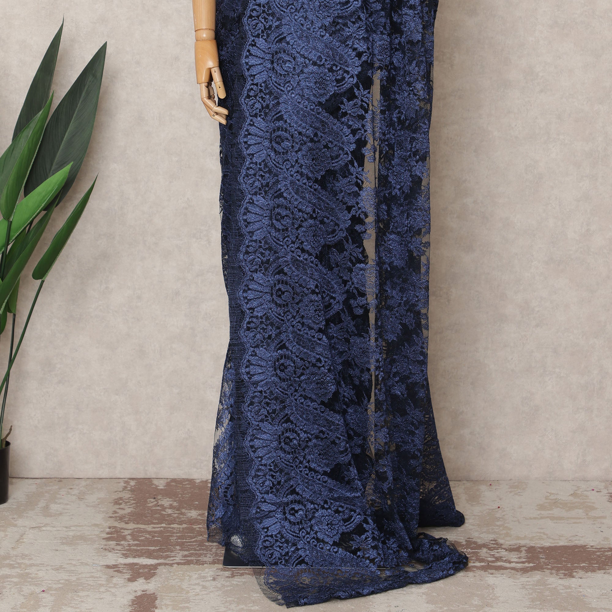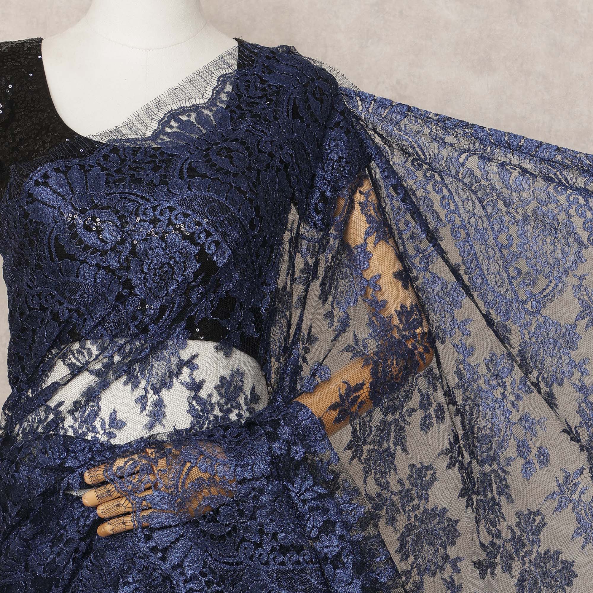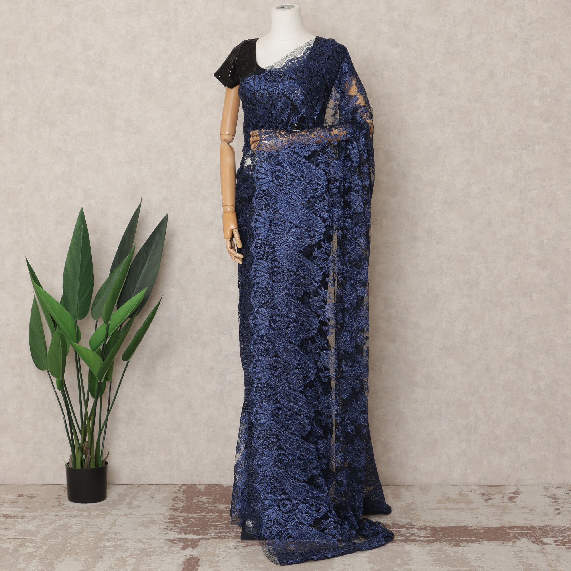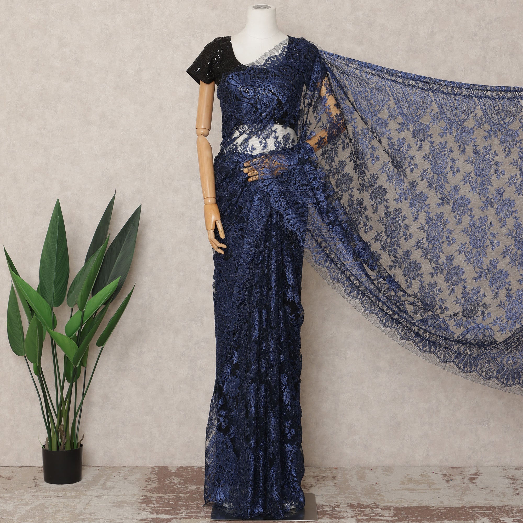 قماش ساري شانتيلي فرنسي فاخر باللون الأزرق الداكن، بطول ٥.٥ متر تقريبًا، وعرض ١١٠ سم، صنع في فرنسا - D24082
