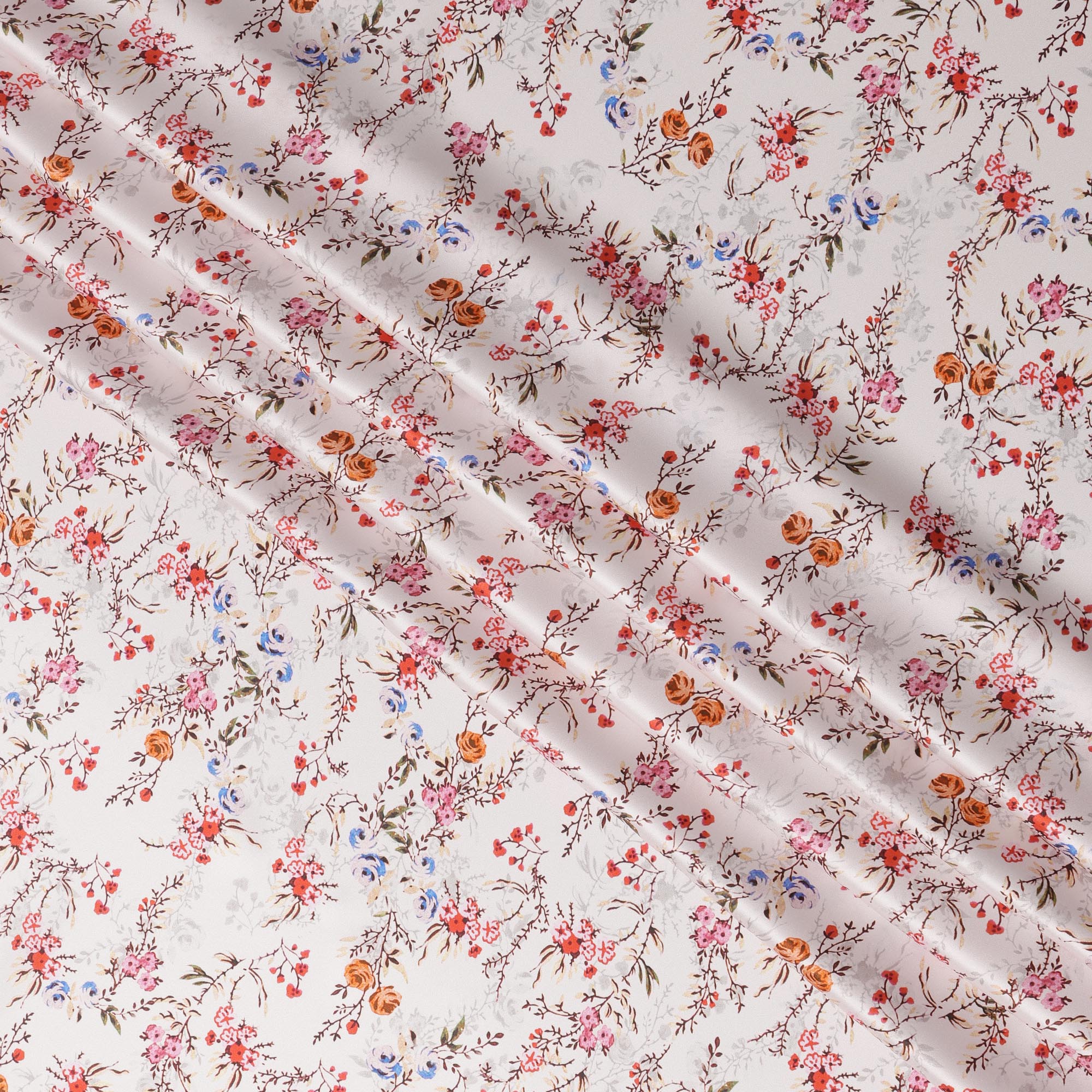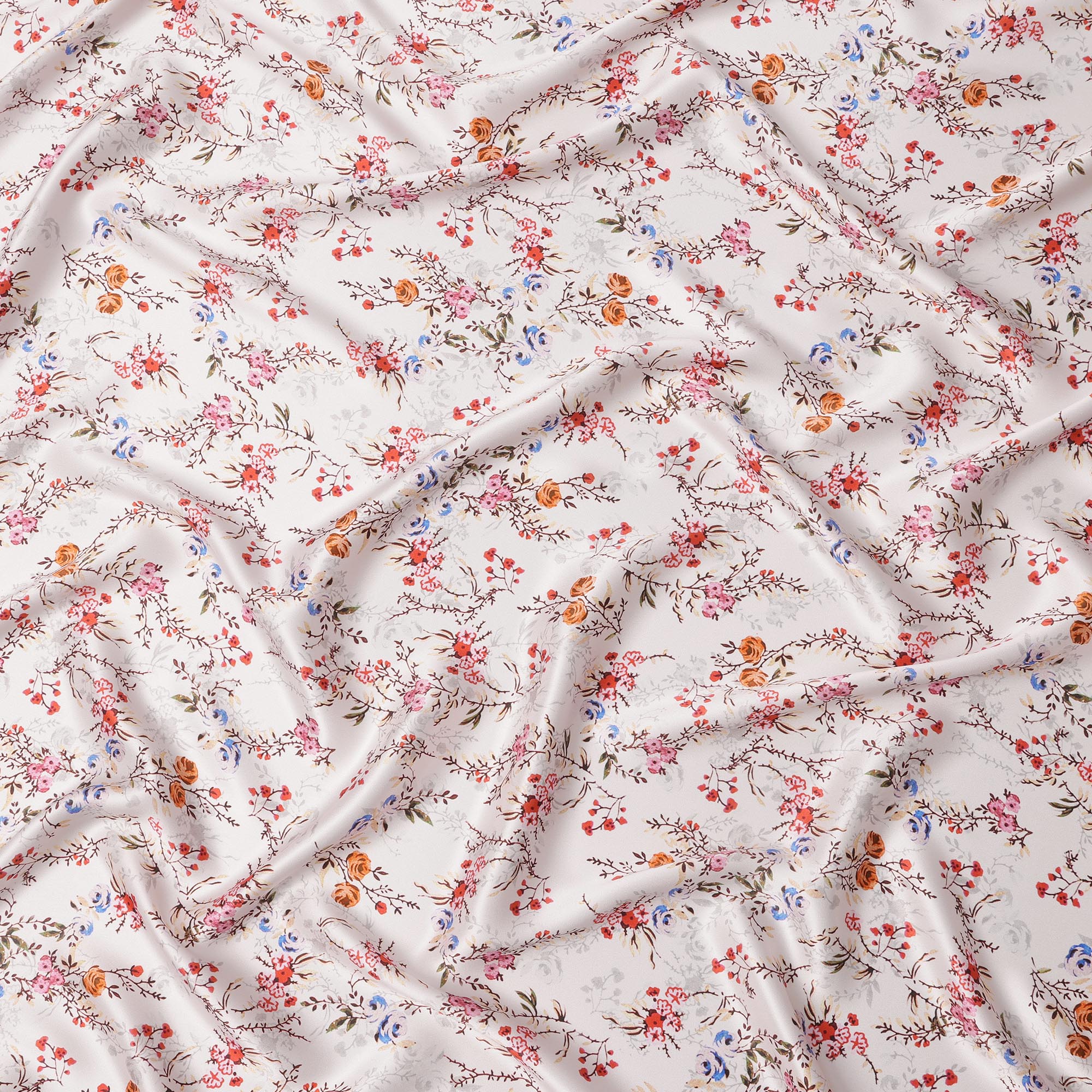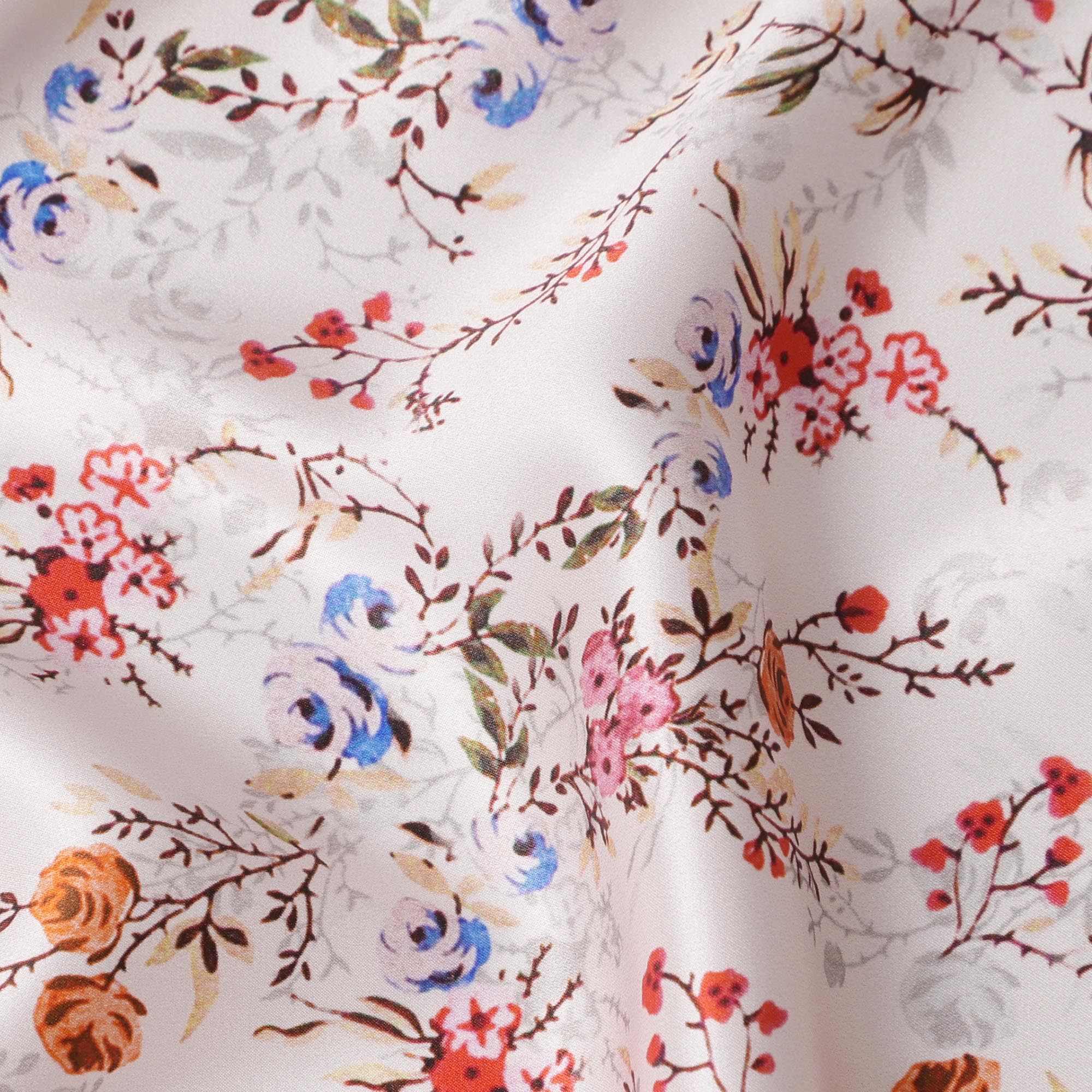 قماش حرير ساتان إيطالي فاخر بقاعدة بيضاء عاجي مع طباعة زهور صغيرة باللون الأحمر والأزرق والبيج، عرض 140 سم، صنع في إيطاليا - D22988