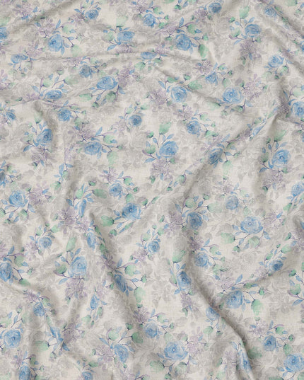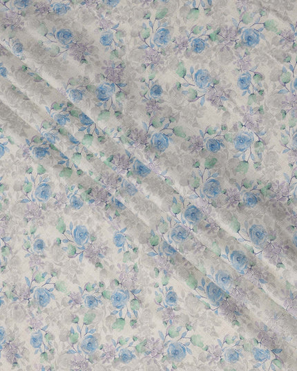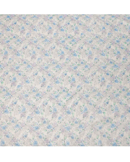قماش كريب حريري أبيض عاجي مطبوع رقميًا بنقشة زهور مع زخارف وردية زرقاء وأرجوانية، 110 سم، الهند - D23388
