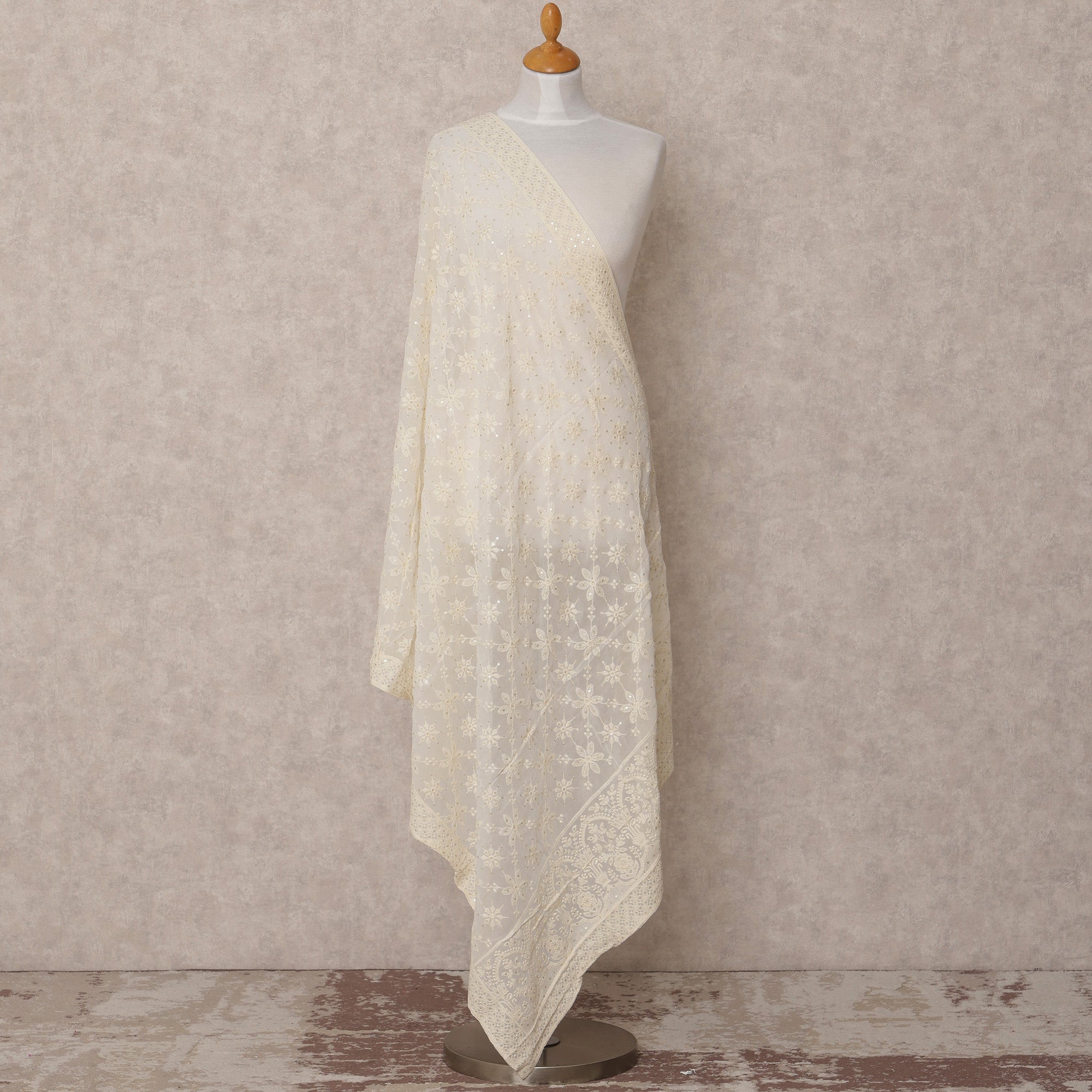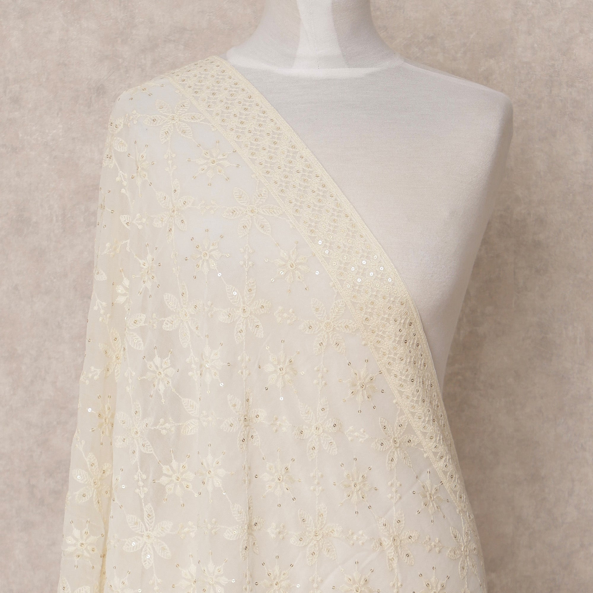 دوباتا جورجيت صناعي مطرزة بالورود باللون الأبيض العاجي مع لمسات من الترتر، مقاس 210×90 سم، الهند - D24841