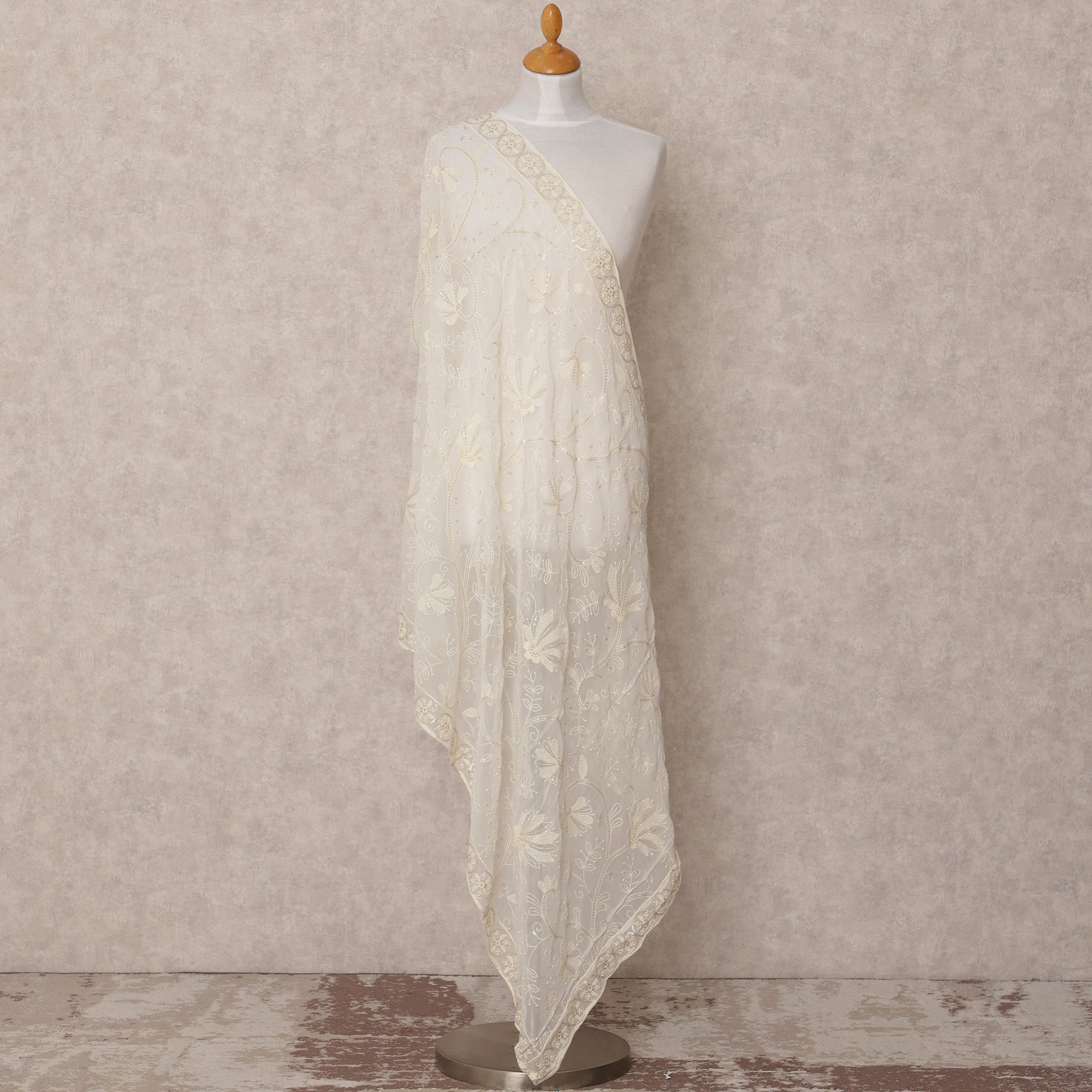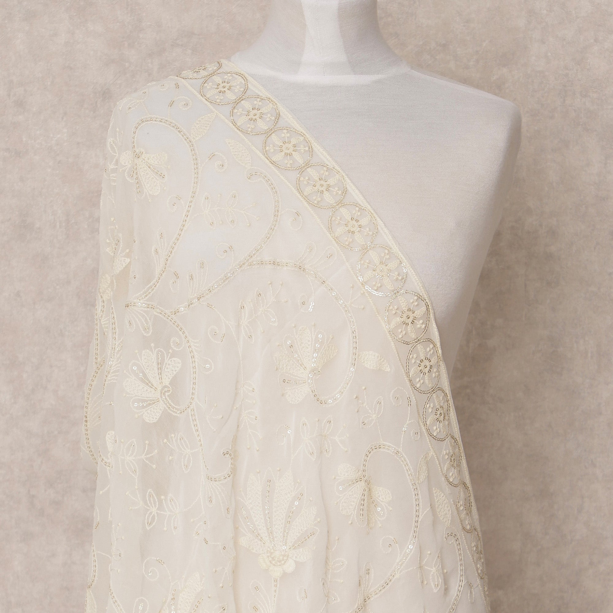 دوباتا جورجيت صناعي مطرزة بالورود باللون الأبيض العاجي مع تفاصيل الترتر، مقاس 210×90 سم، الهند - D24842
