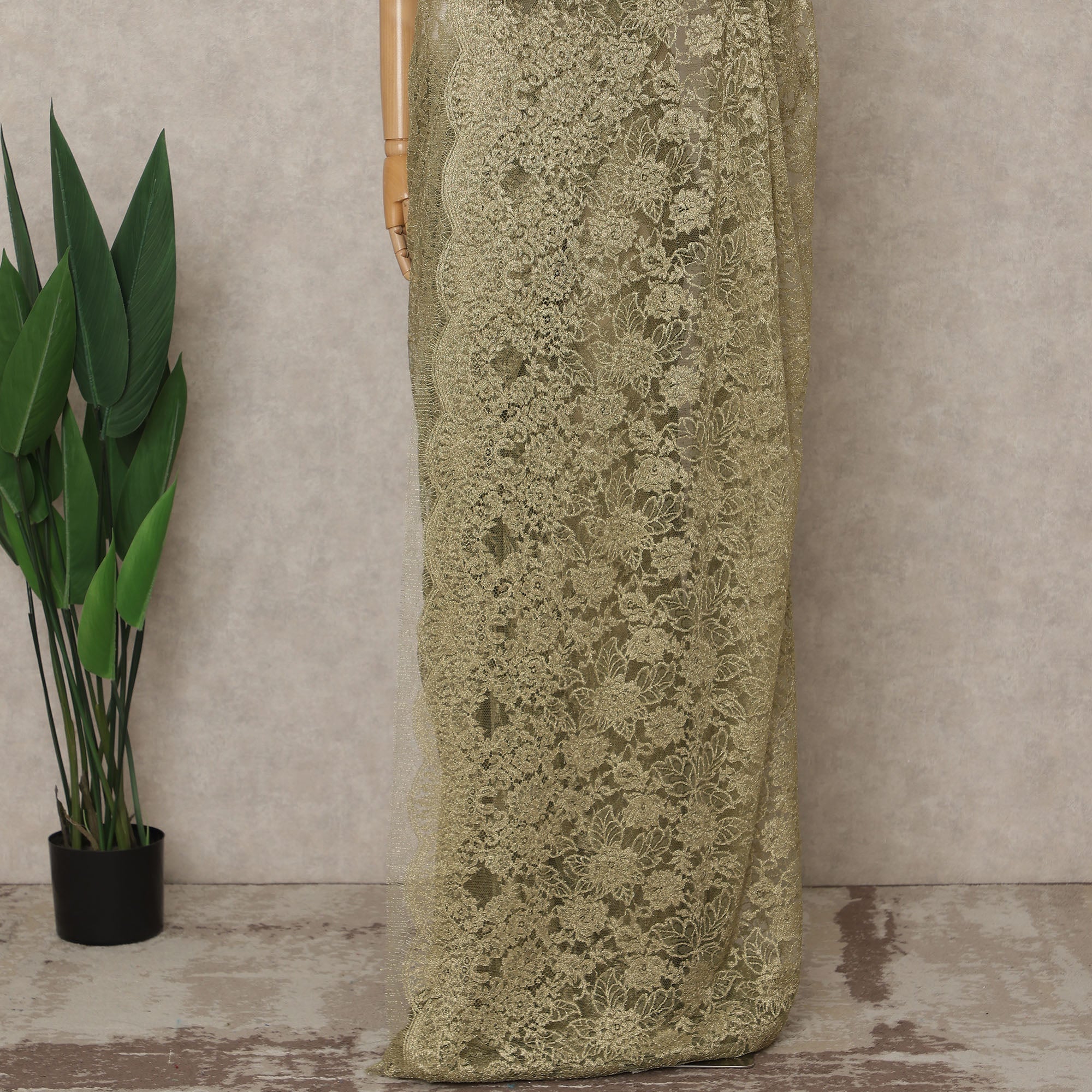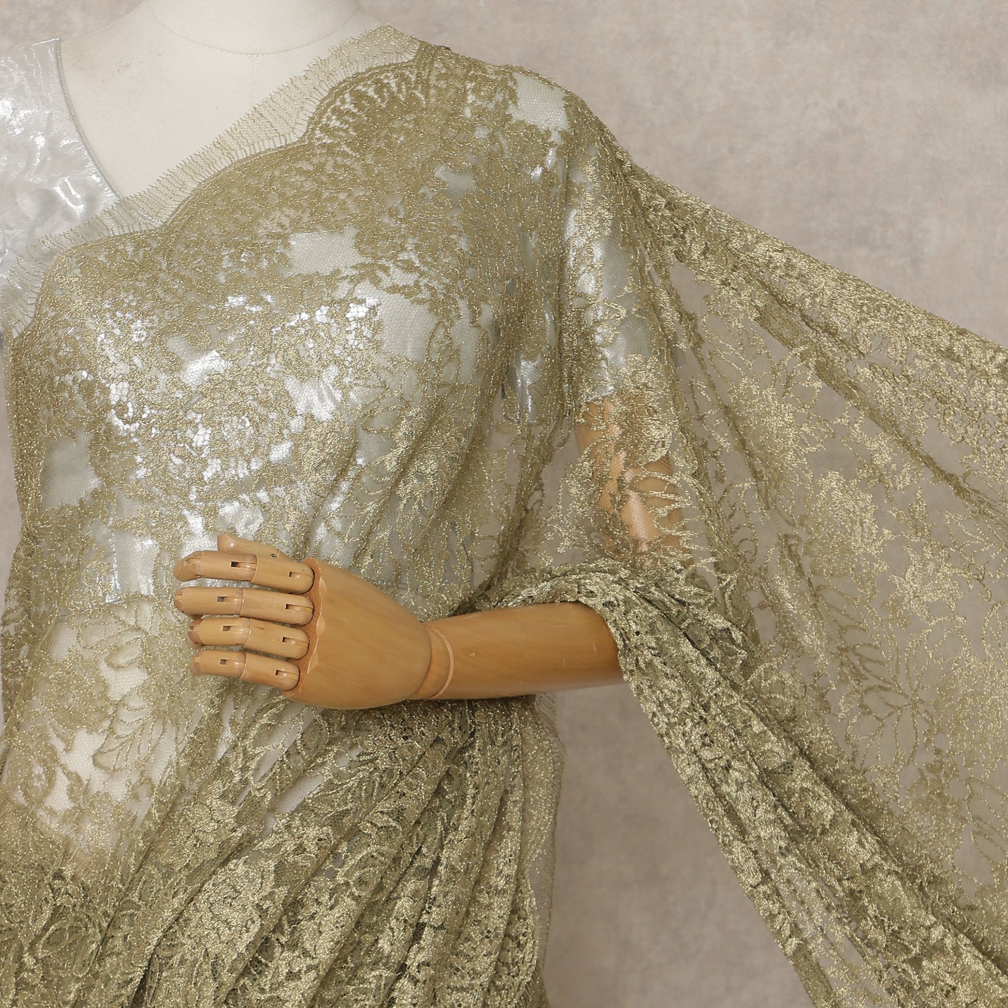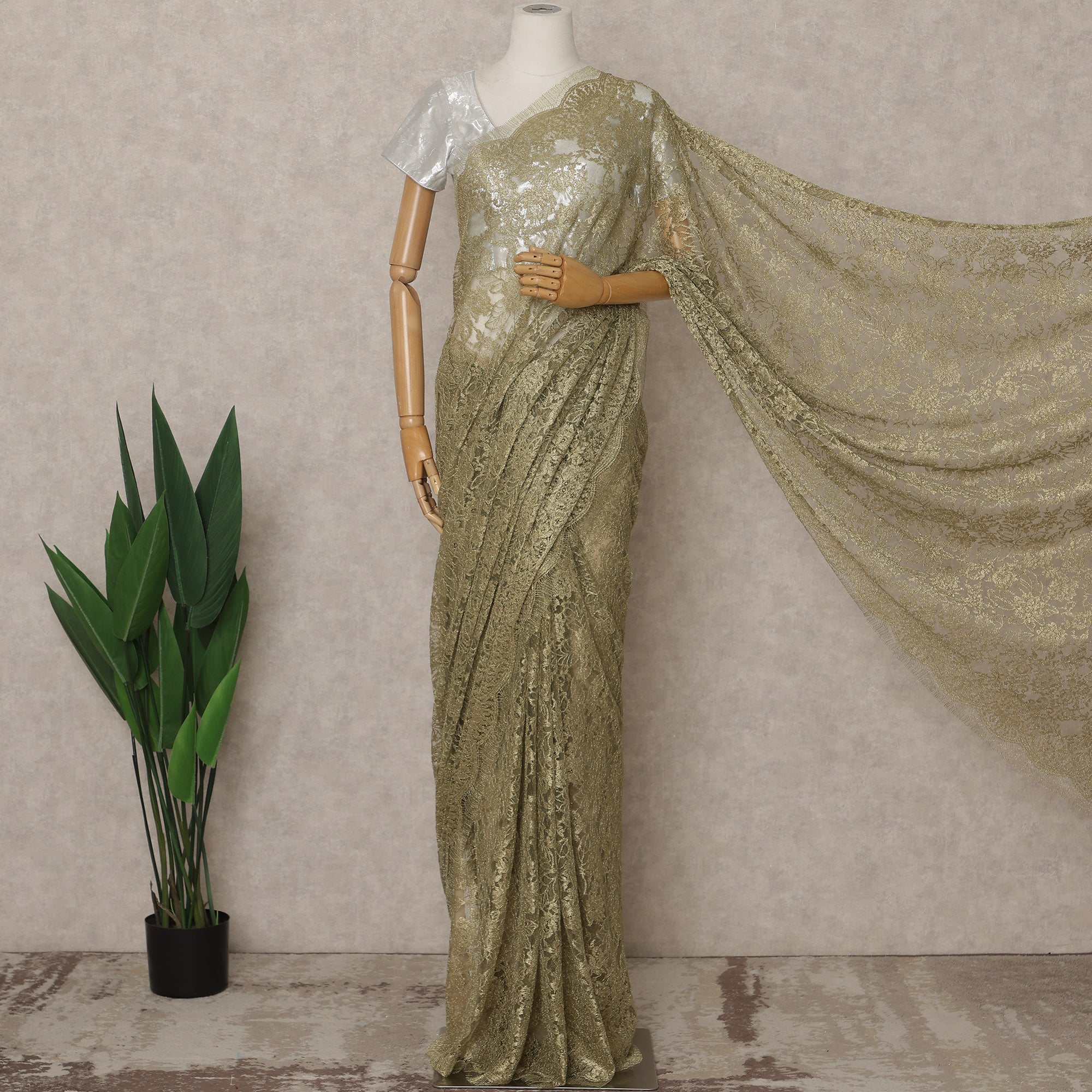 Olive Brass Premium French Metallic Chantilly Lace Saree – 5.5 Meters Fabric Length, Width 110 cm, Imported from France & Blouse Not Included-D26580