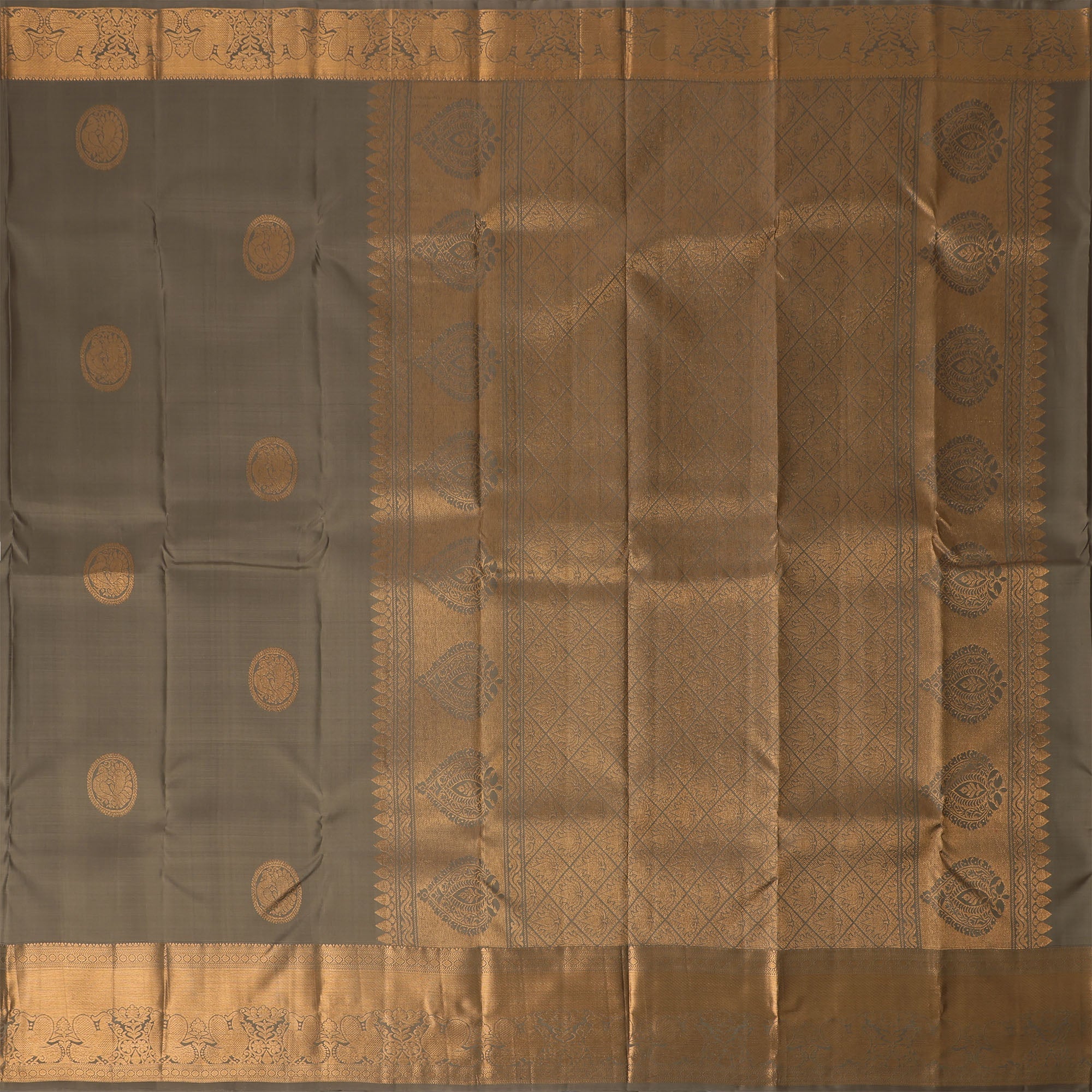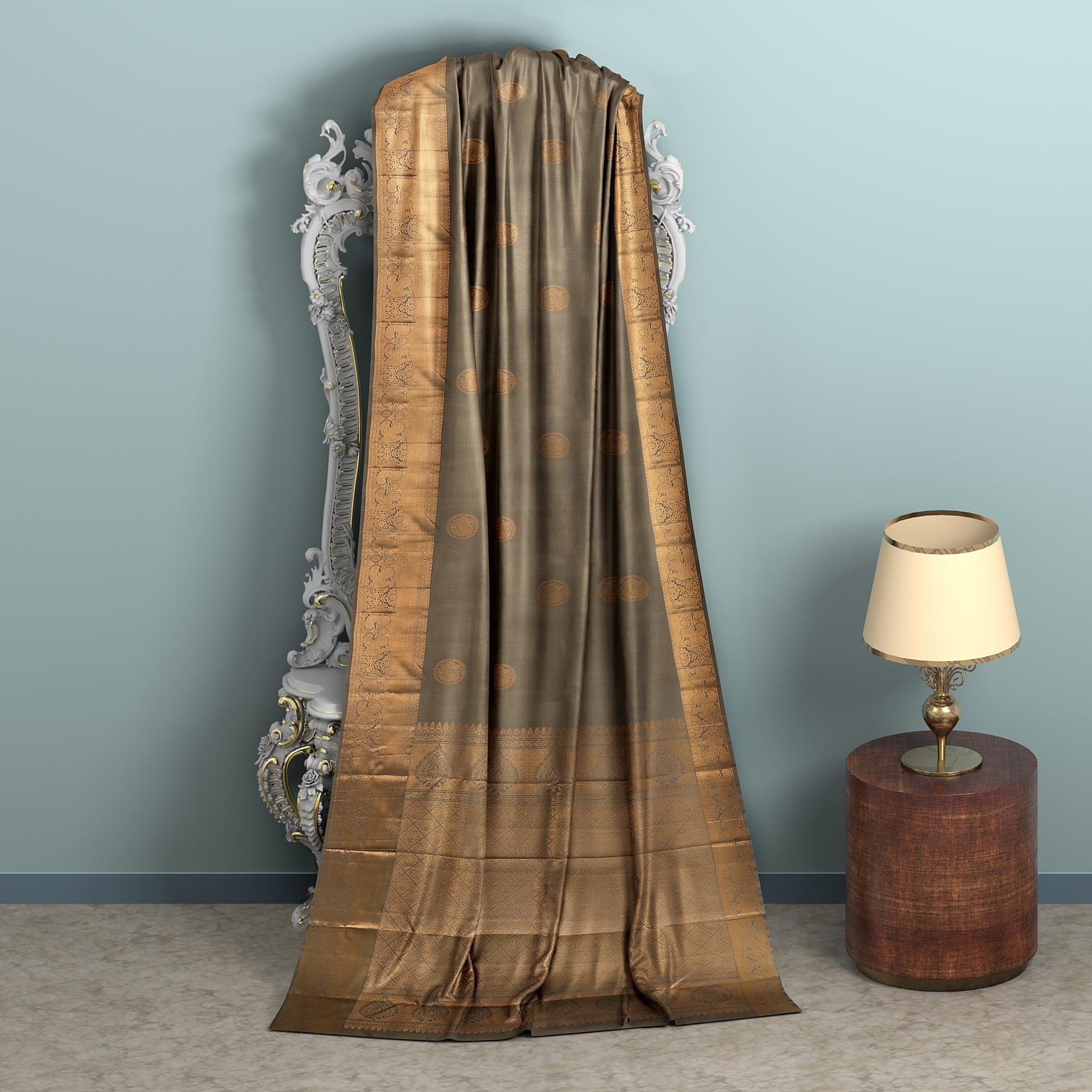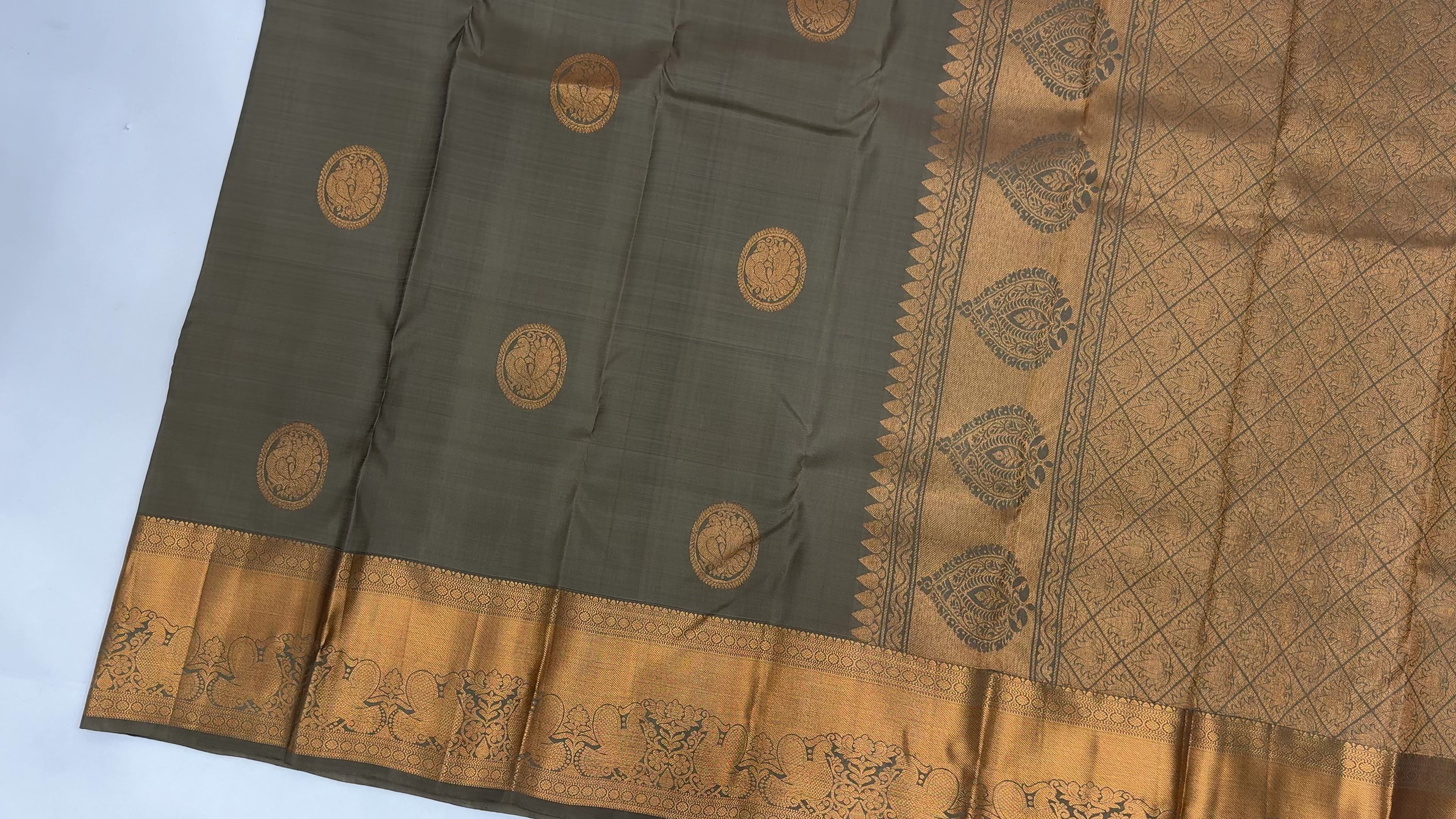ساري زفاف دائري من الحرير الخالص زاري بوتا كانجيفارام باللون الأخضر الزيتوني والذهبي العتيق، مع حافة فيل تقليدية مع بالو مزخرف، عرض 110 سم، صنع في الهند - D22765