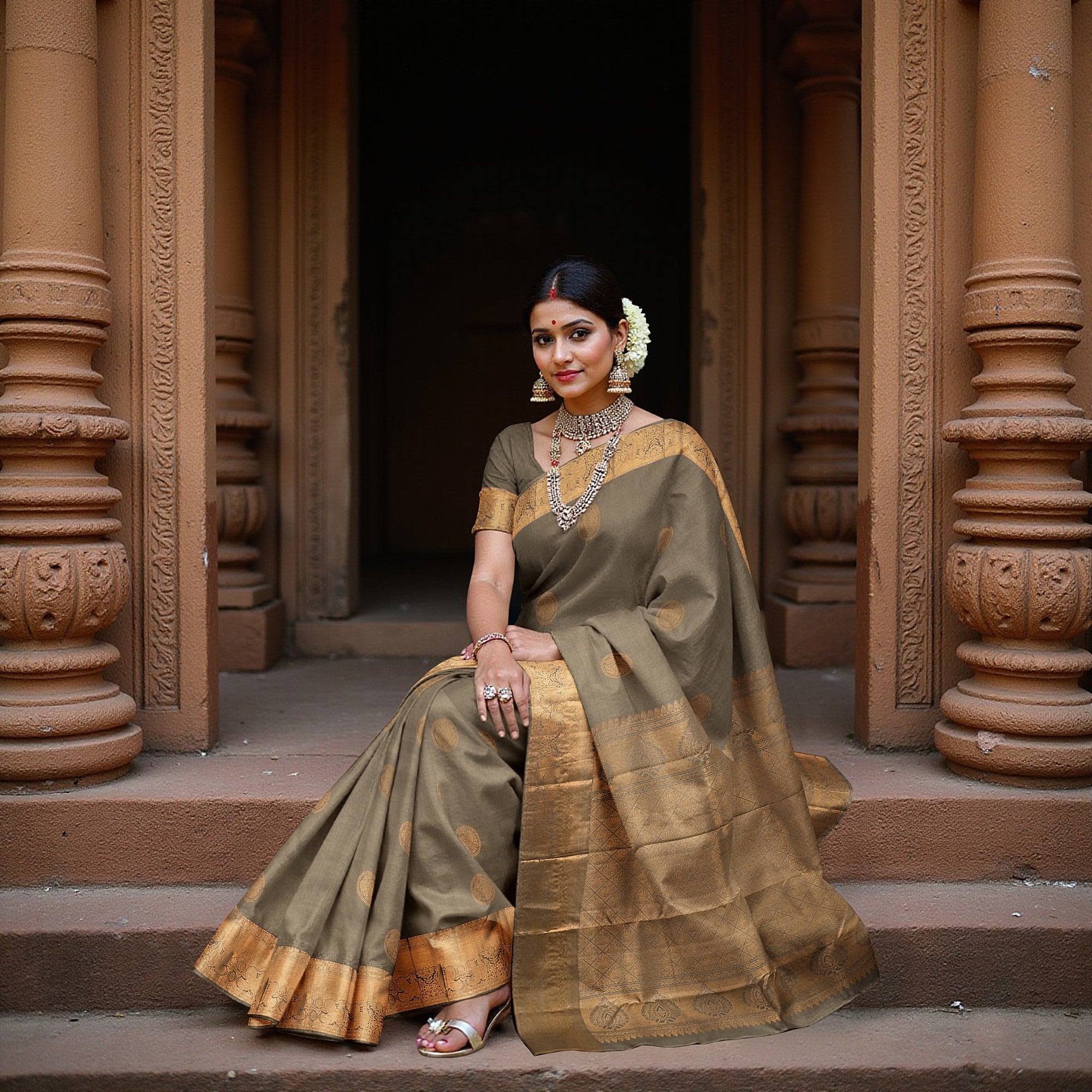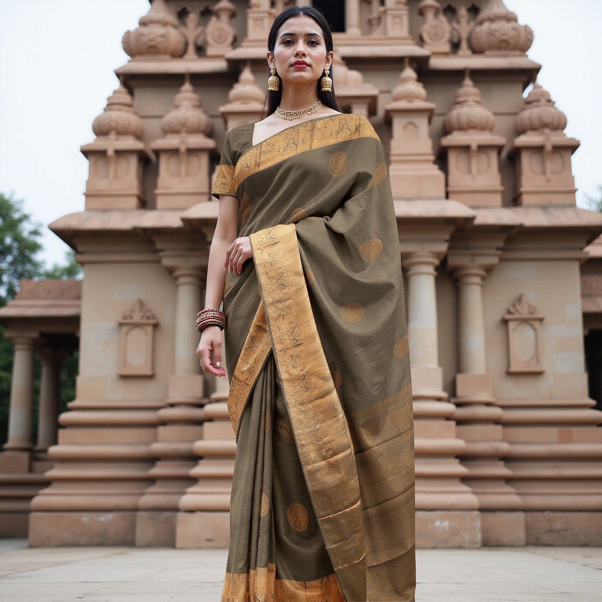 ساري زفاف كانجيفارام، المصنوع من الحرير الخالص، بتصميم أنيق ومتجذر في التراث، باللون الأخضر الزيتوني والذهبي العتيق، يجسد جوهر جداريات المعابد والزخارف المقدسة المتوارثة عبر الأجيال. يتميز جسم الساري بزخارف دائرية ذهبية تشبه نقوش العملات القديمة التي غالبًا ما نجدها في فن جنوب الهند الكلاسيكي، ترمز إلى الرخاء والتراث. أبرز ما يميزه هو حافة الفيل المنسوجة بدقة وتفاصيل البالو الغنية، مما يستحضر عظمة المواكب الملكية. منسوج بدقة وعناية على مدار 36 ساعة على يد حرفيين ماهرين، هذا الساري من ريجال فابريكس هو مثال رائع على الحرفية التقليدية. يتدفق نسيجه الحريري بفخامة، مما يخلق صورة ظلية فخمة مثالية لمناسبات الزفاف. قطعة بلوزة متناسقة متضمنة. تسوقي عبر الإنترنت واستمتعي بقصة منسوجة بإخلاص وأناقة وفن خالد.