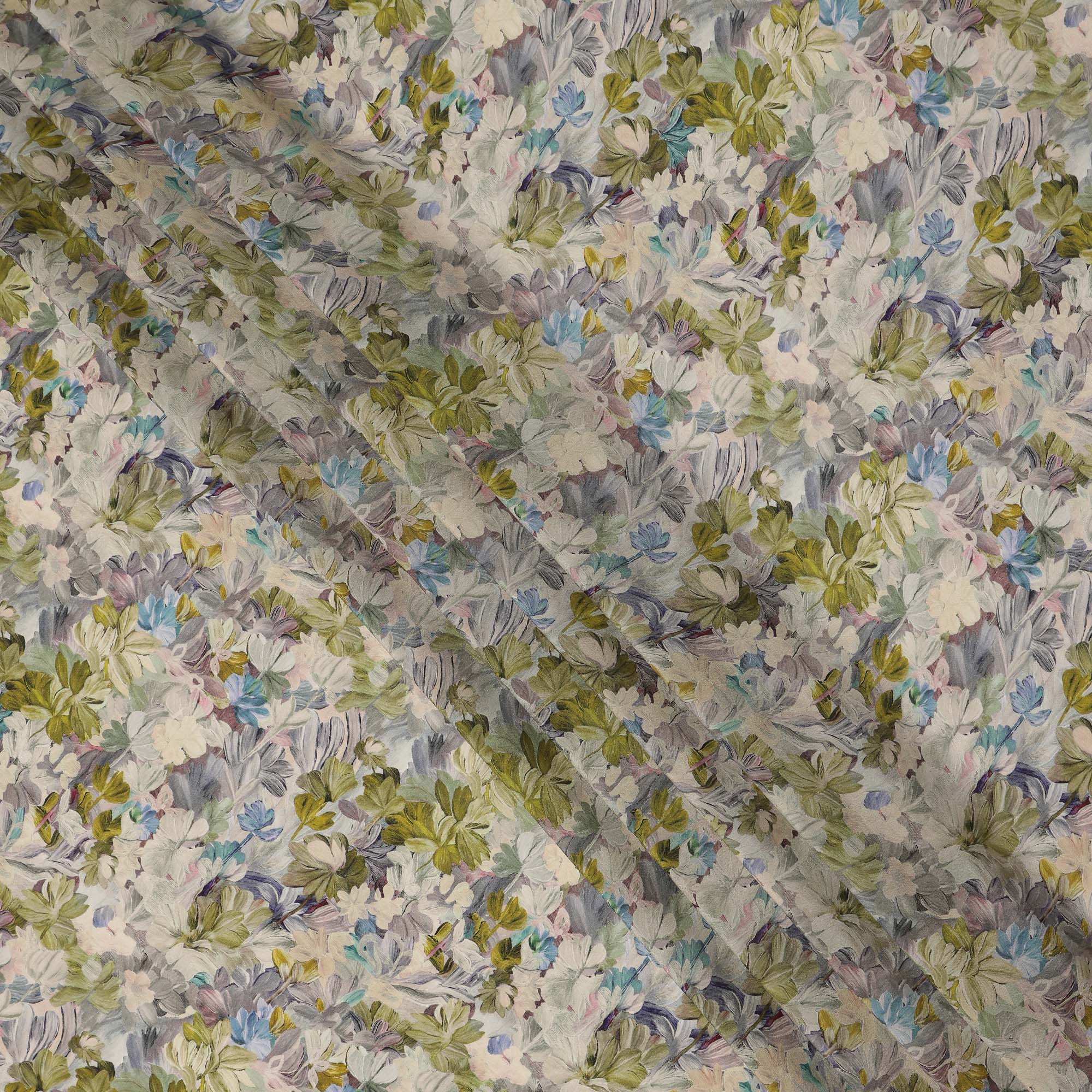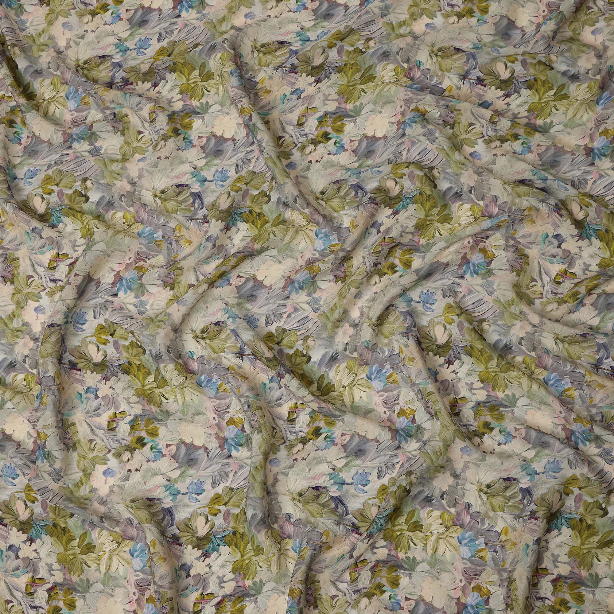 This olive green viscose crepe fabric features a graceful floral print accented with soft blue, ivory, muted grey, and subtle... اقرأ أكثر اقرأ أكثر