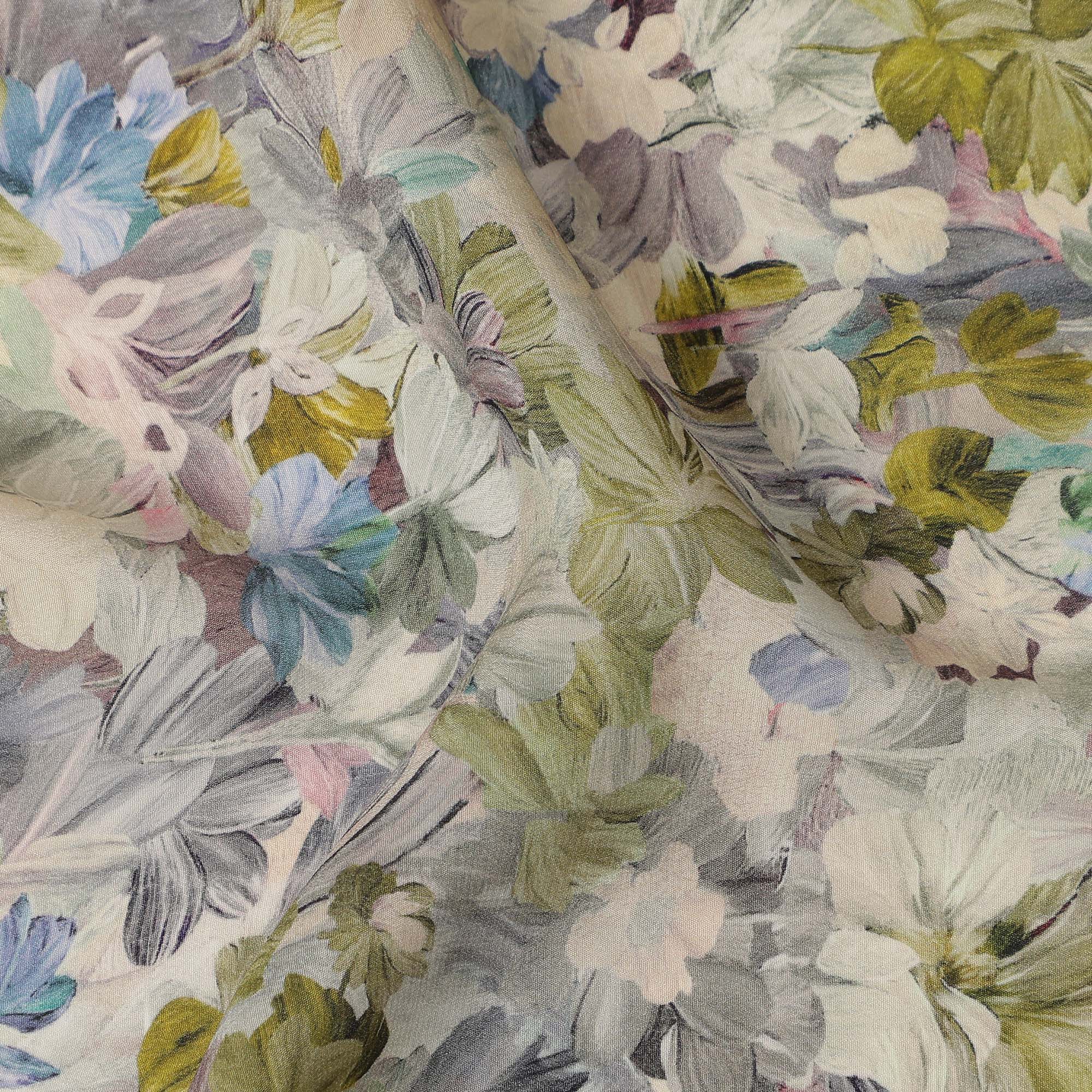 This olive green viscose crepe fabric features a graceful floral print accented with soft blue, ivory, muted grey, and subtle pastel tones for a naturally elegant appeal. The earthy olive green base enhances the layered botanical design, creating a balanced and refreshing color palette that feels both timeless and versatile. Crafted in India, the fabric offers a smooth crepe texture with a soft matte finish that drapes beautifully and flows with effortless movement. Lightweight and breathable, it ensures comfortable wear while maintaining a refined structure, making it suitable for all day styling. With a width of 110 cms, this fabric is ideal for dresses, kurtis, tops, tunics, and skirts that require fluidity, softness, and understated sophistication for casual as well as semi formal occasions.