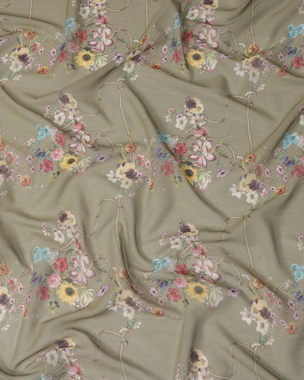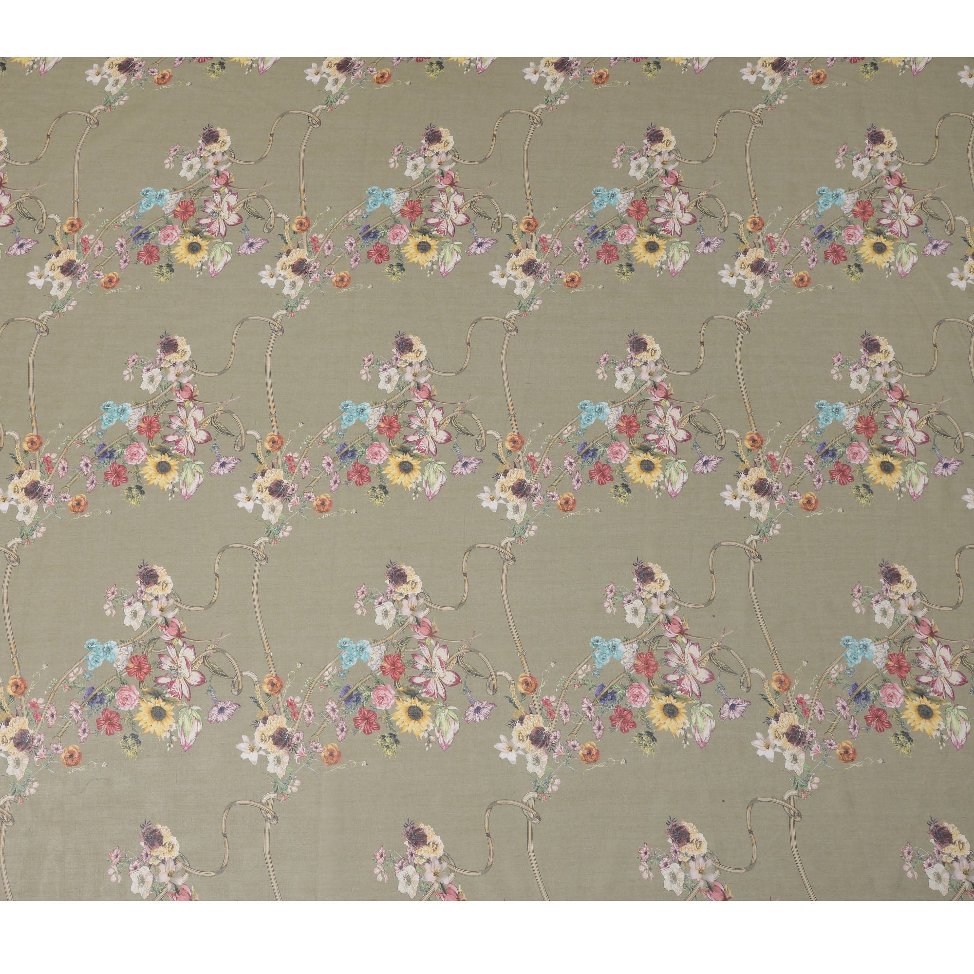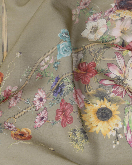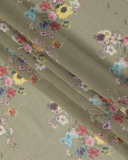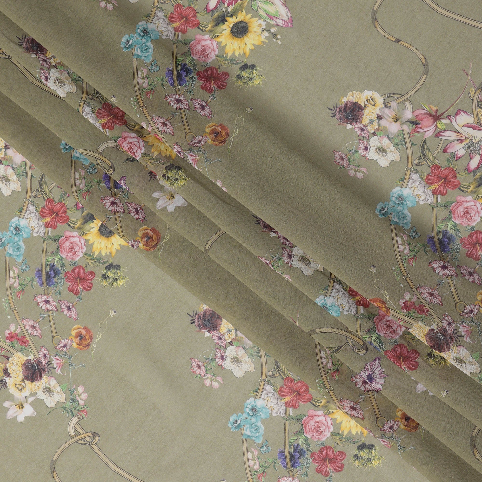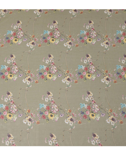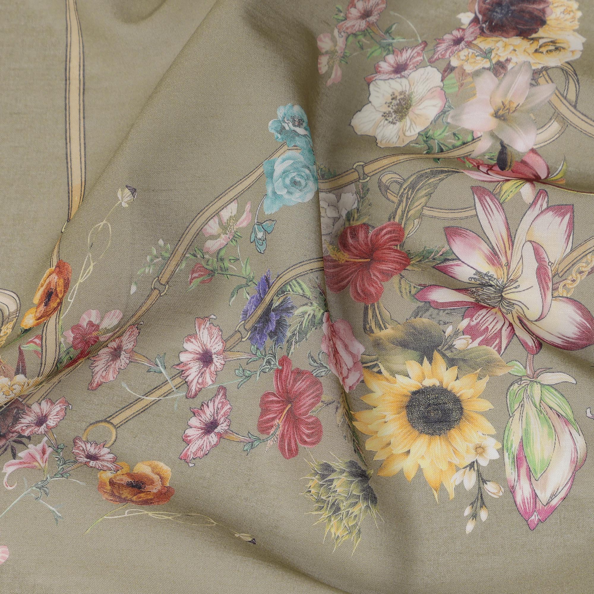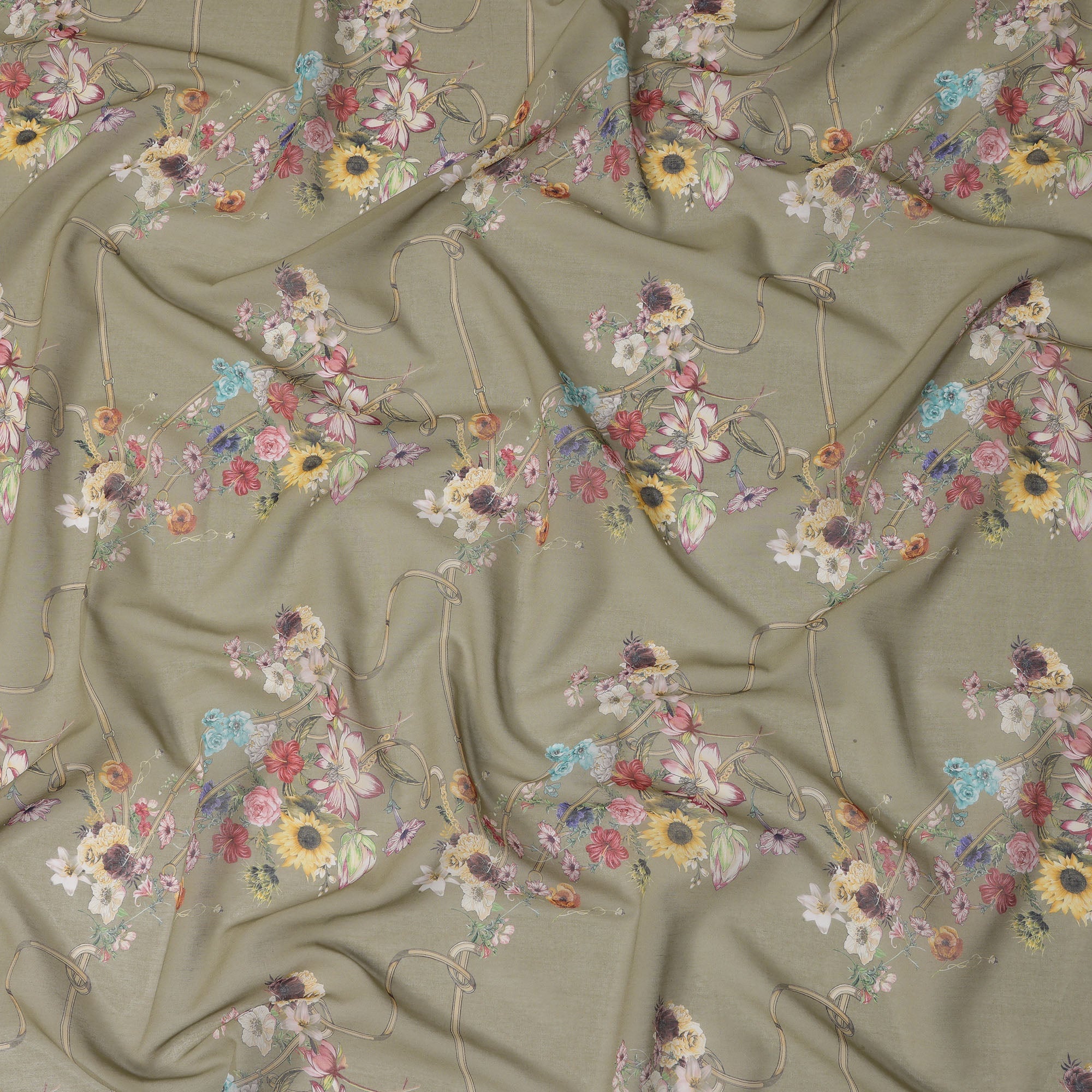 قماش قطني فوال بطبعة زهور متعددة الألوان باللون الأخضر الزيتوني، العرض: 140 سم، الهند - D23057