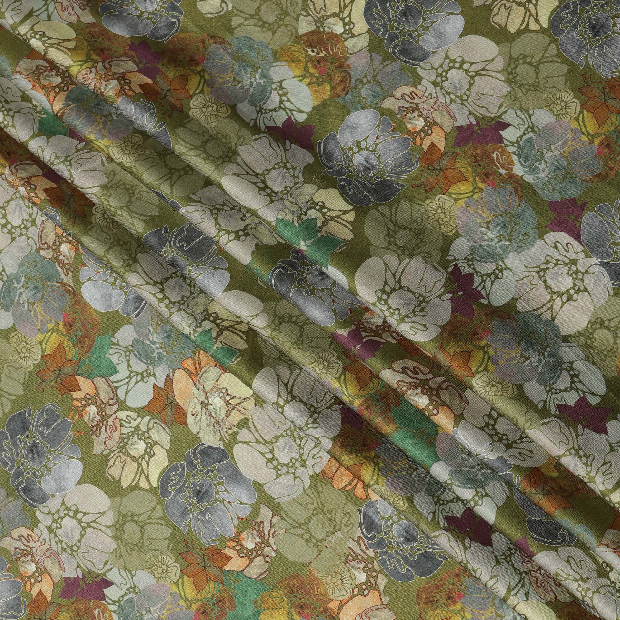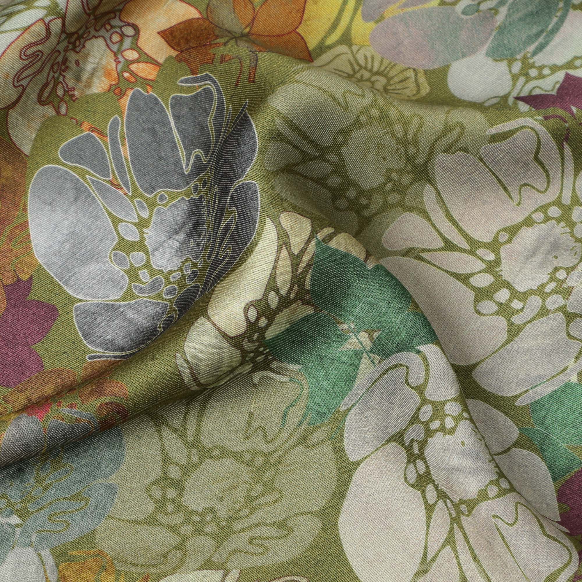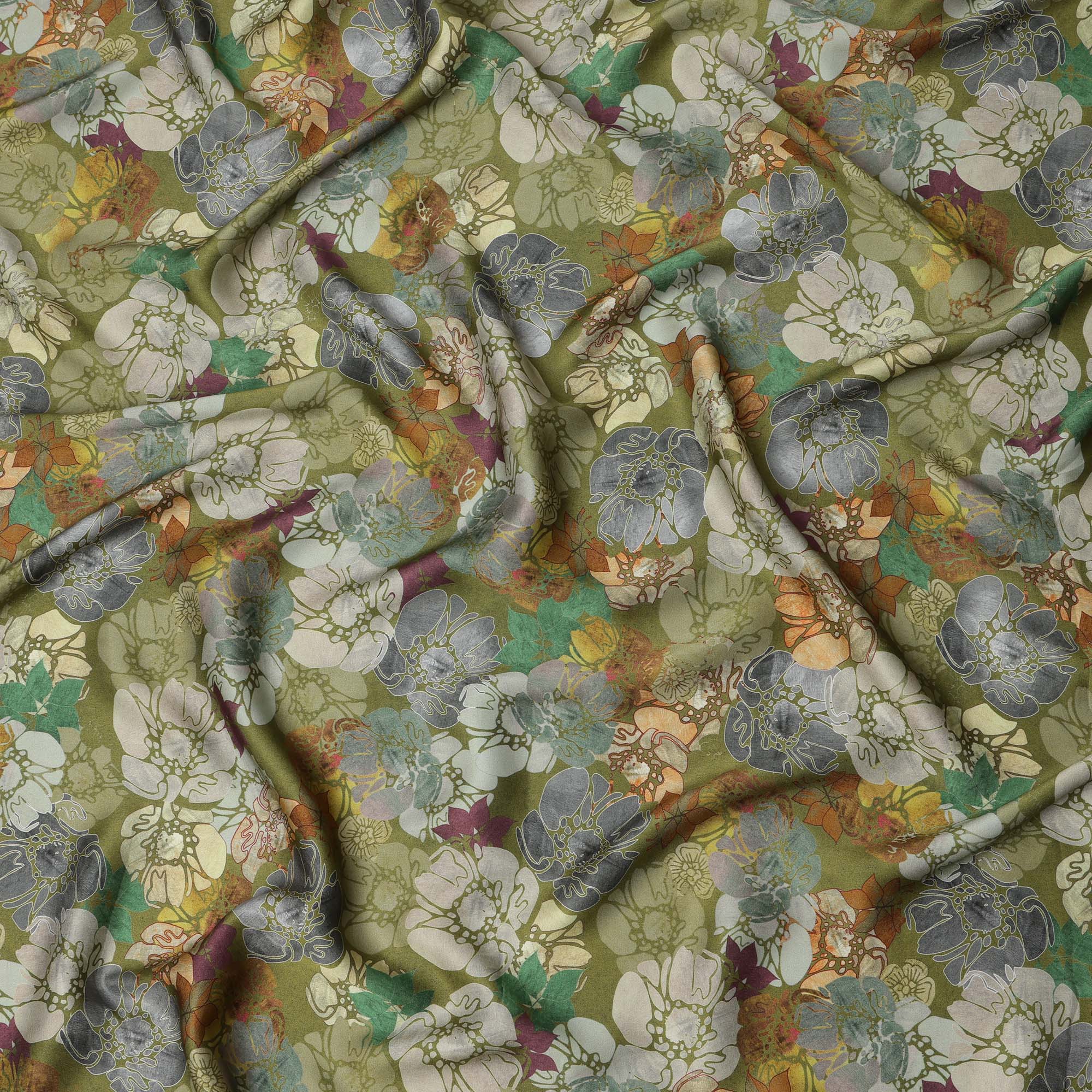 قماش فيسكوز مودال ساتان بطبعة زهور متعددة الألوان باللون الأخضر الزيتوني، عرض 110 سم، صنع في الهند - D23303
