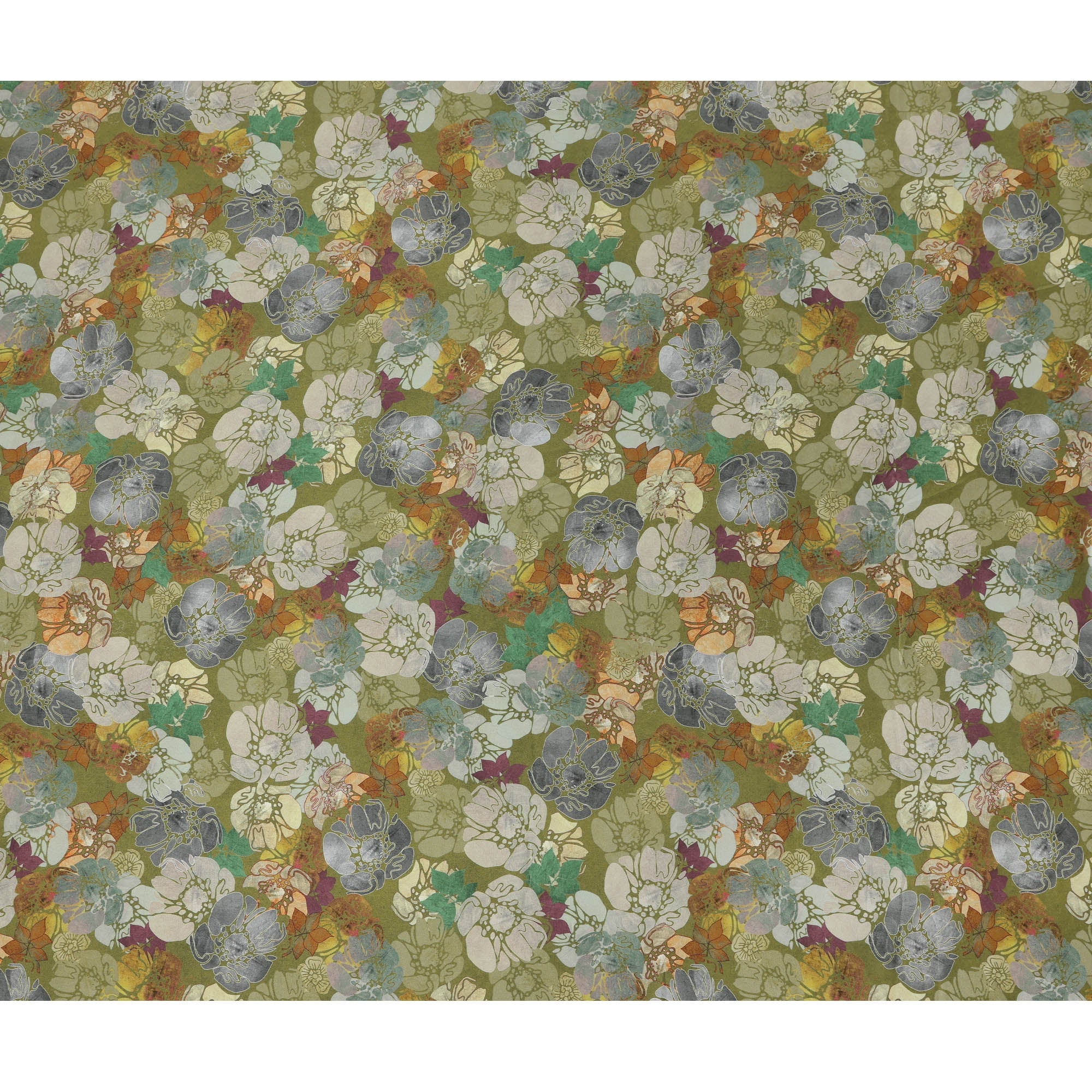 طباعة زهور متعددة الألوان على شكل رسم تخطيطي على قاعدة من الساتان باللون الأخضر الزيتوني.