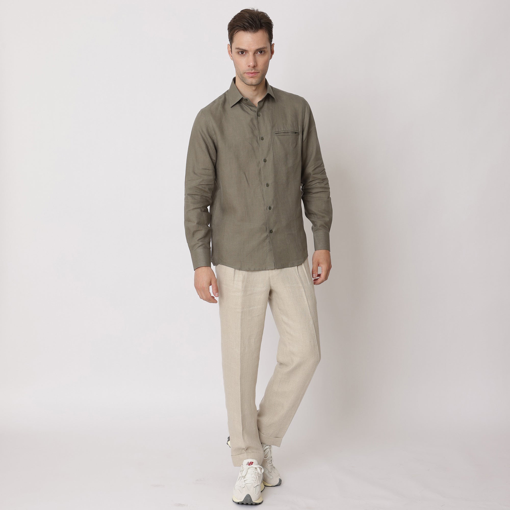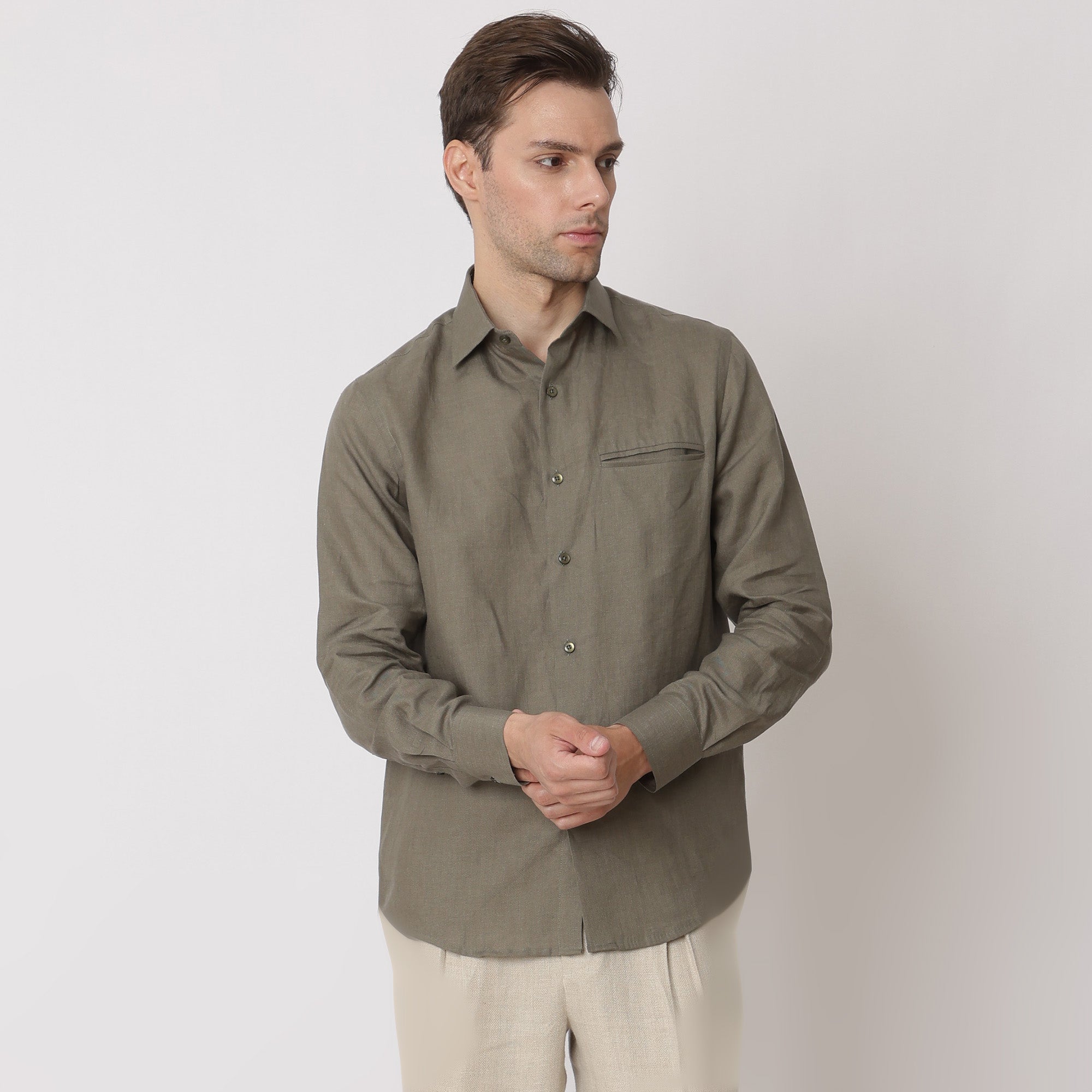 قميص كتان نقي فاخر باللون الأخضر الزيتوني، قصة كلاسيكية، صنع في الإمارات العربية المتحدة - D22010