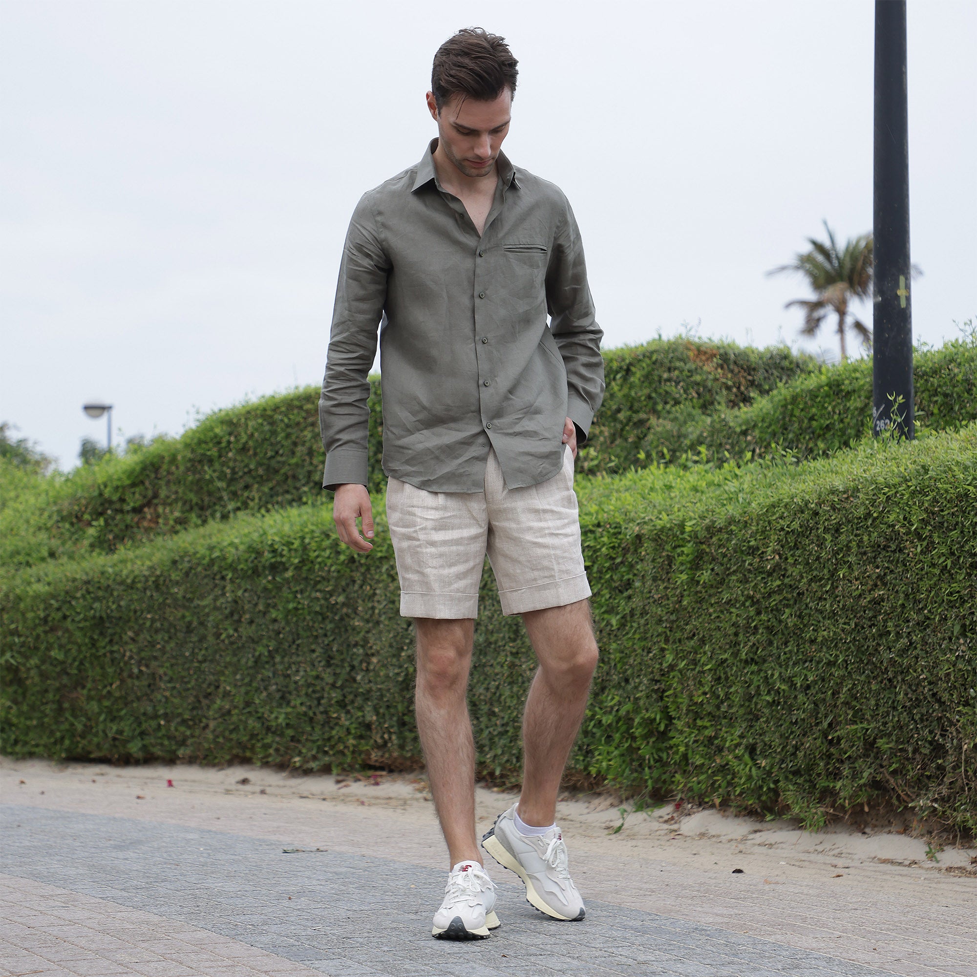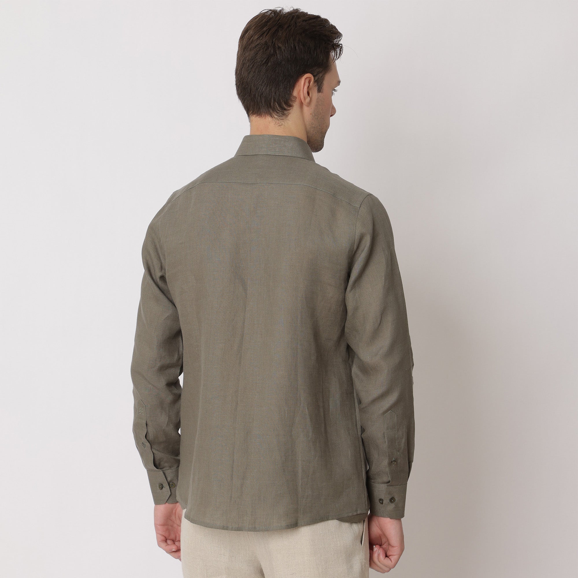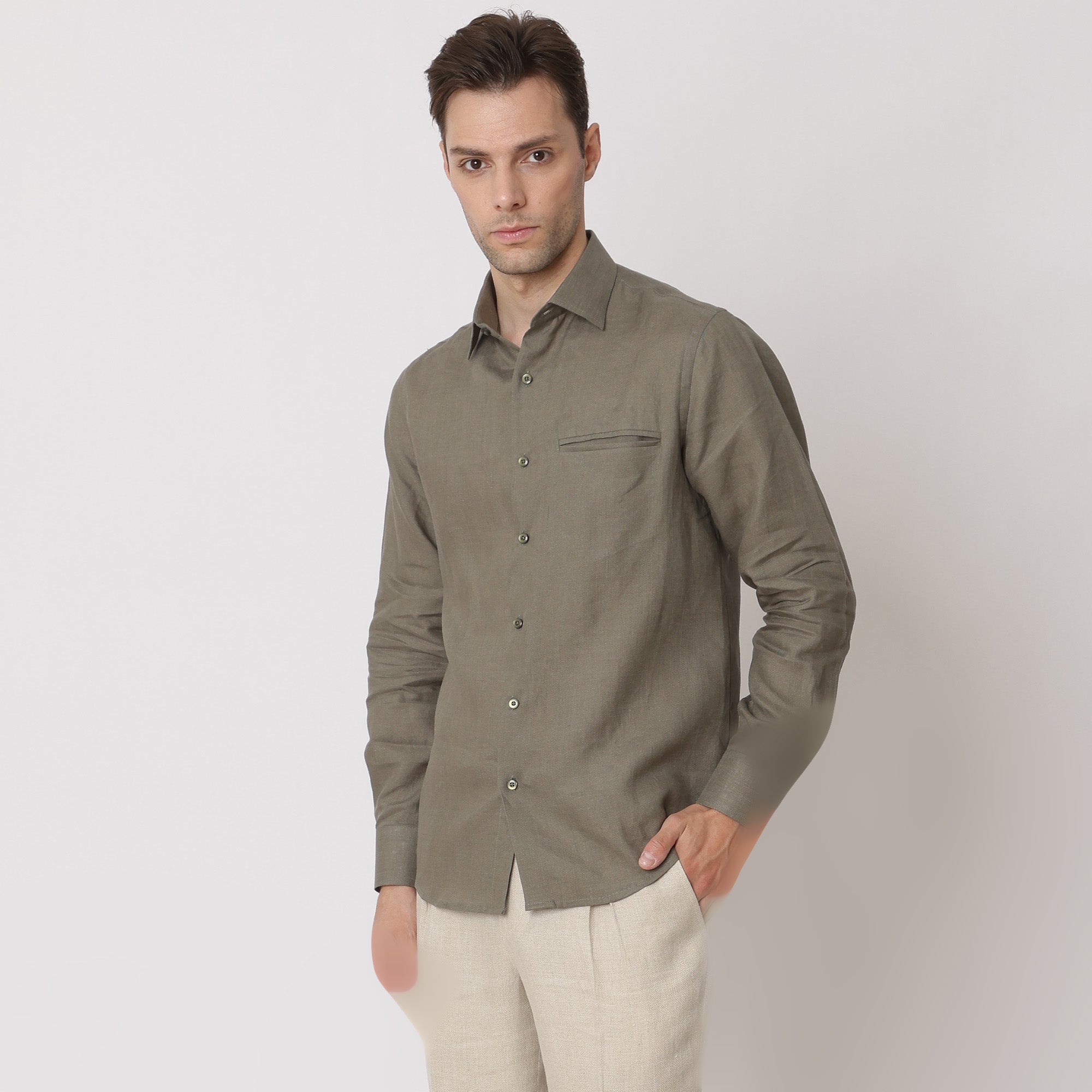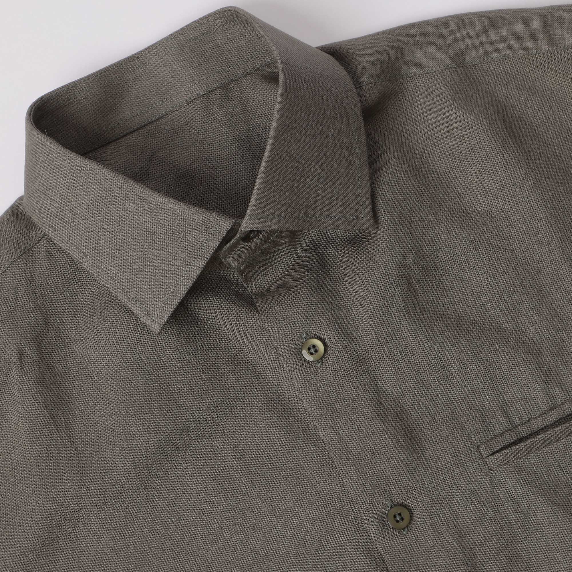 • قميص كتان نقي فاخر باللون الأخضر الزيتوني، قصة كلاسيكية، صنع في الإمارات العربية المتحدة - D22010