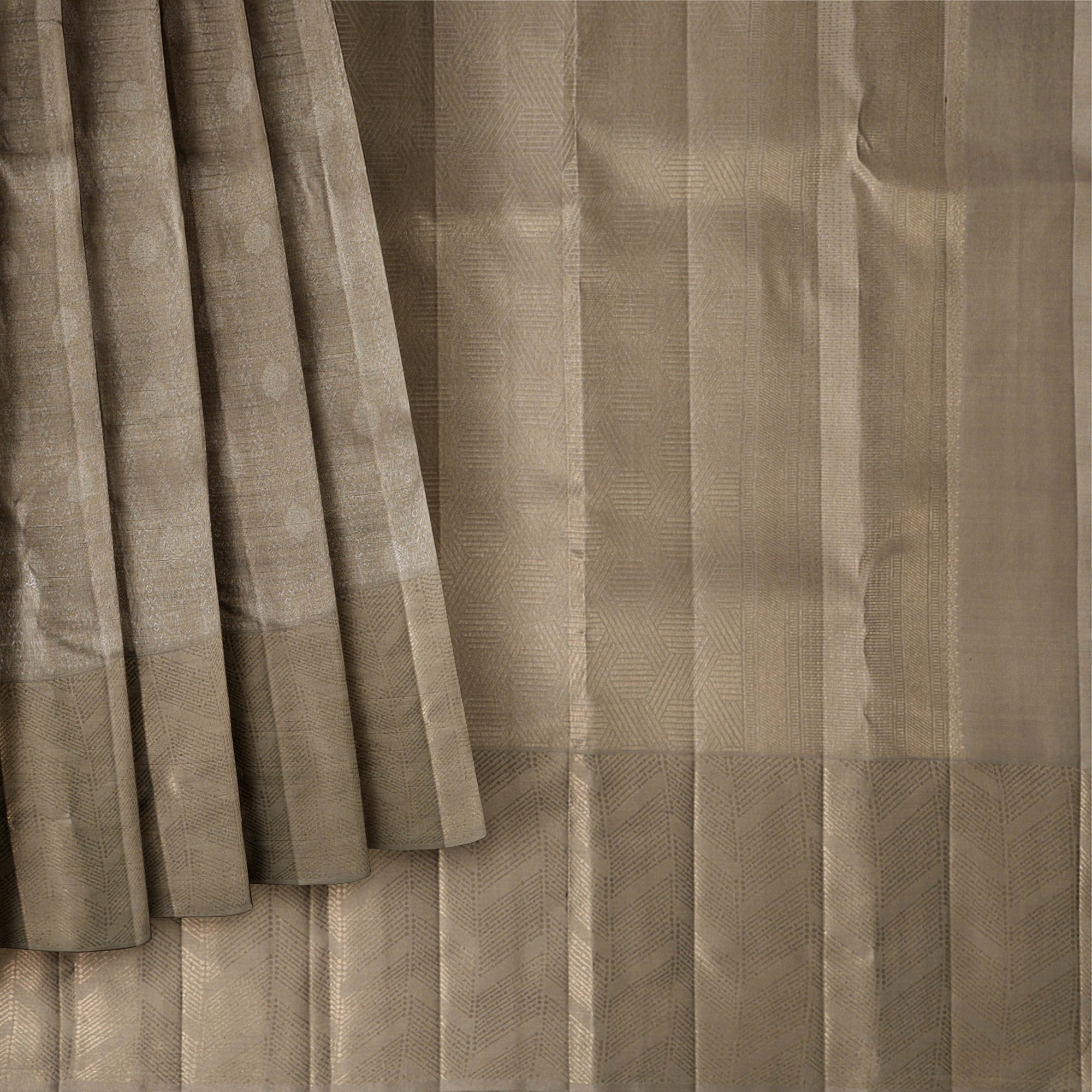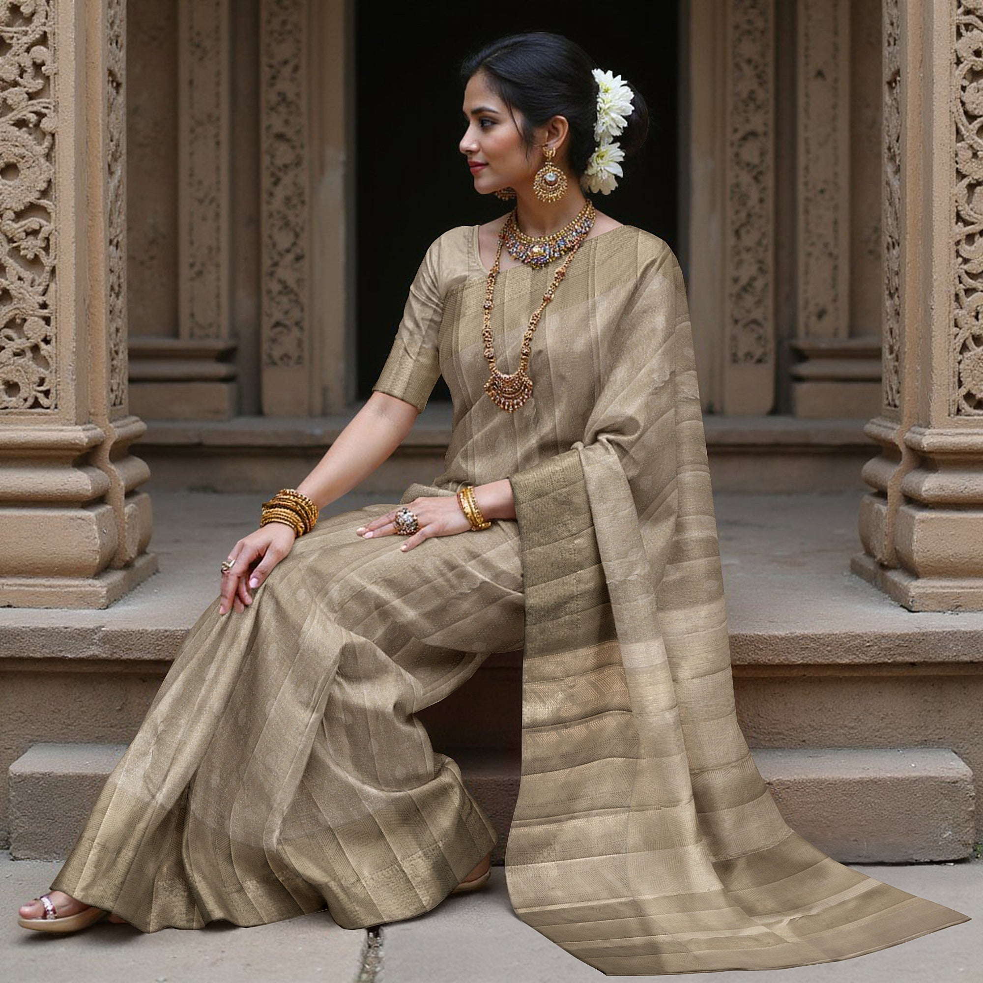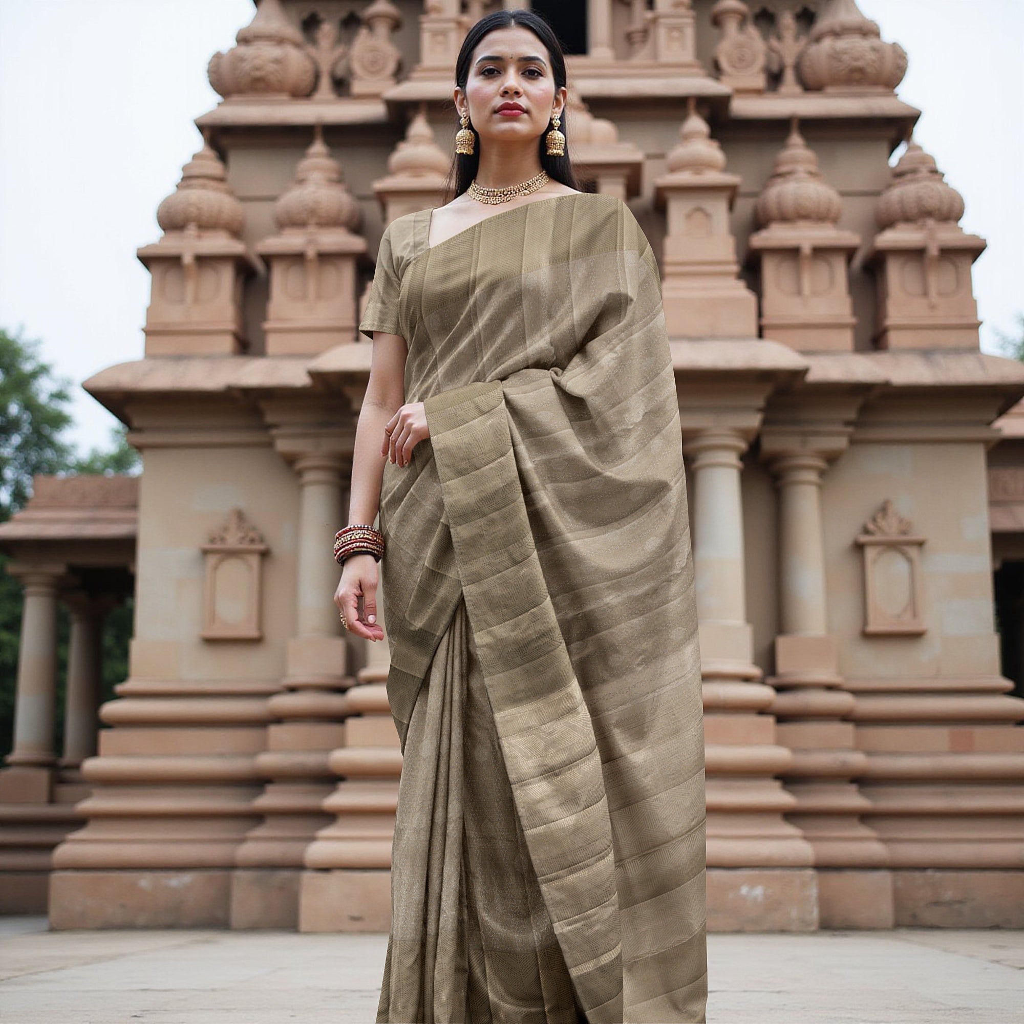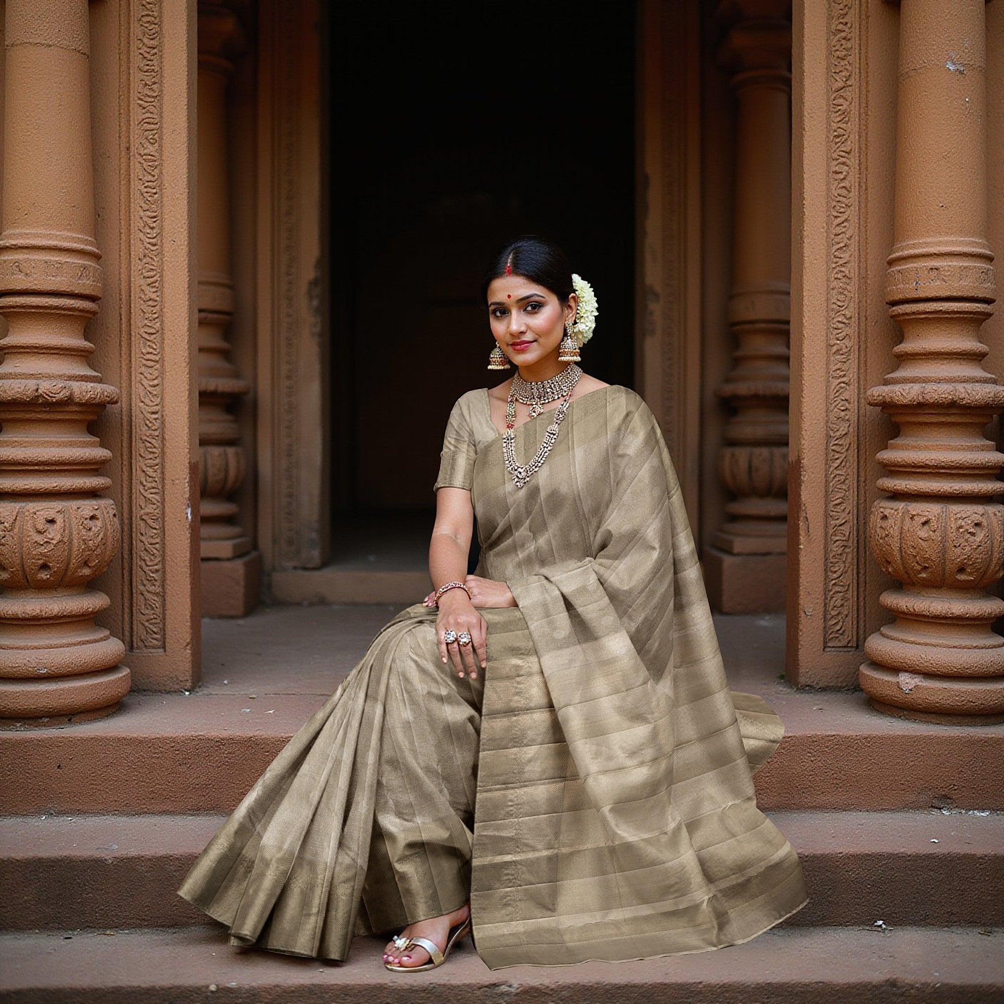 ساري كانجيفارام من الحرير الخالص بلون أخضر زيتوني، بنسيج مخطط يدويًا ولمسة نهائية رقيقة من قماش زاري، بطول 5.5 متر مع قطعة بلوزة، من أصل هندي - D22709