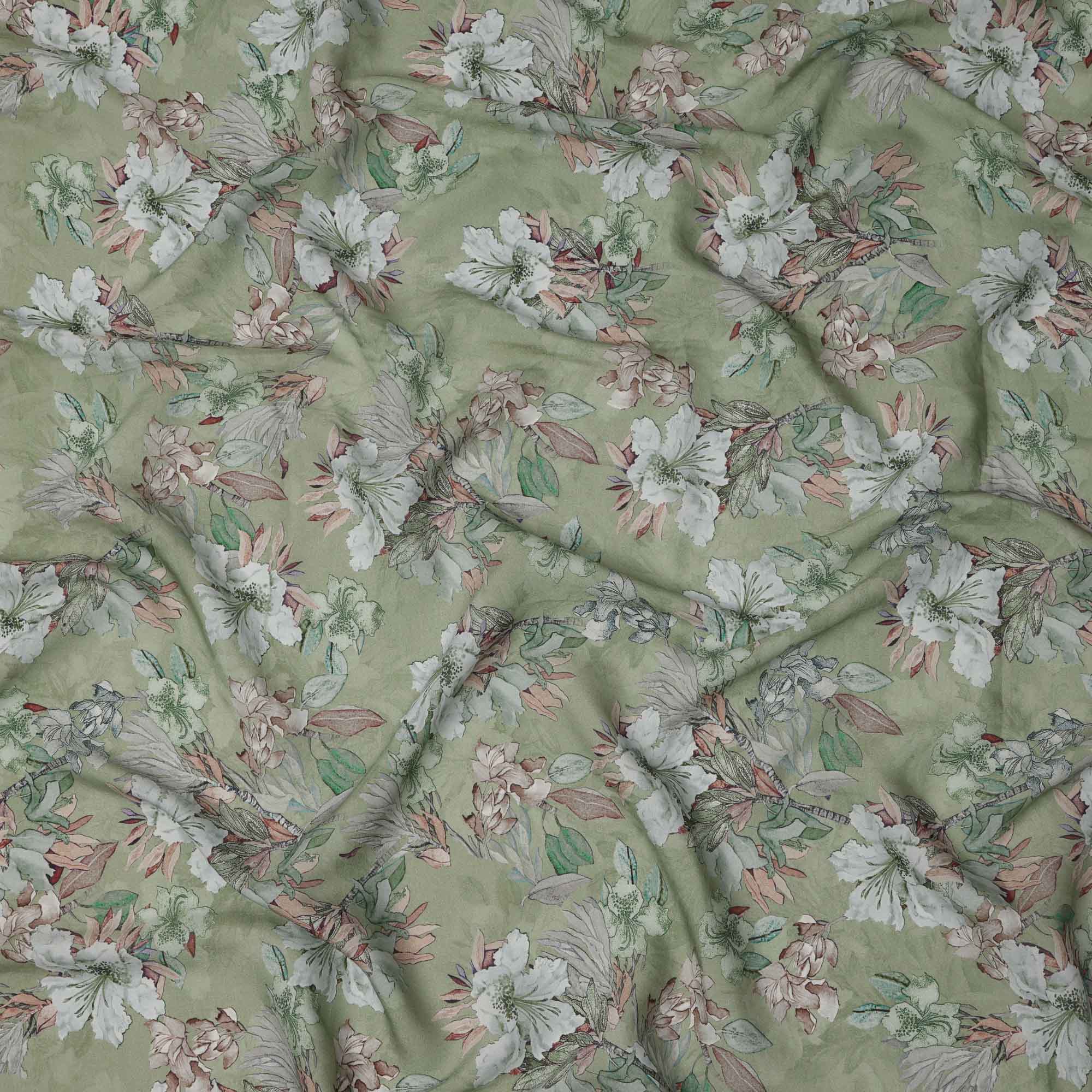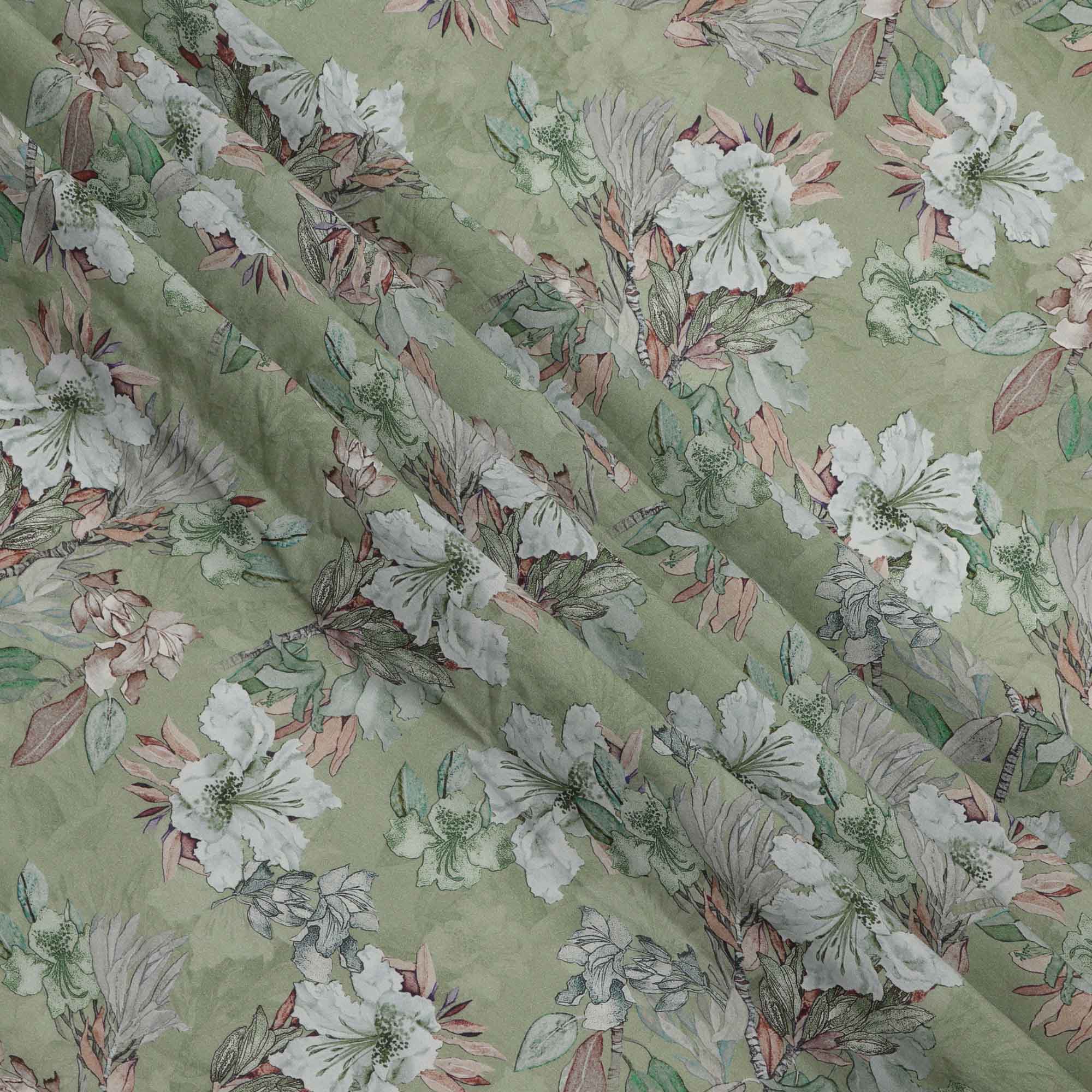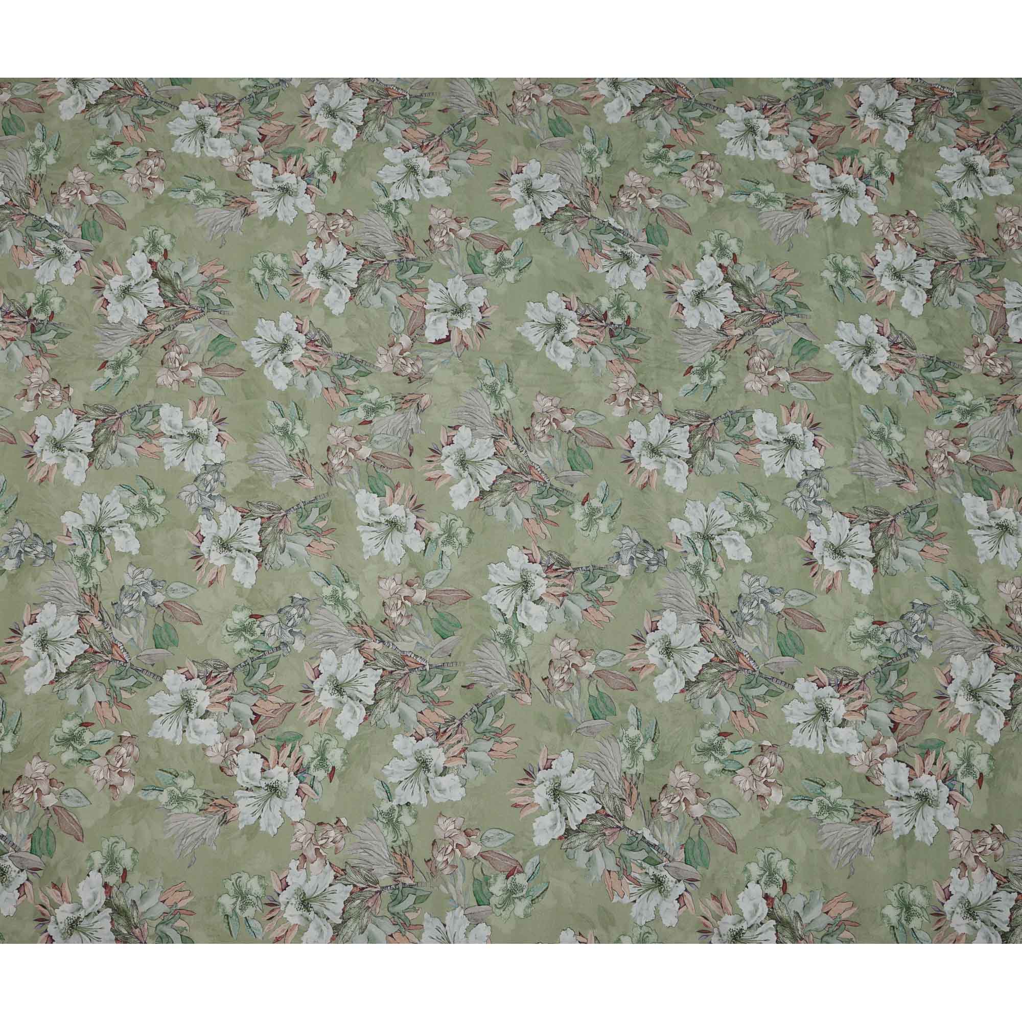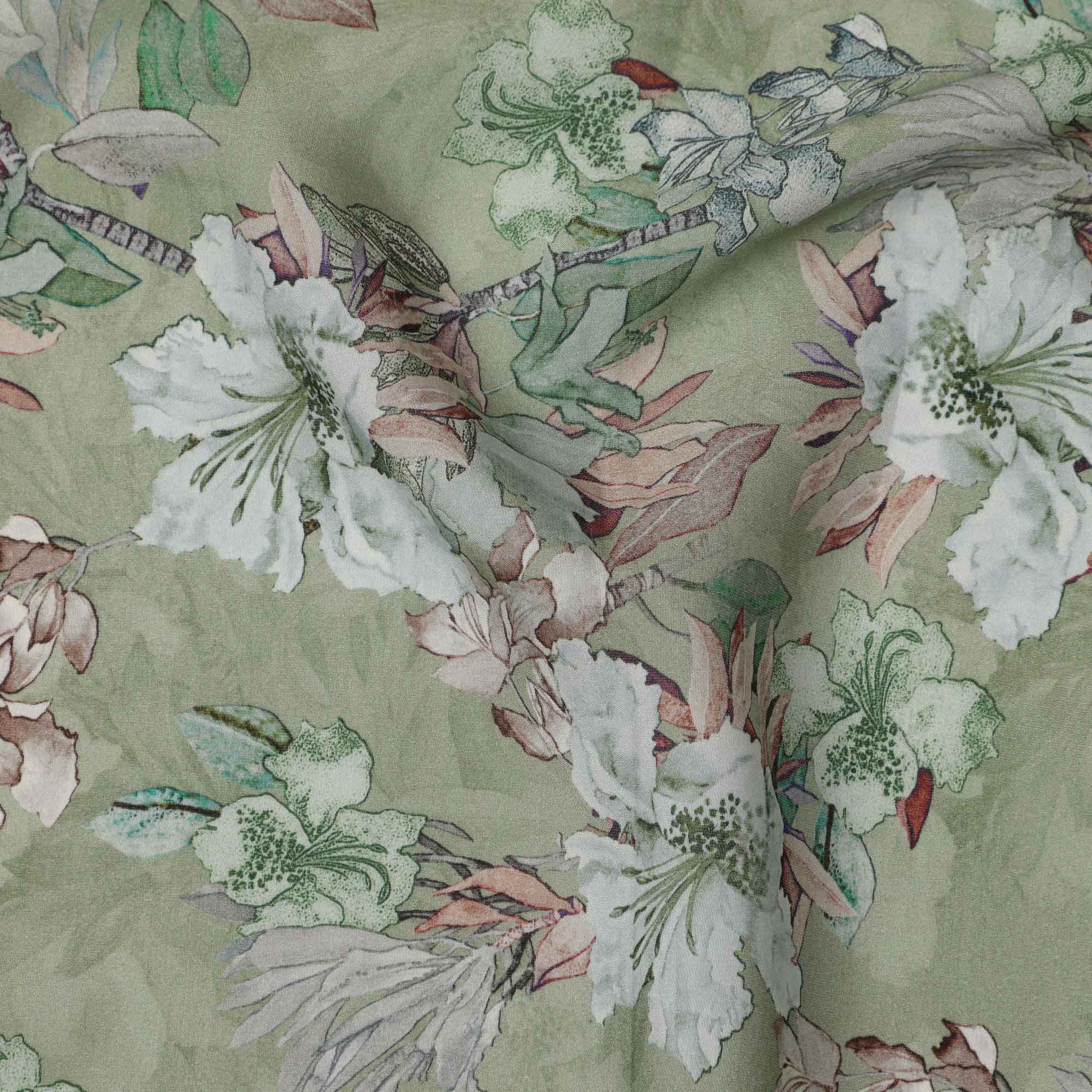 قماش كريب فيسكوز مطبوع يدويًا بنقشة زهور باللون الأخضر الباستيل والأبيض، 110 سم، الهند - D23470