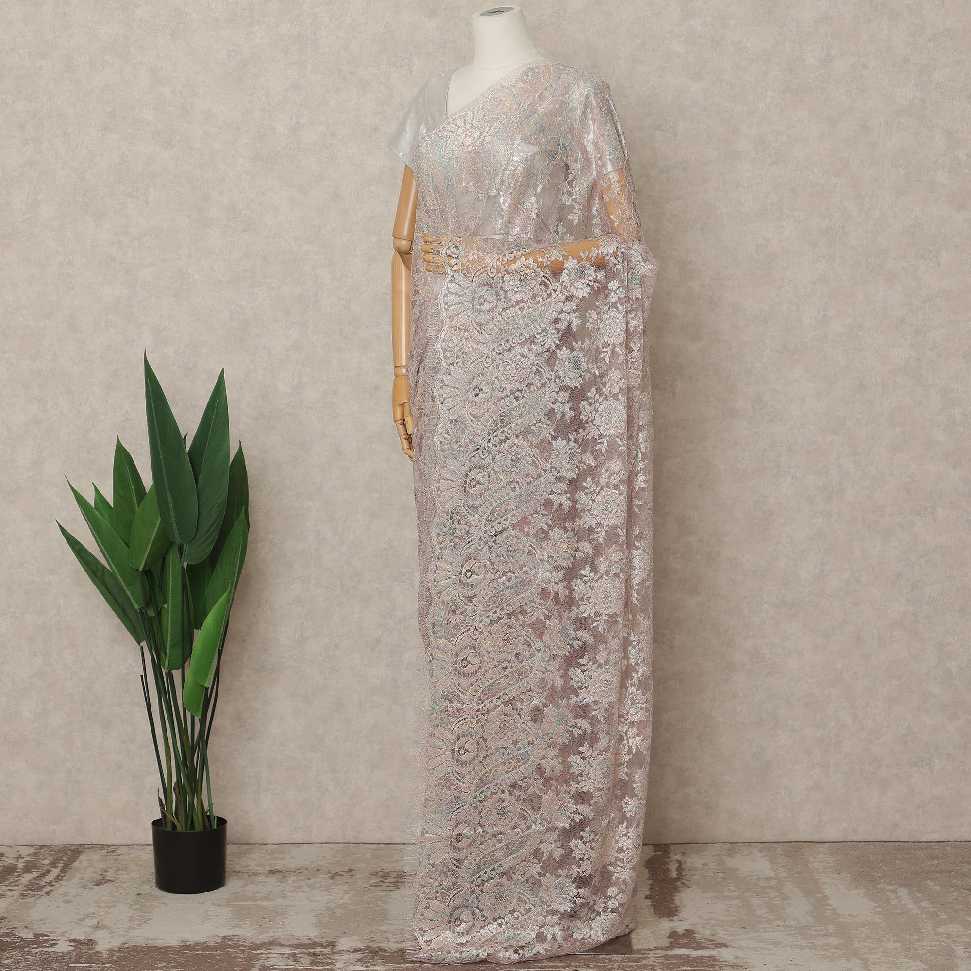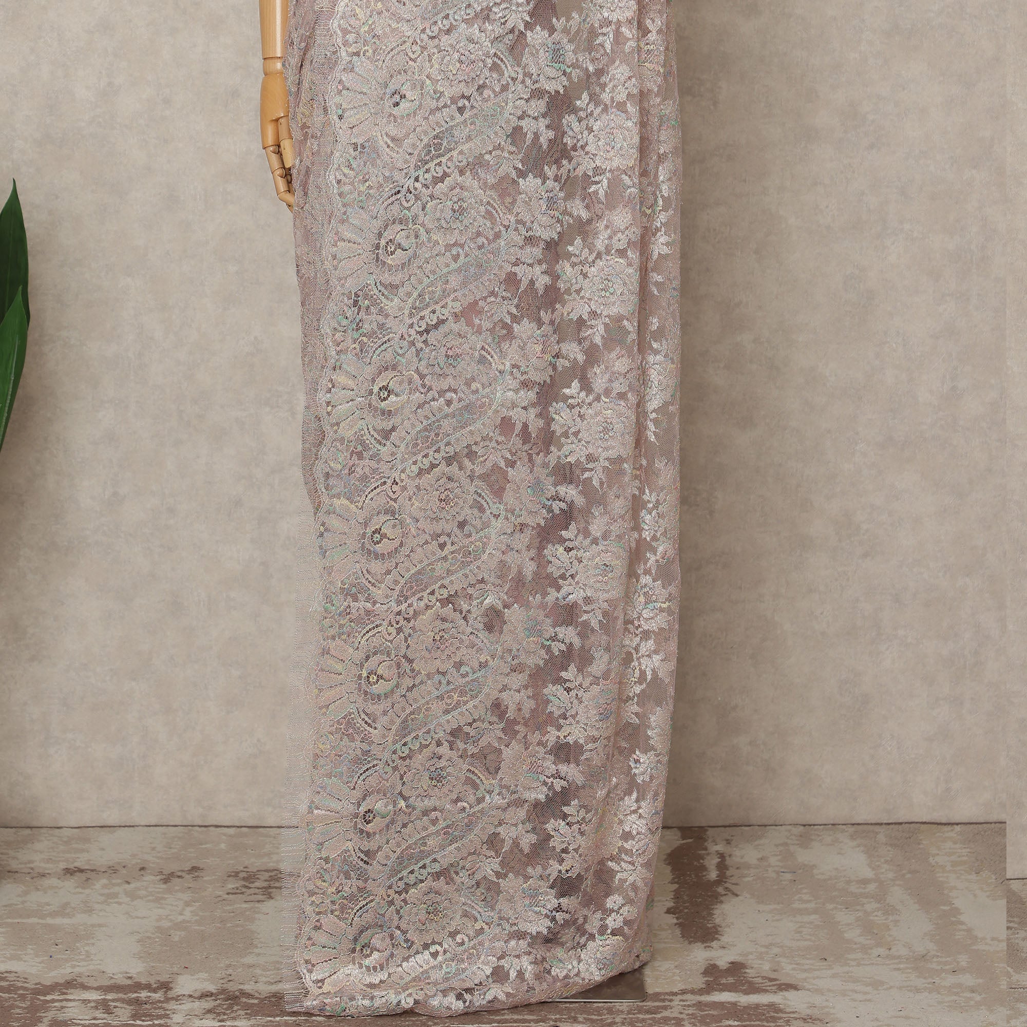 Pastel Mauve Premium French Metallic Chantilly Lace Saree Fabric, 5.5 Mtrs Length, 110 Cms Width, Crafted in France – Iridescent Multicolor Floral Lace, Blouse Not Included-D26428