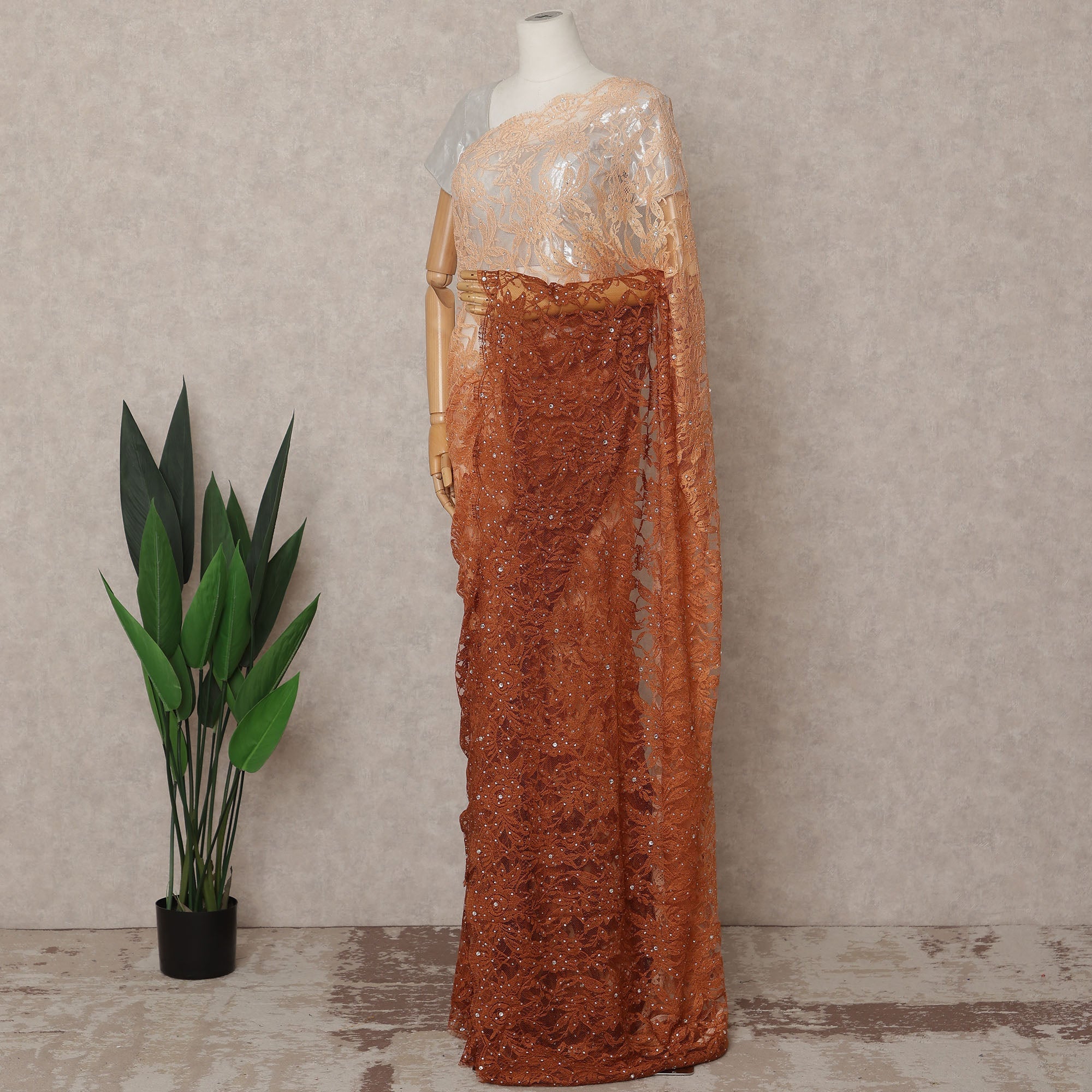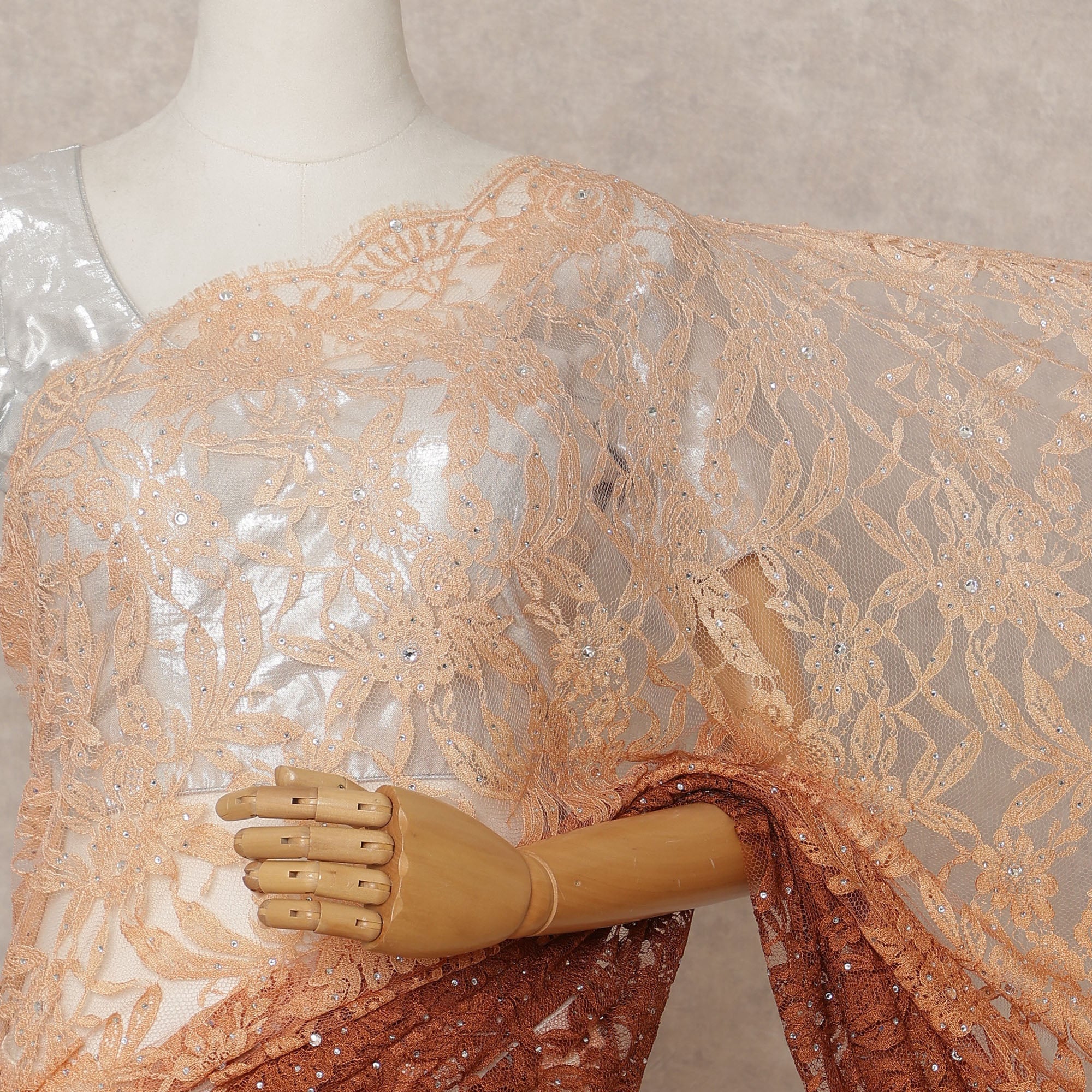 Peach and Copper Premium French Ombre Chantilly Lace Saree with Stone Work – 5.5 Meters Length, 110 Cms Width, Crafted in France-D26106