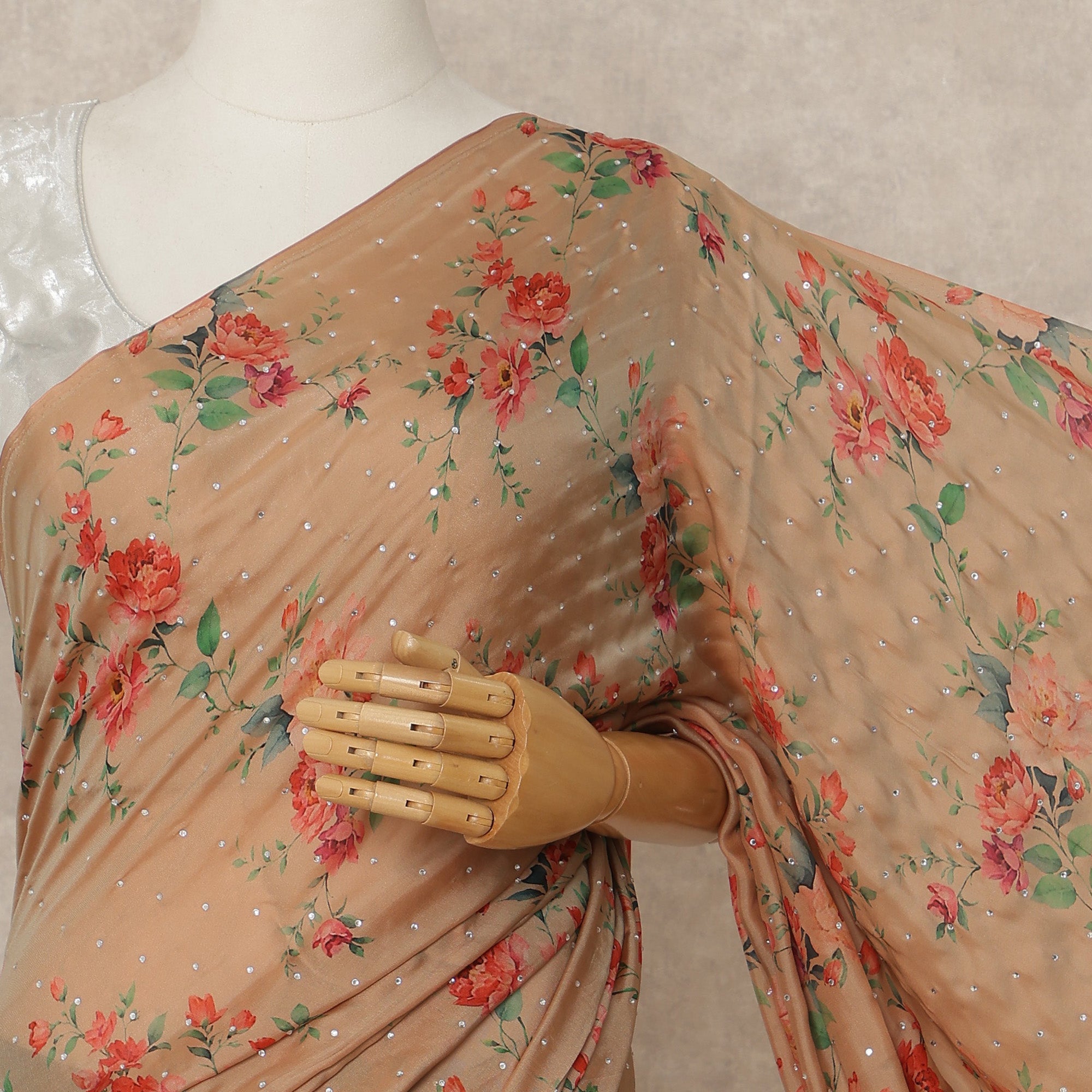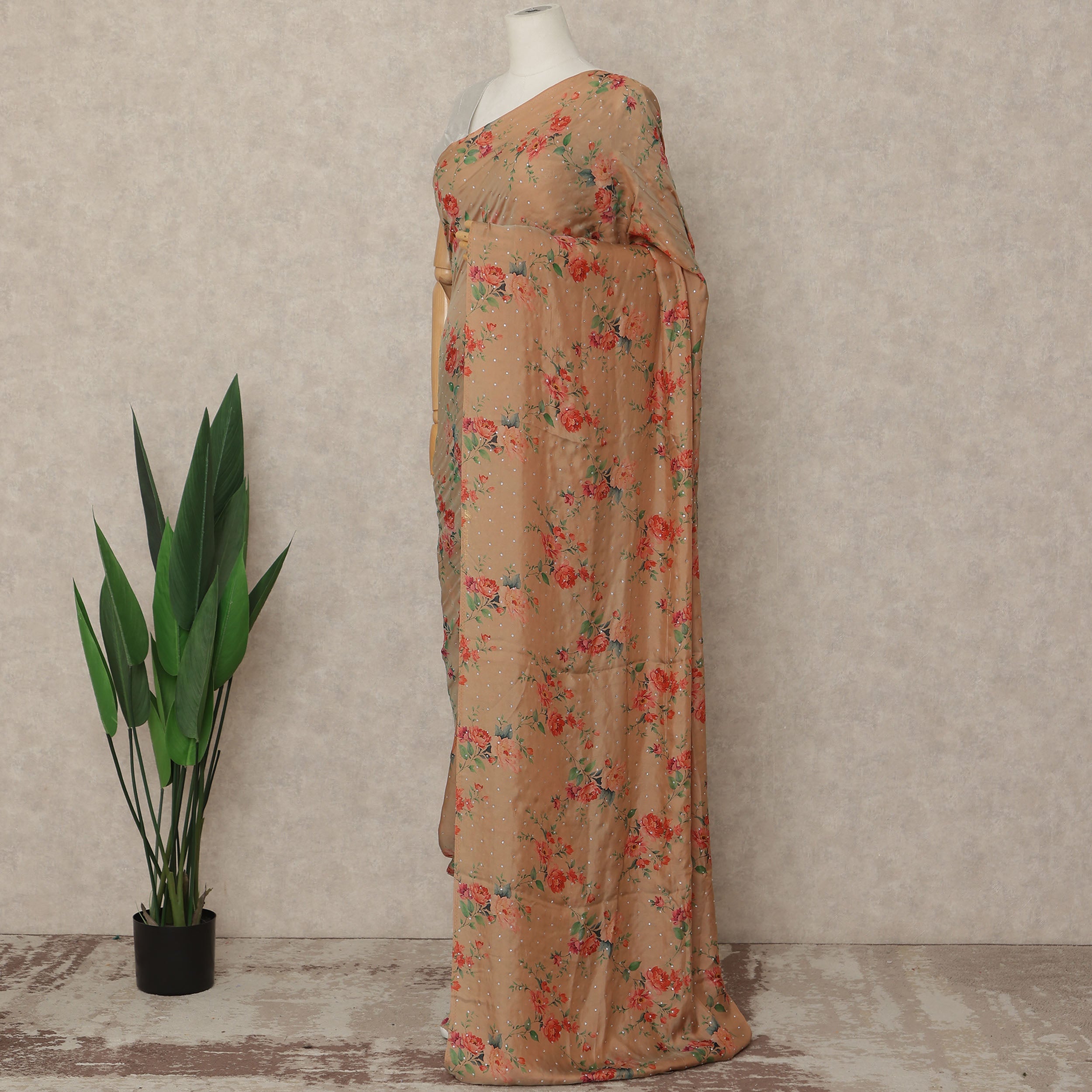 • Peach Beige Floral Premium Pure Silk Chiffon Saree 5.5 Meters x 110 Cms Width with Stone Work from South Korea Unstitched Blouse Not Included-D28168