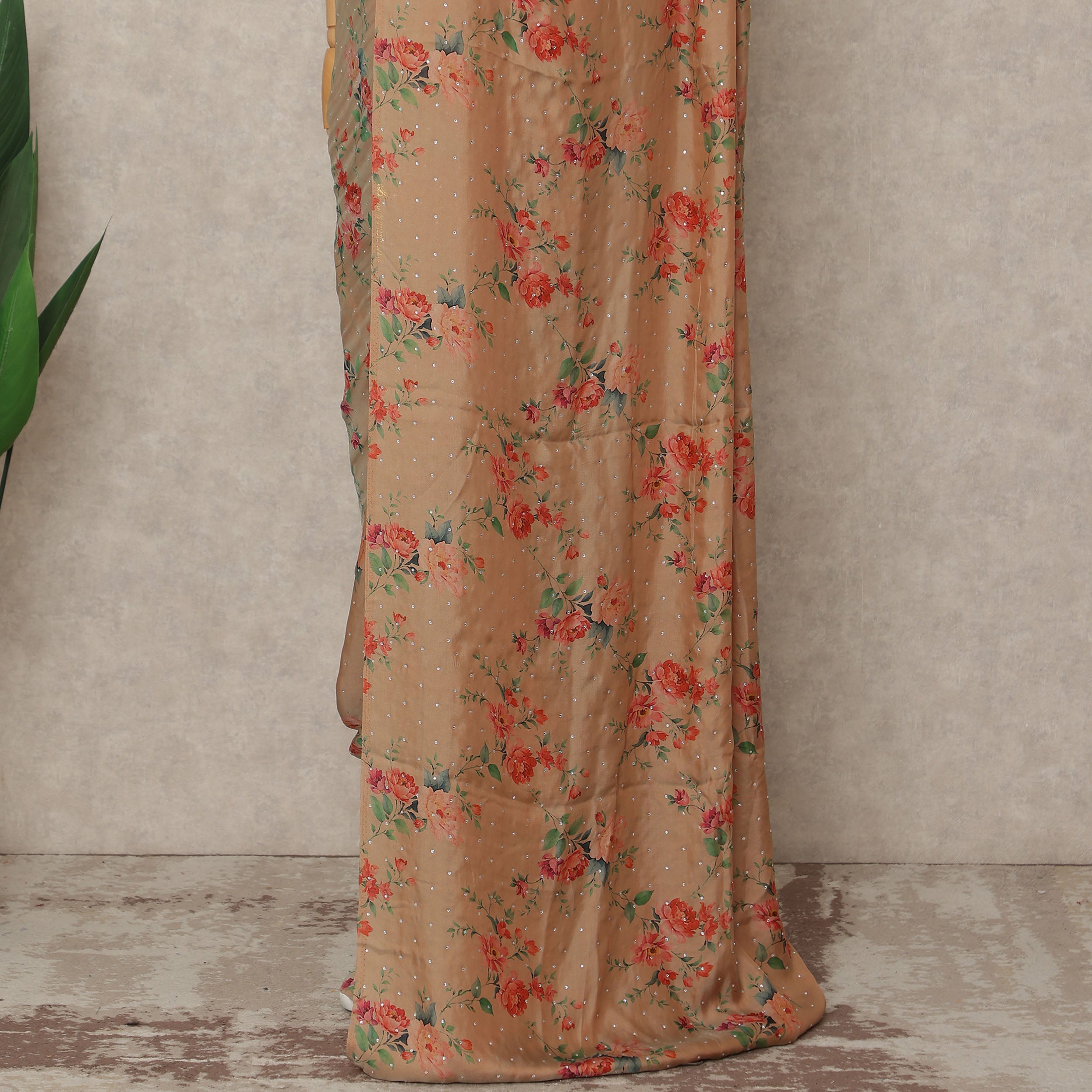 This peach beige premium pure silk chiffon saree is a graceful 5.5 meter fabric piece with a width of 110 cms, designed to offer an elegant and fluid drape. Crafted from fine pure silk chiffon, it features delicate floral prints in soft coral and green hues, beautifully enhanced with subtle stone work scattered across the fabric for a refined shimmer. The warm peach beige tone adds sophistication and charm, making it perfect for festive gatherings, daytime events, and special occasions. Lightweight, breathable, and luxuriously smooth, this unstitched saree fabric allows customized styling as per your preference, and blouse fabric is not included.