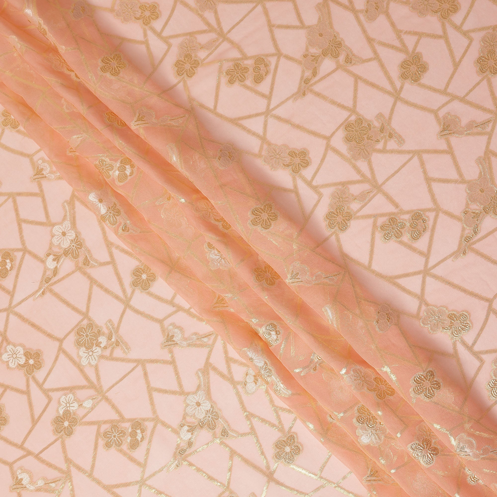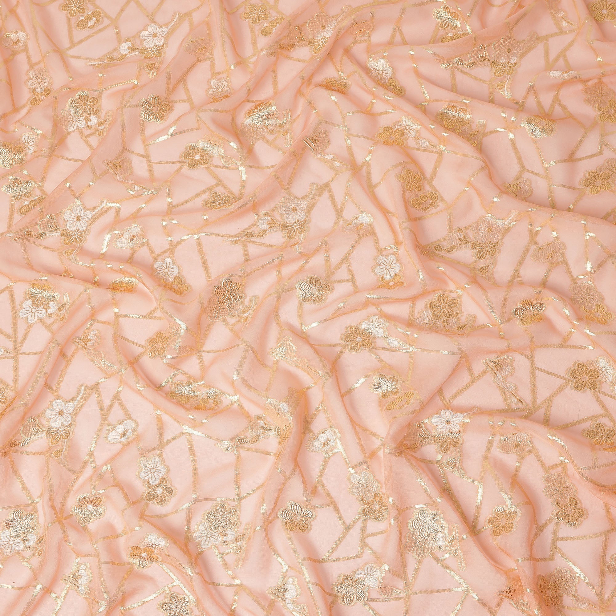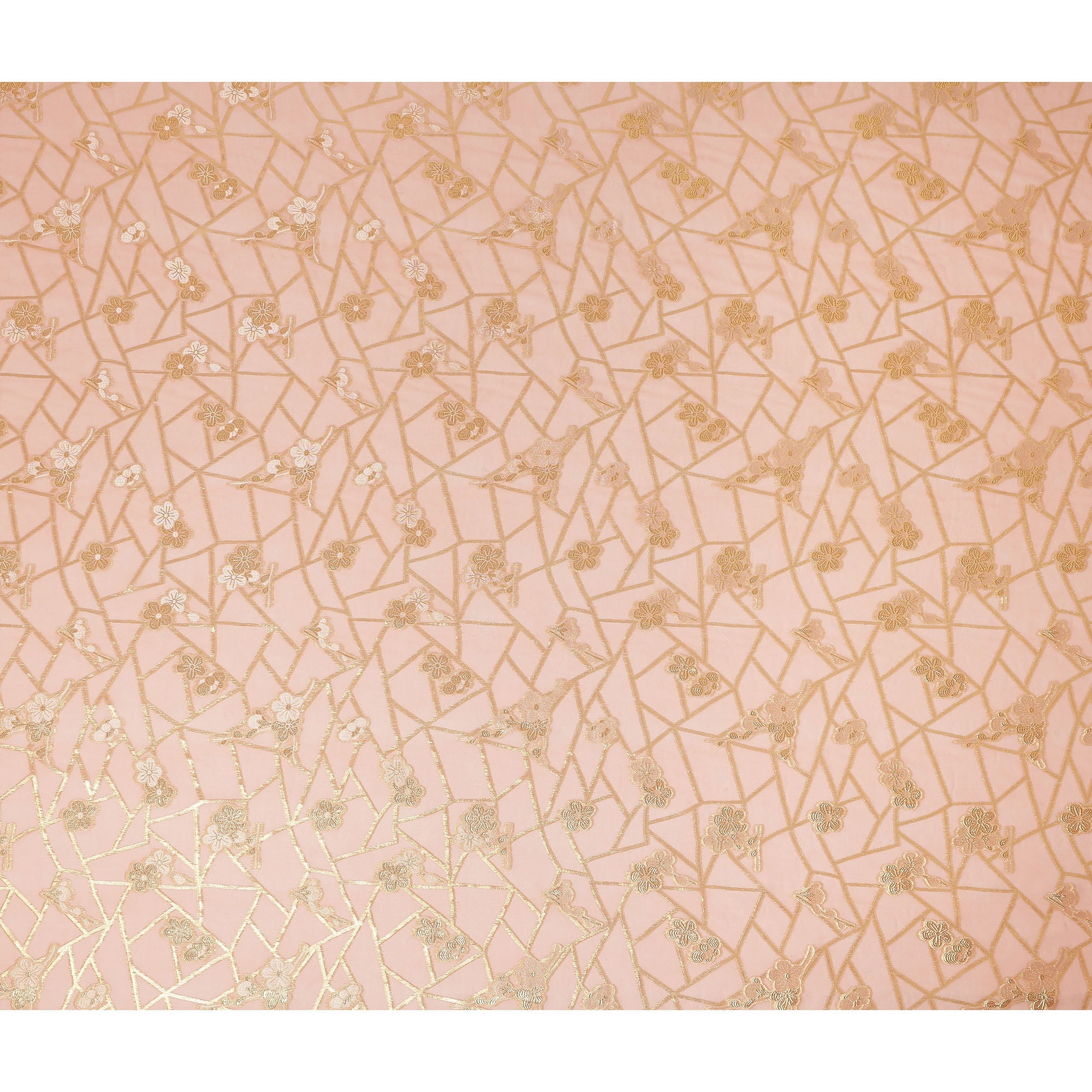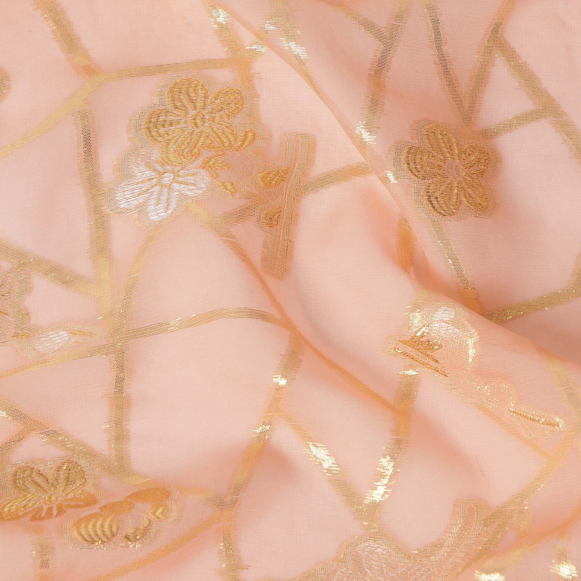 • Peach Blush Gold Floral Geometric Metallic Lurex Silk Chiffon Fabric 110 Cms Wide, Made in South Korea-D27545