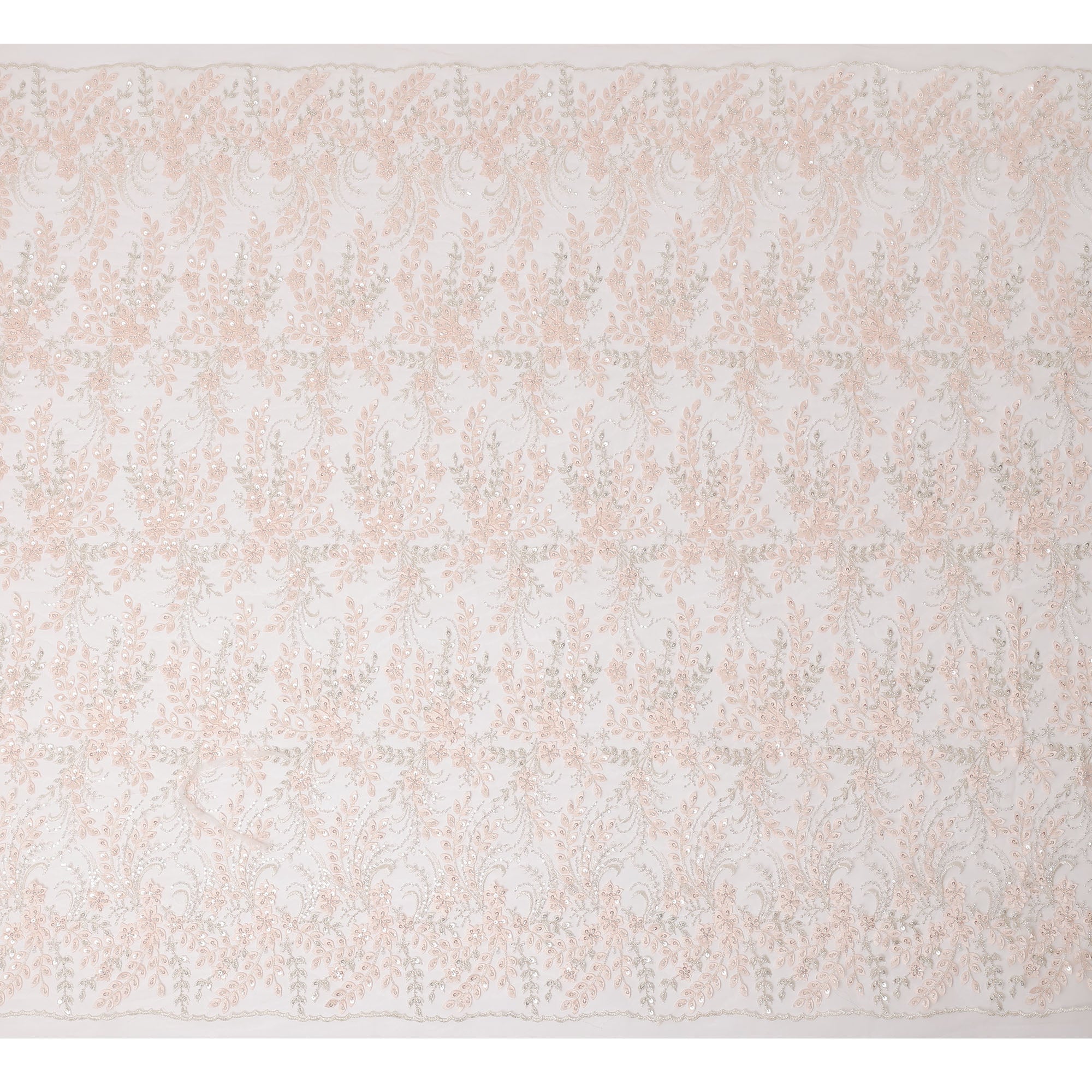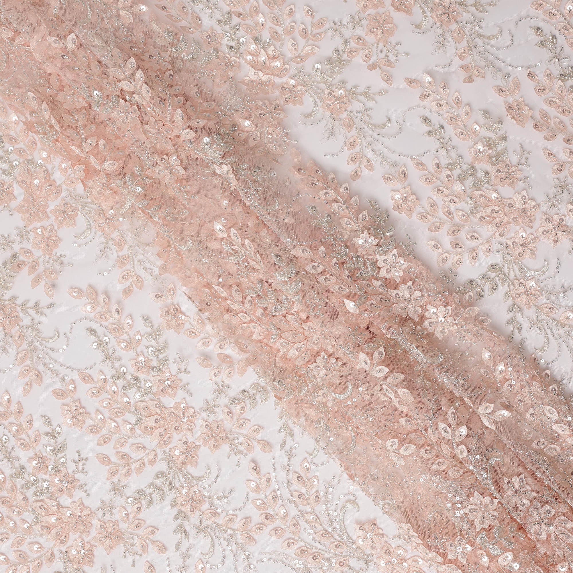Peach nylon tulle with detailed floral sequin and thread embroidery