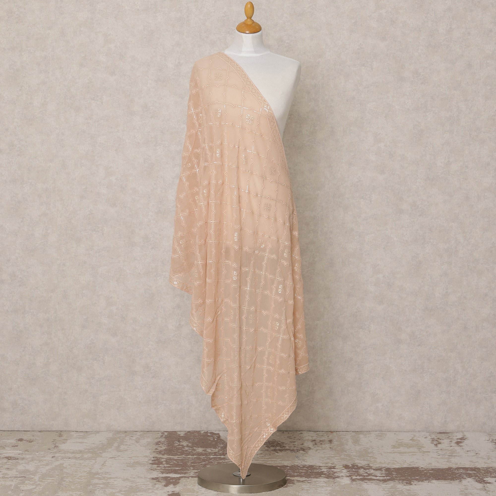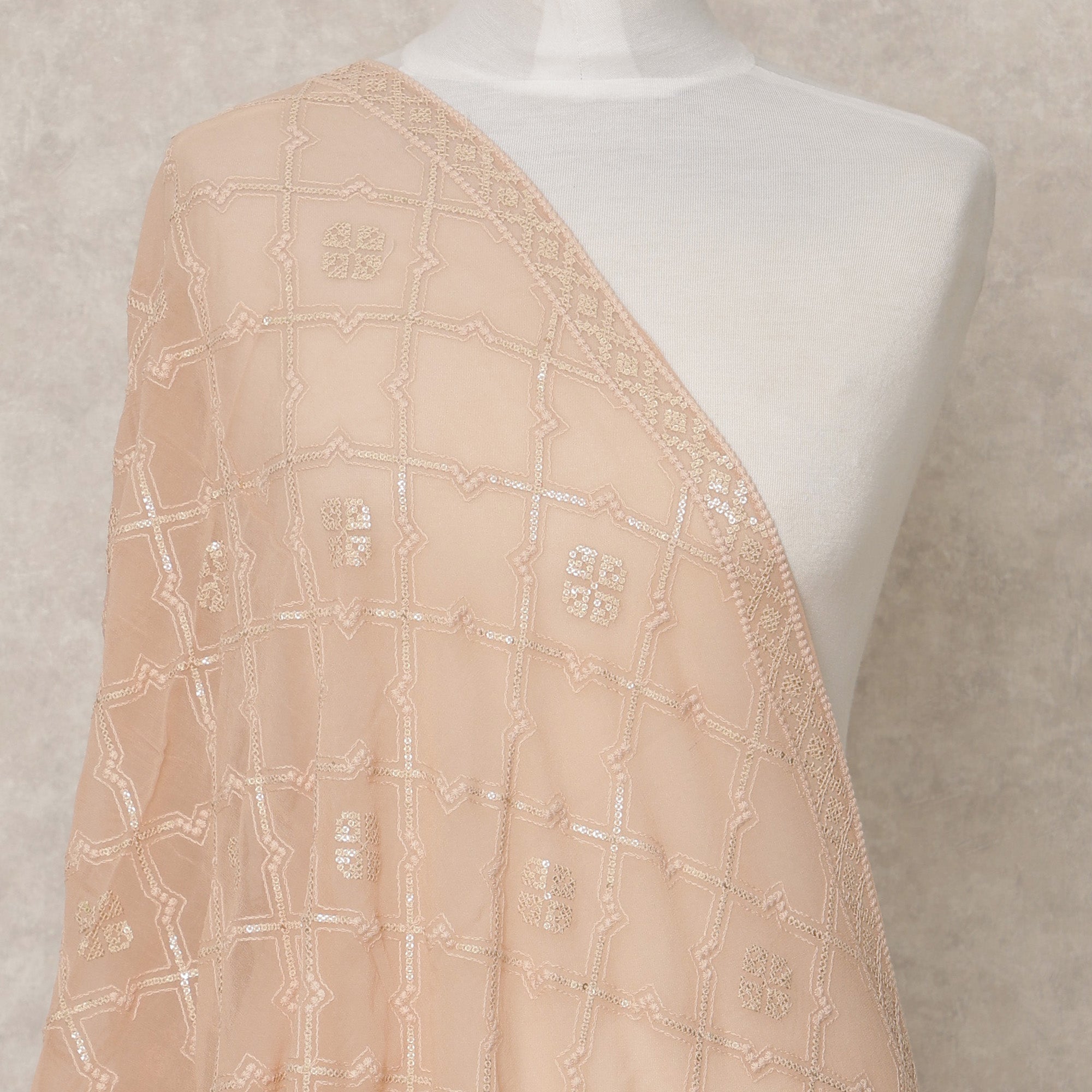 دوباتا جورجيت صناعي بلون الخوخ العاري مع تطريز شبكي زهري، 210 × 80 سم، صنع في الهند - D24101