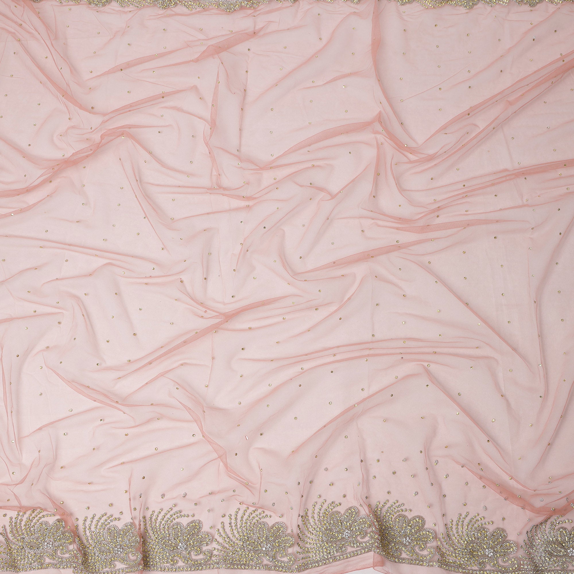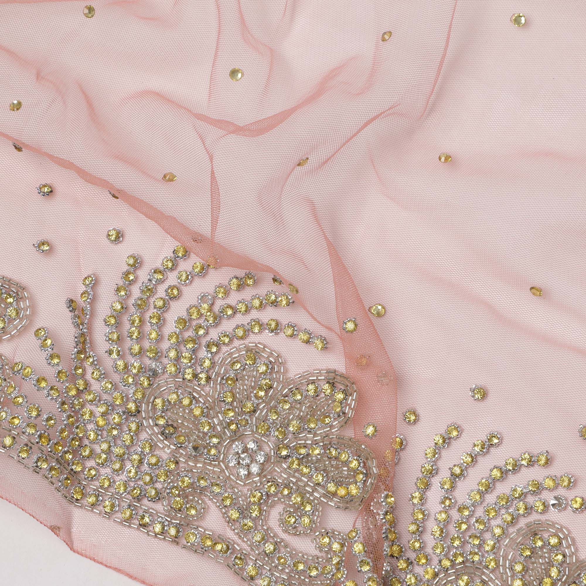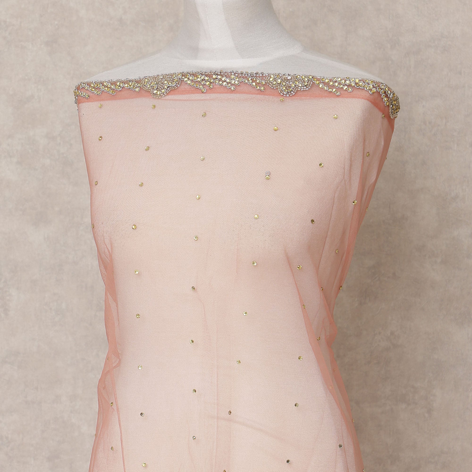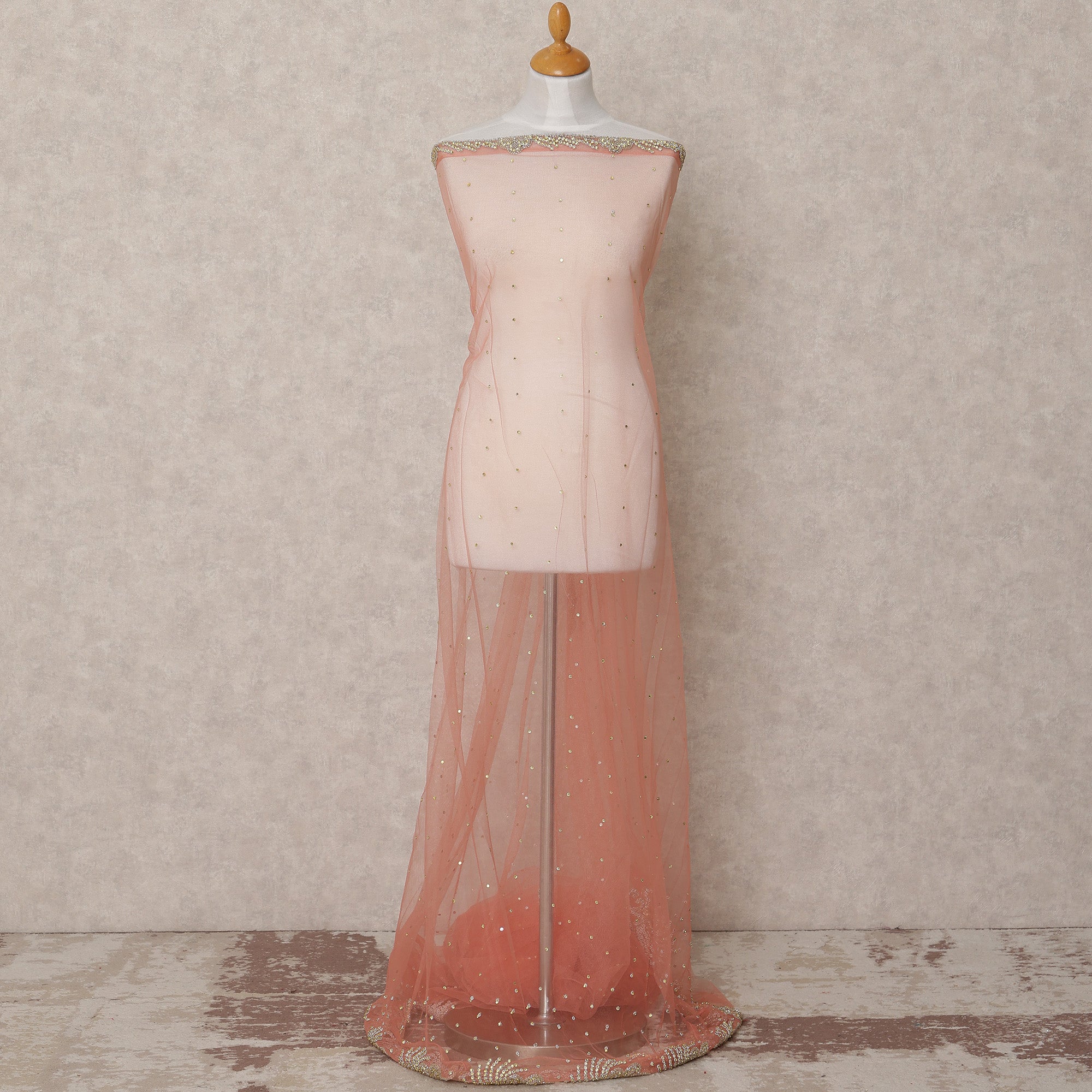 • قماش تول نايلون مطرز باللون الوردي الخوخي مع تطريزات ذهبية متناثرة وحواف زهرية من الخرز، عرض 140 سم، صنع في الهند - D23496