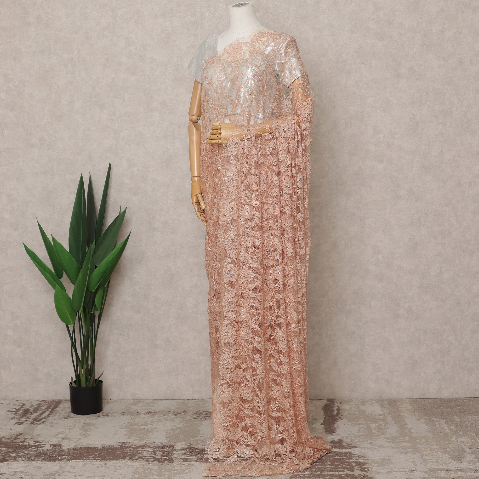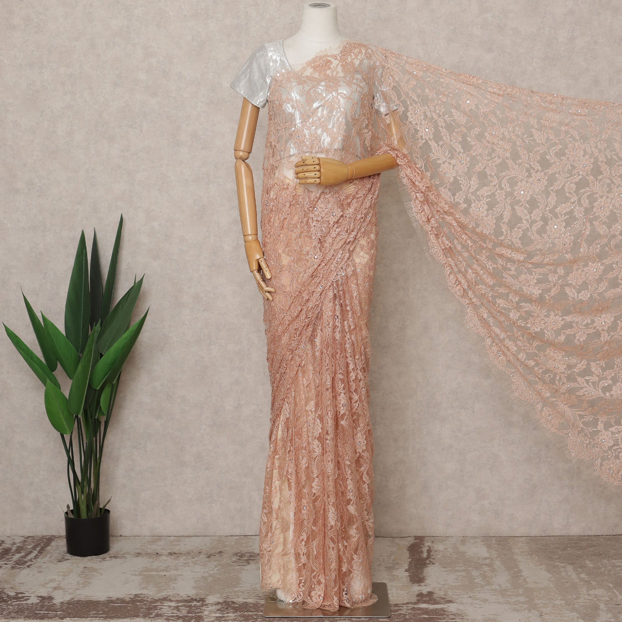 ساري فرنسي فاخر من الدانتيل الشانتيلي باللون الخوخي الناعم مع لمعان خفيف بلونين