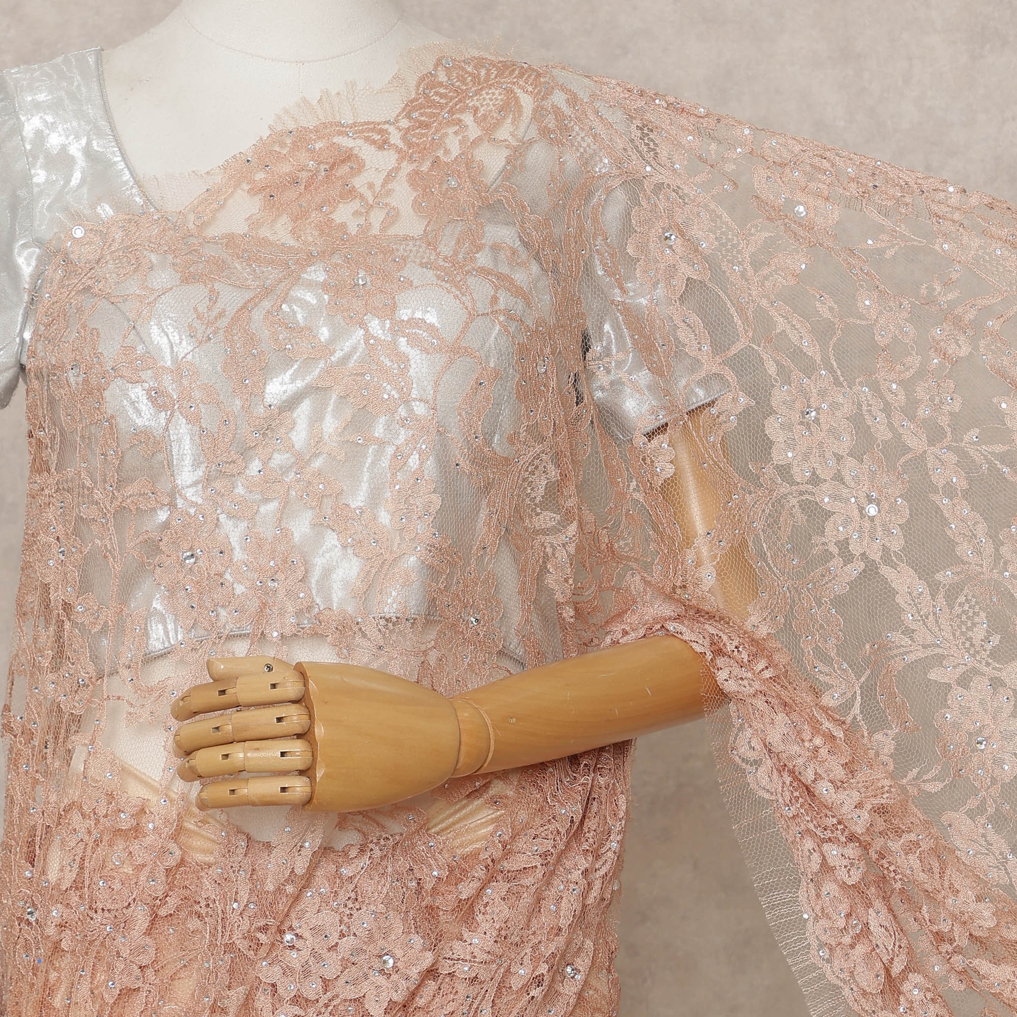 ساري فرنسي فاخر بلون الخوخ، من الدانتيل الشانتيلي ثنائي اللون، مع تطريز حجري، عرض 110 سم، 5.5 متر، فرنسا - D25564